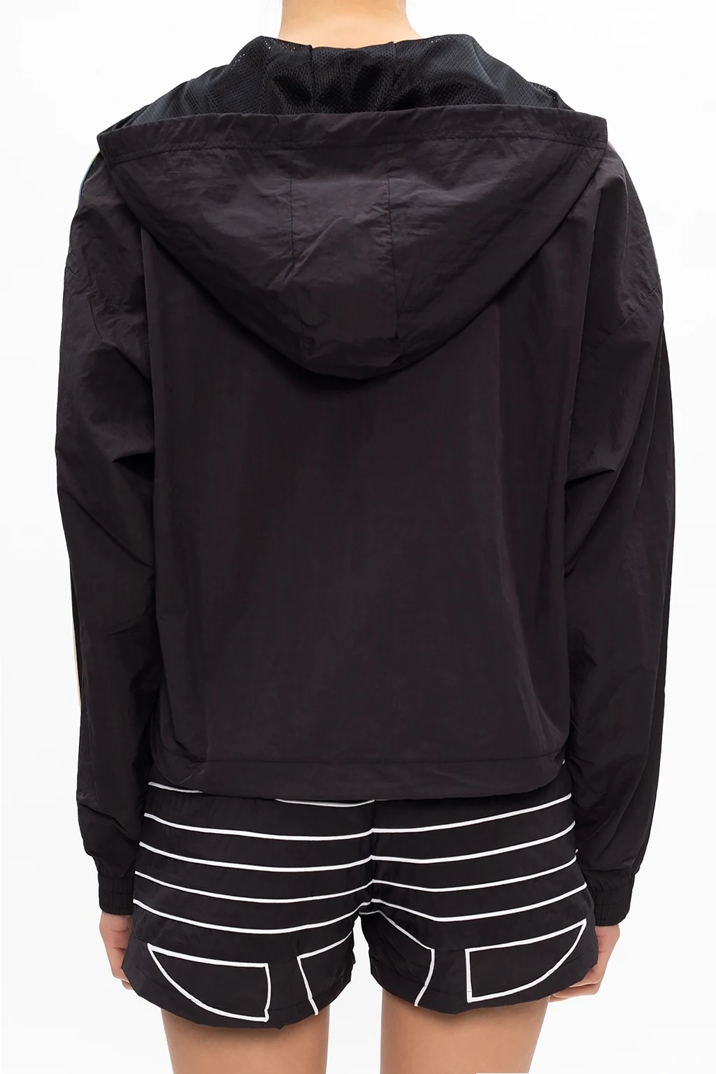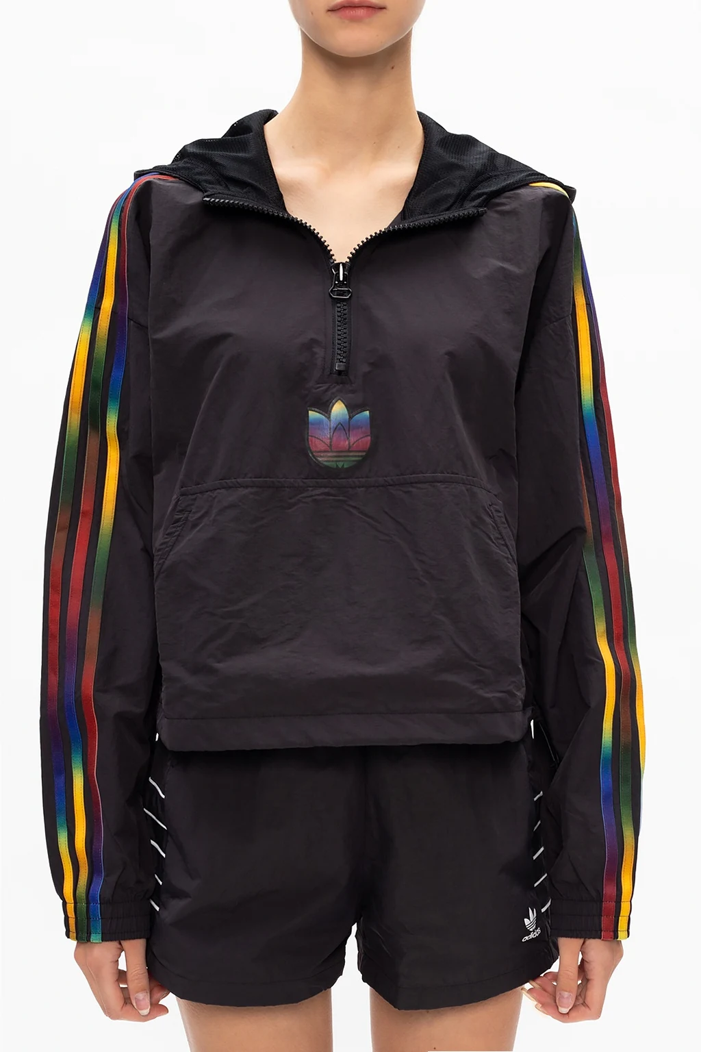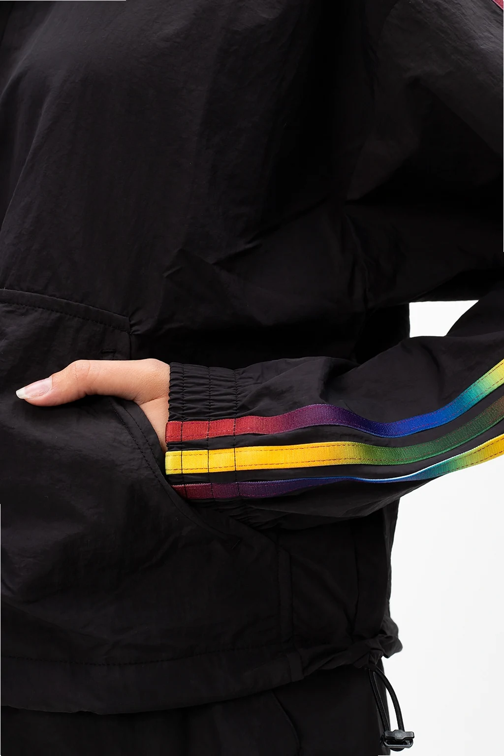 Czarna, ortalionowa bluza ADIDAS Originals. Zapinana na zamek. Ozdobiona trzema kolorowymi, charakterystycznymi dla marki paskami oraz nadrukowanym logo. Z przodu wsuwana kieszeń. Rękawy zakończone ściągaczami. Dół ściągany trokami.