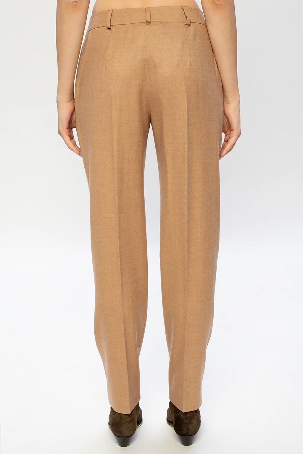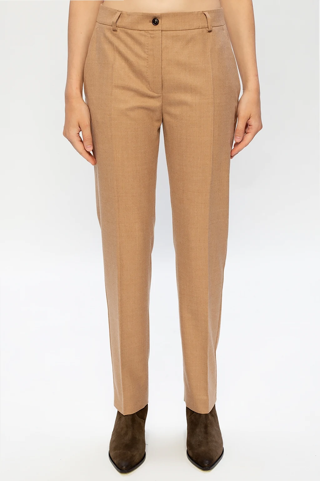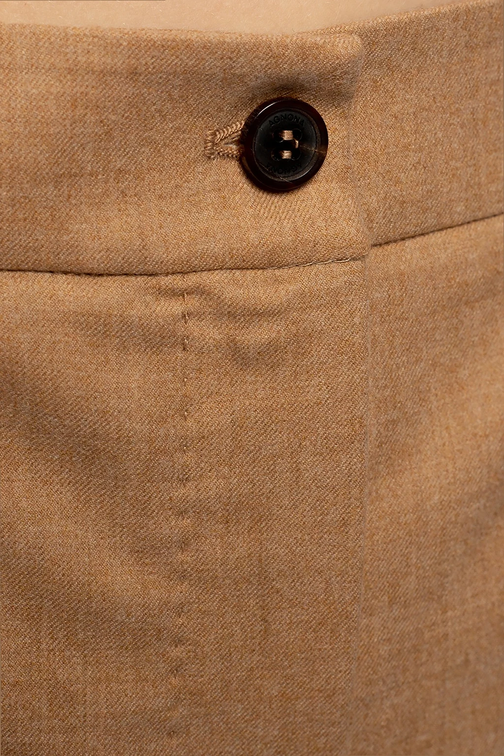 Beżowe spodnie Agnona. Wykonane z wełny. Zapinane na zamek oraz guzik. Dwie wsuwane kieszenie. Szerokie, proste nogawki.