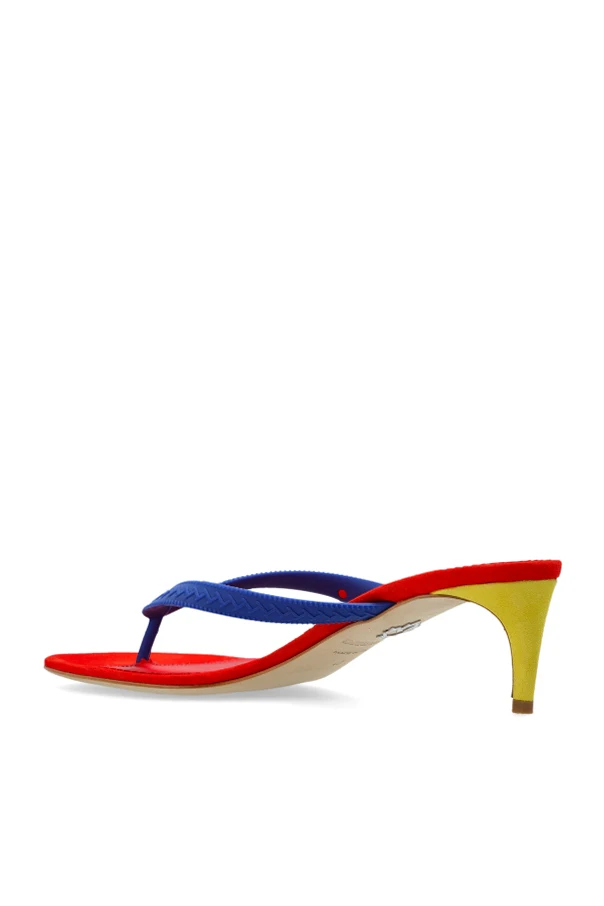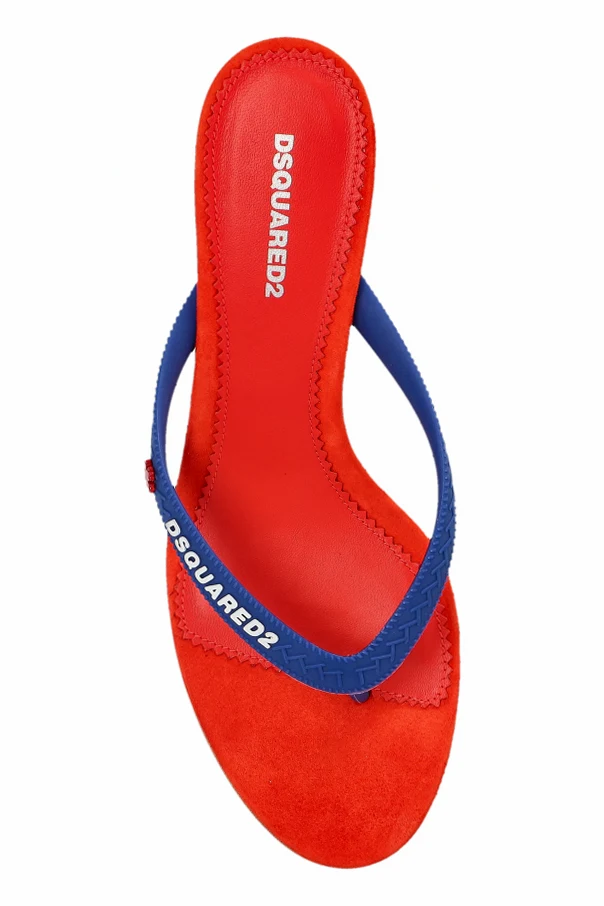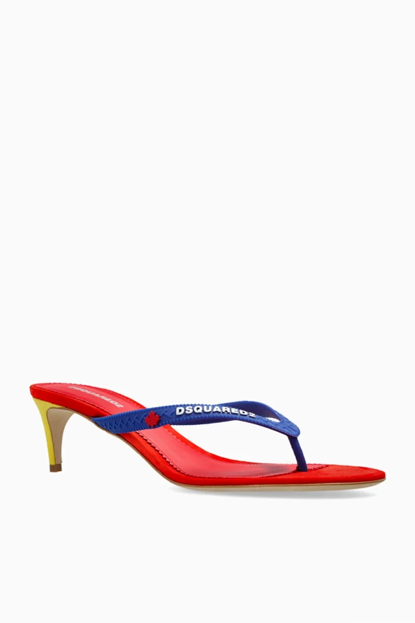 Klapki na obcasie z logo marki Dsquared2 to ponadczasowe połączenie artystycznej odwagi z dyskretną subtelnością. Model oszałamia wielobarwną kompozycją: intensywna czerwień podeszwy kontrastuje z niebieskimi, V-kształtnymi paskami oraz żółtym obcasem o kocim wdzięku. Nietuzinkowa, multikolorowa paleta podkreśla niezwykłość i wyjątkowy charakter produktu.