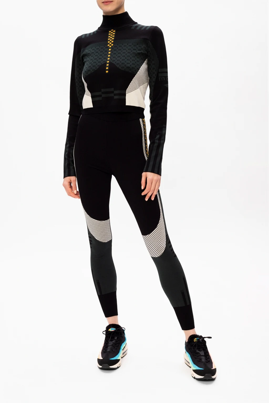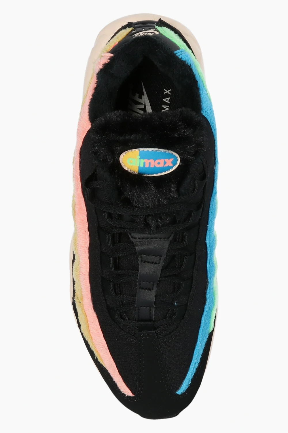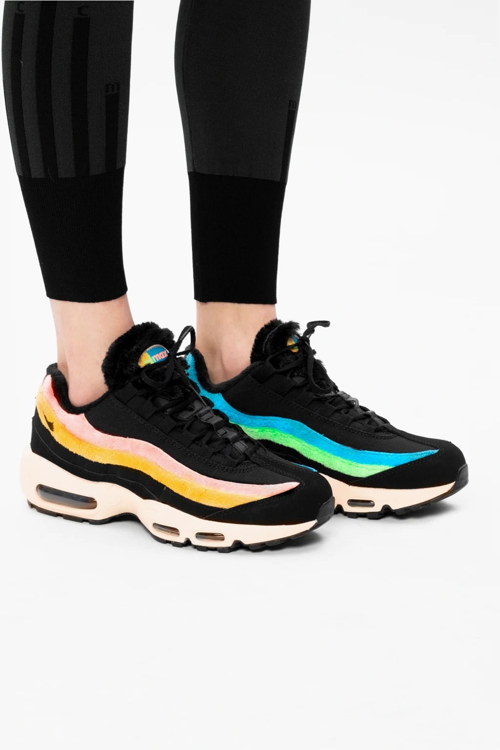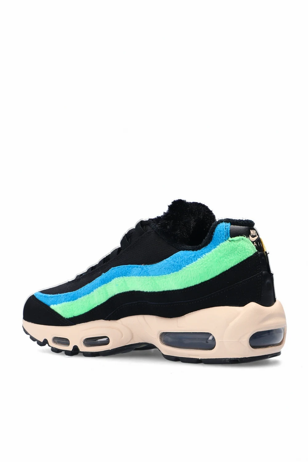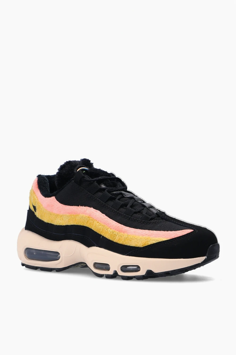 Czarne, sznurowane buty sportowe, model 'Air Max 95 Premium' Nike. Wykończone syntetycznym włosiem. Charakterystyczny dla modelu wzór inspirowany ludzką anatomią. Podeszwa środkowa symbolizuje kręgosłup, stopniowe wstawki to mięśnie, sznurowadła imitują żebra, a materiał na cholewce – skórę. Wytłoczone logo w kolorze czarnym. Lekki system amortyzacji z poduszkami gazowymi 'Max Air' chroni przed wstrząsami. Czarno-biała, gumowa podeszwa z transparentną wstawką. Inspirowane kultowym modelem z 1995 roku oraz promieniami rentgenowskimi.