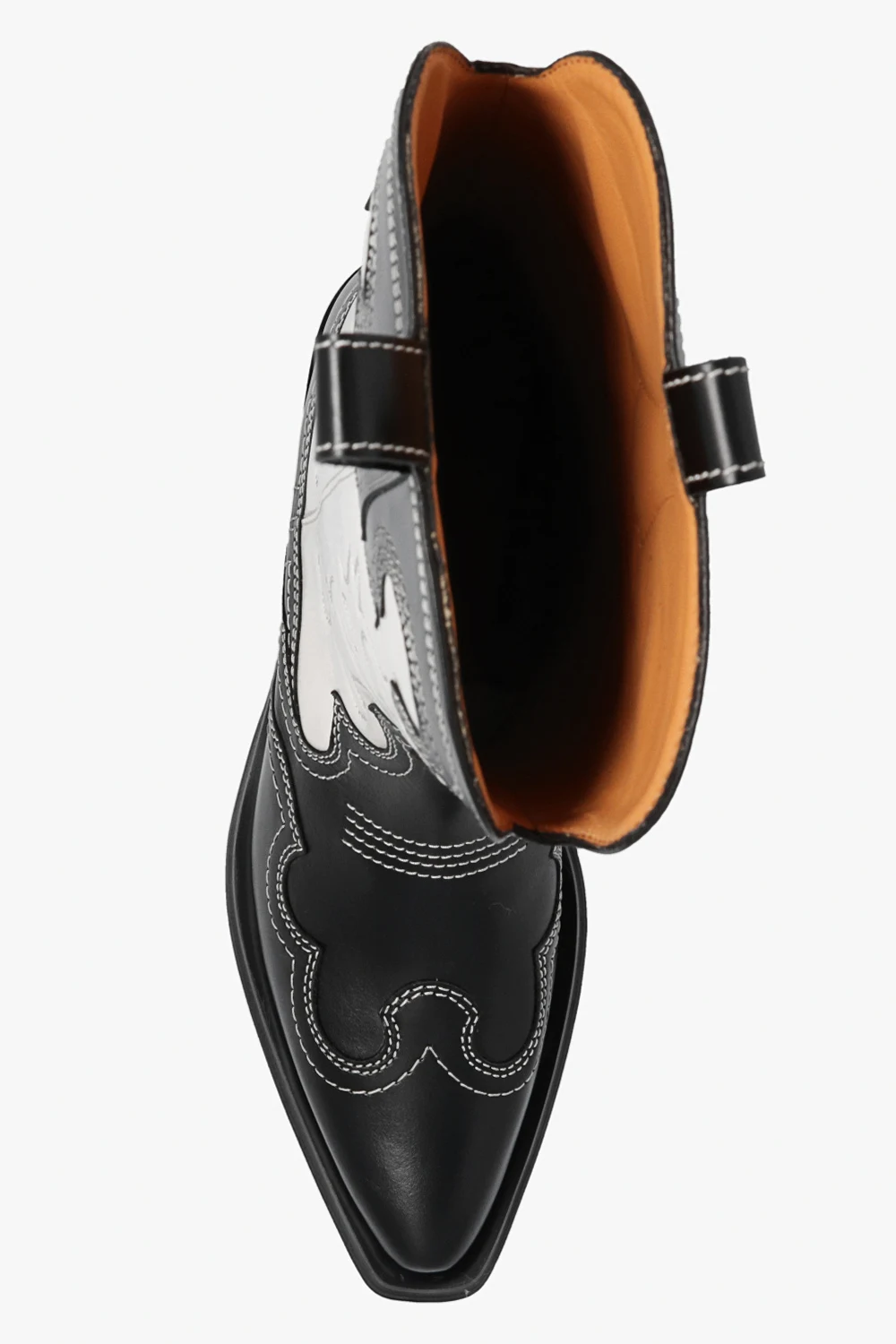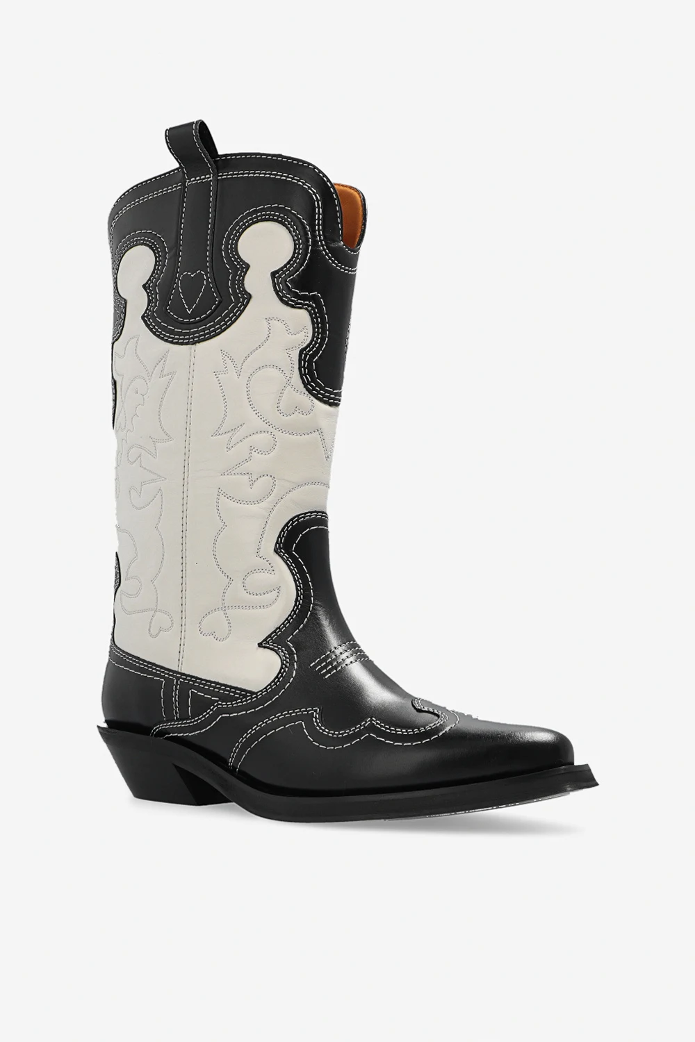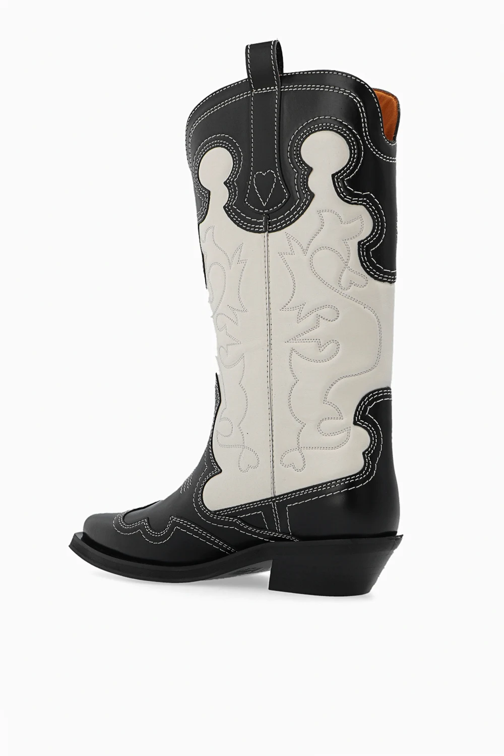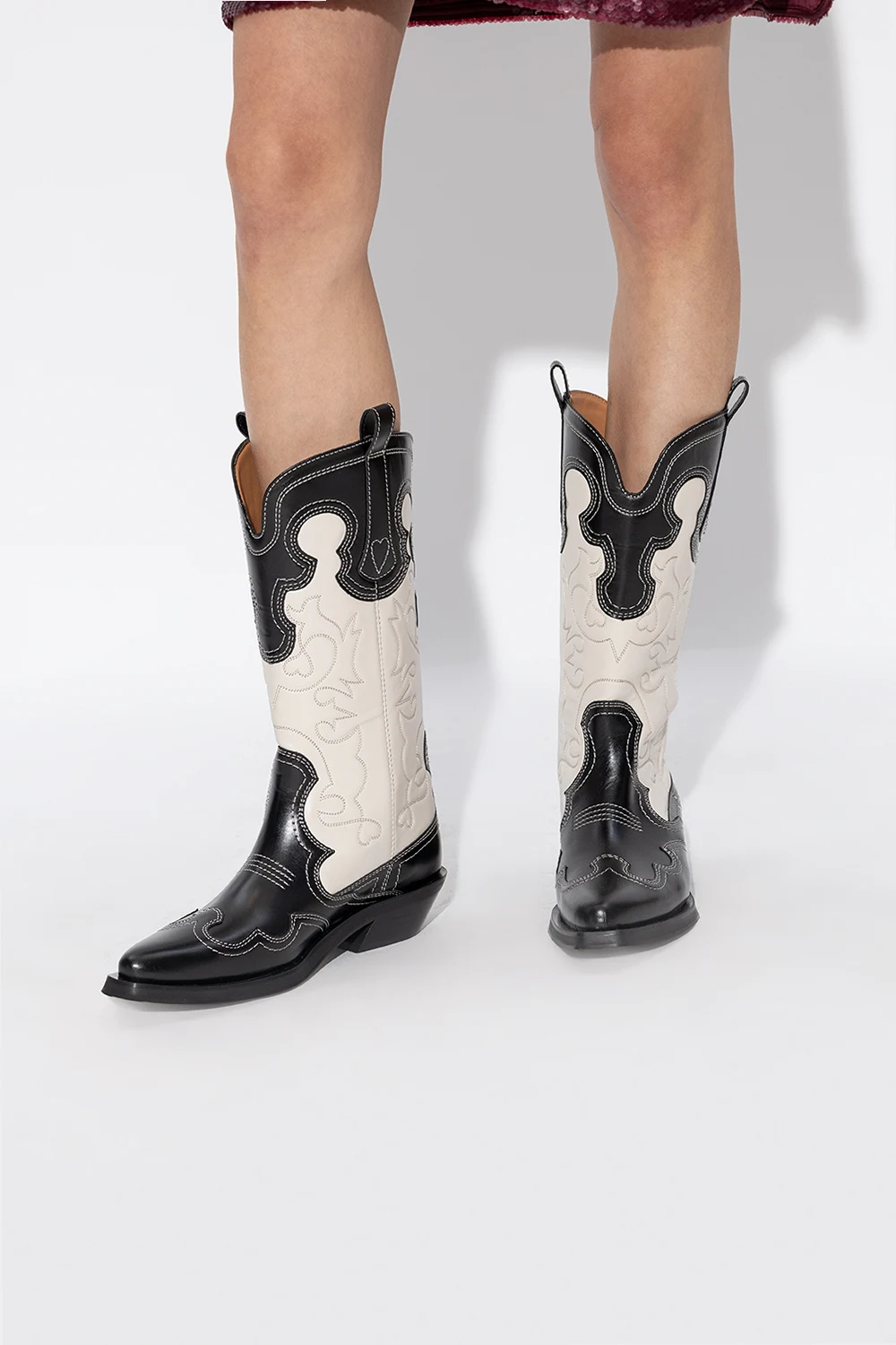 Czarno-białe, wsuwane kowbojki Ganni. Wykonane ze skóry. Cholewka ozdobiona wyszytym kremową nicią wzorem. Zwężany nosek. Czarna, gumowa podeszwa.