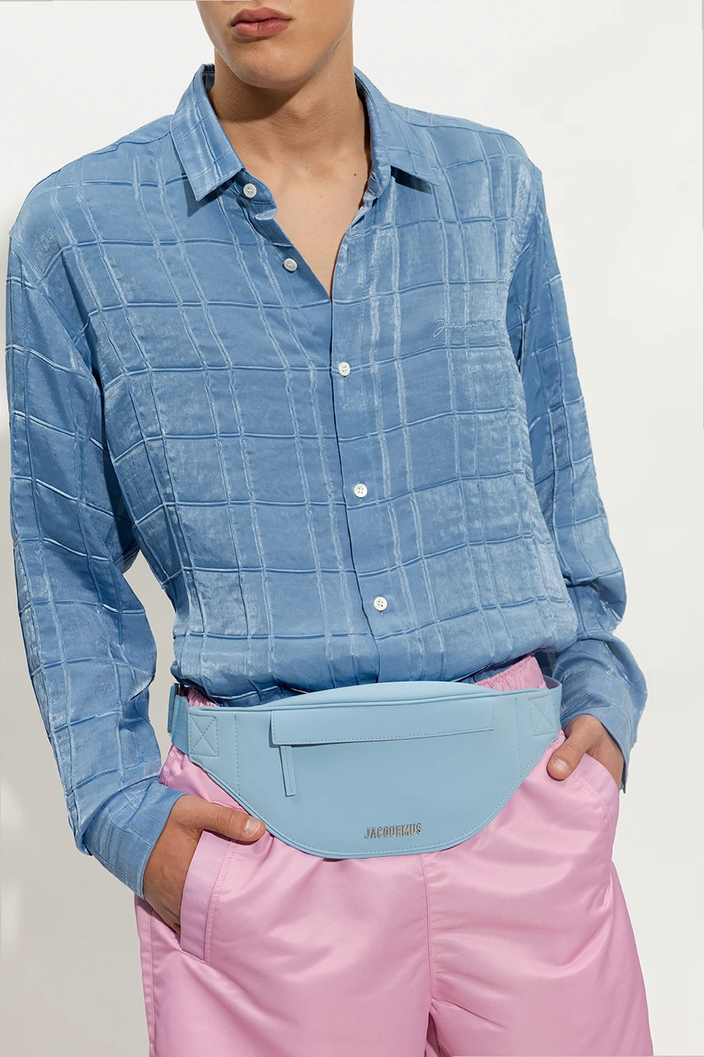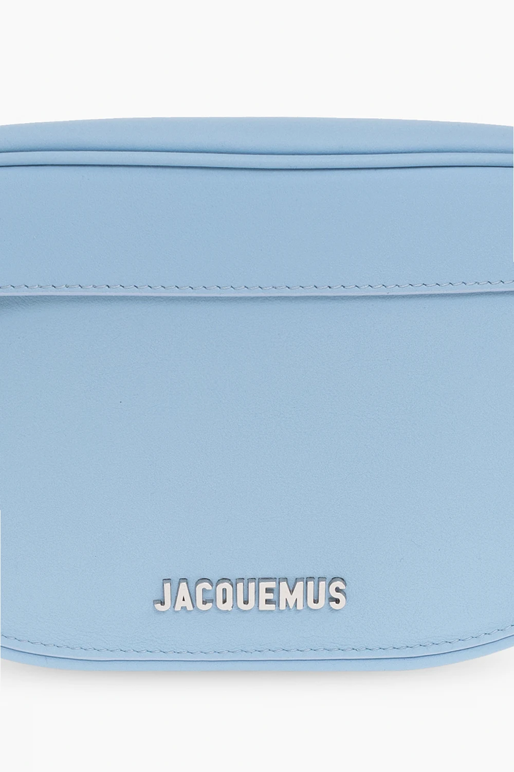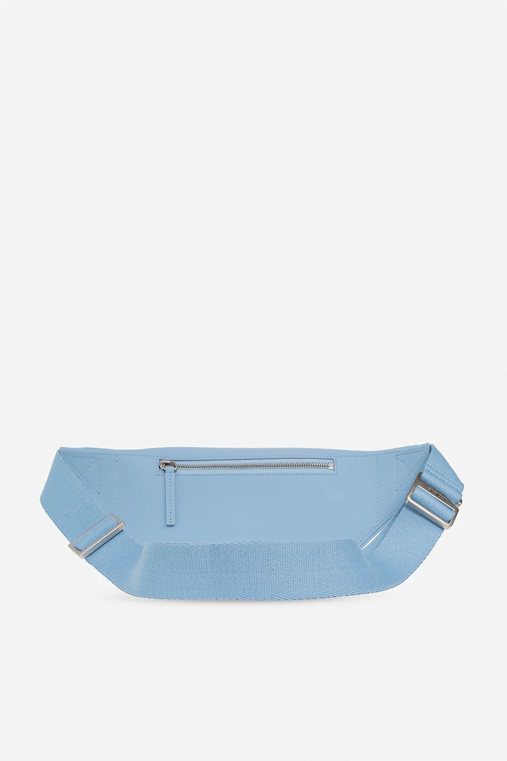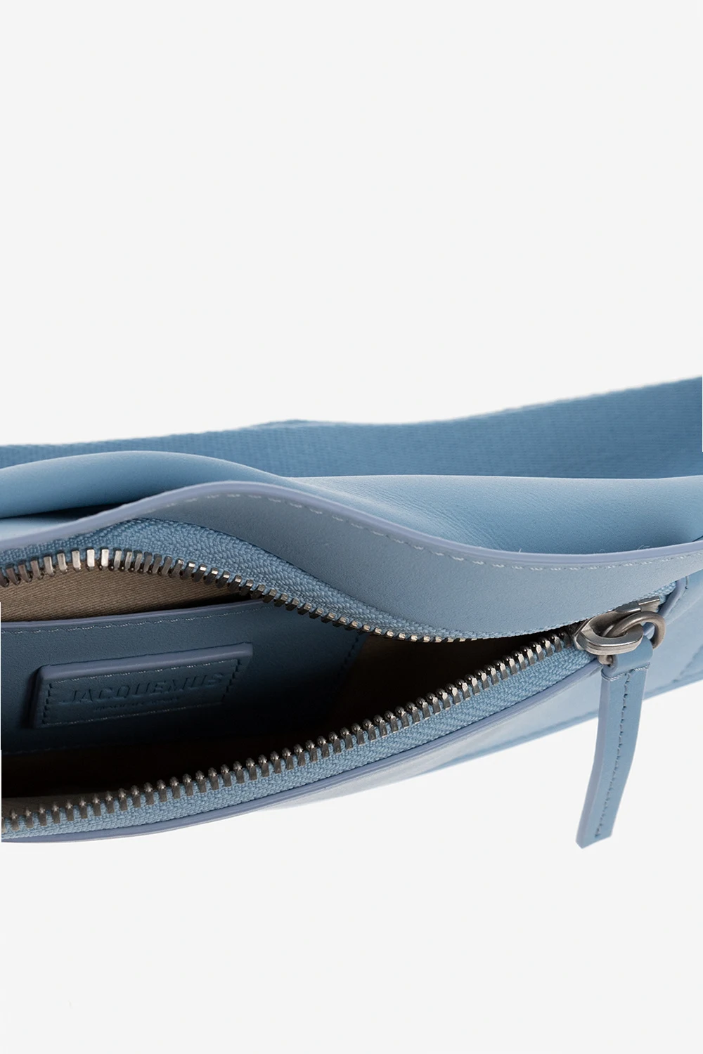 Jasnoniebieska torba na pas model ‘La Banane Meunier’ Jacquemus. Wykonana ze skóry. Zamykana na zamek. Z przodu ozdobiona aplikacją w kształcie logo w kolorze srebrnym. Z tyłu kieszeń zamykana na zamek. Pas z możliwością regulacji długości. Wewnątrz komora z miejscem na kartę.