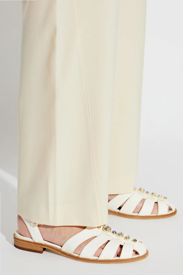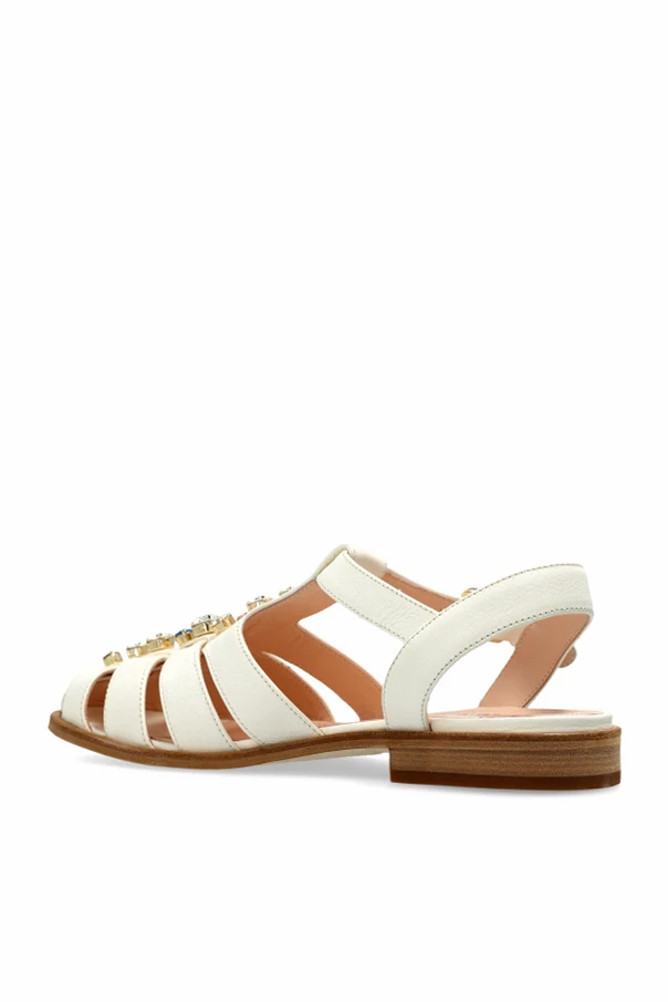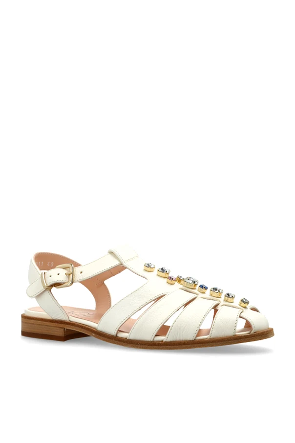 Kremowa skóra naturalna, precyzyjnie wykończona i aksamitna w dotyku, podkreśla ekskluzywny charakter obuwia. Poziome i lekko skośne paski stabilnie oplatają stopę, a centralny pasek zdobią duże, połyskujące kamienie w pastelowych odcieniach, dodając całości niepowtarzalnego, zmysłowego blasku.