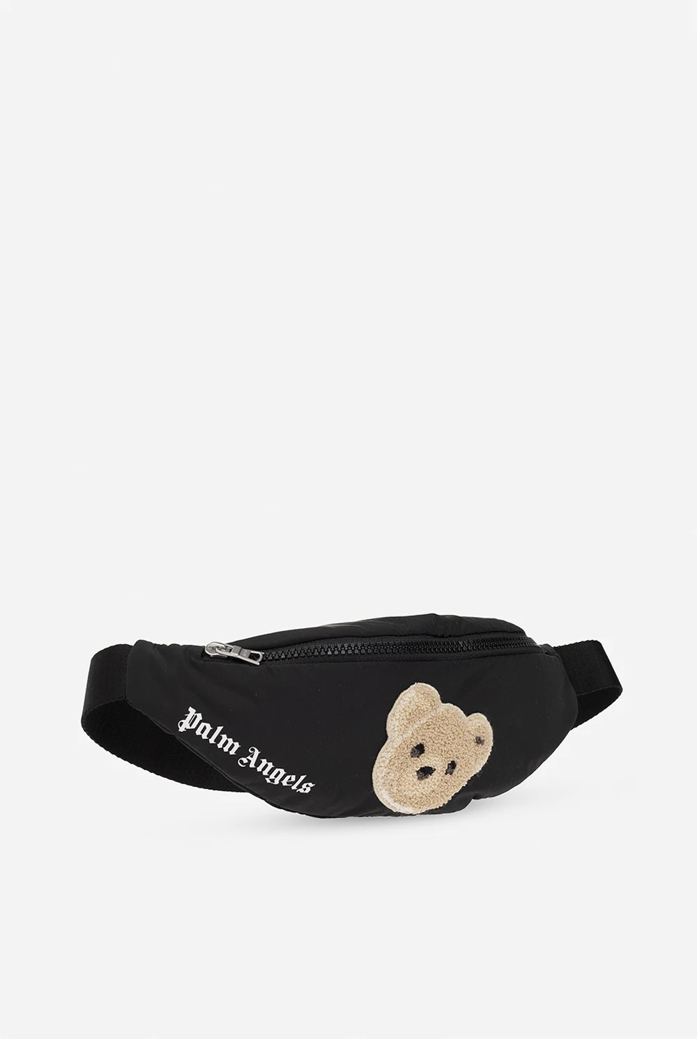Czarna torba na pas Palm Angels Kids. Zapinana na zamek. Ozdobiona futrzanym wzorem w kształcie misia oraz nadrukiem z logo. Pas biodrowy z możliwością regulacji długości. Wewnątrz komora. Metalowe wykończenie w kolorze srebrnym.