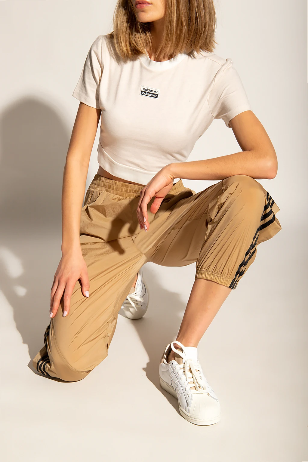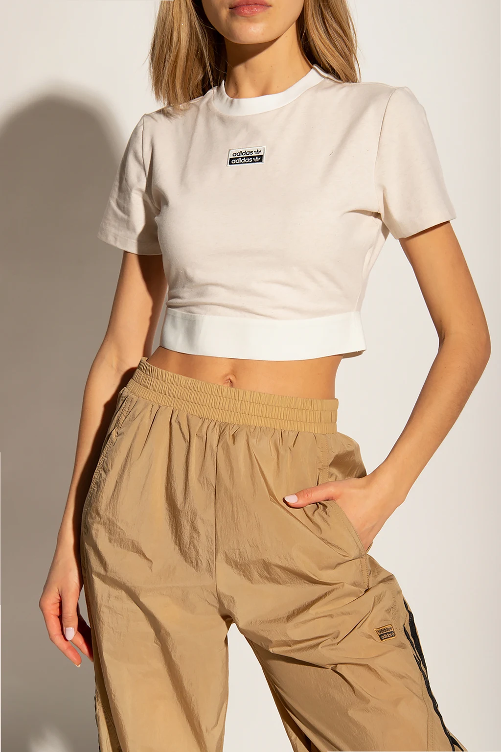 Beżowy, krótki t-shirt ADIDAS Originals. Wykonany z bawełny. Czarno-biała naszywka z logo. Okrągły dekolt. U dołu wszyta guma.