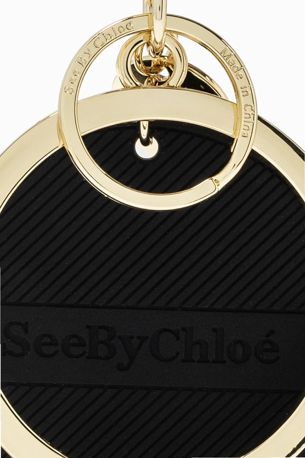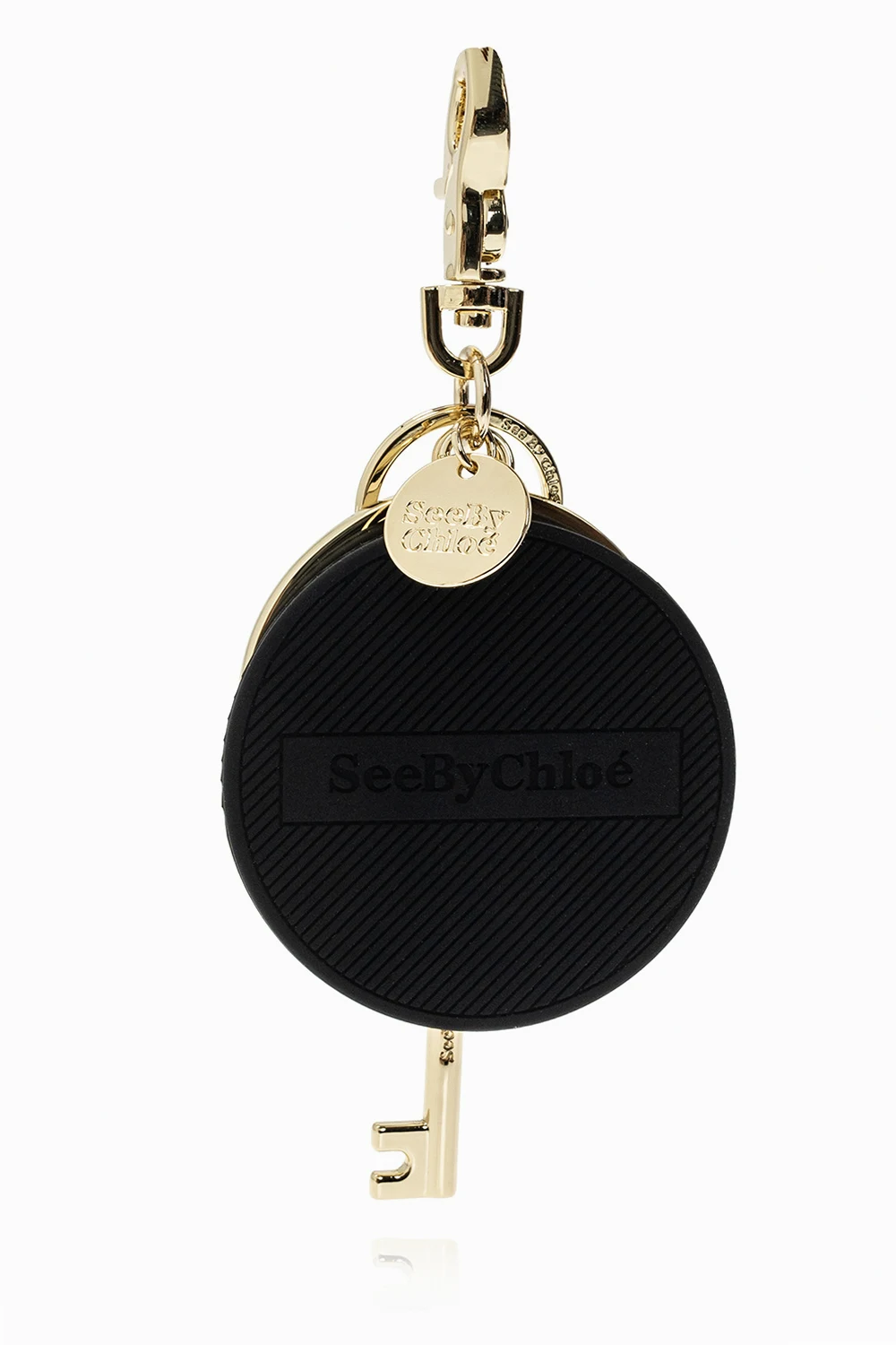 Brelok w kolorze złotym See by Chloé. Ozdobiony czarną aplikacją z wytłoczonym wzorem z logo.