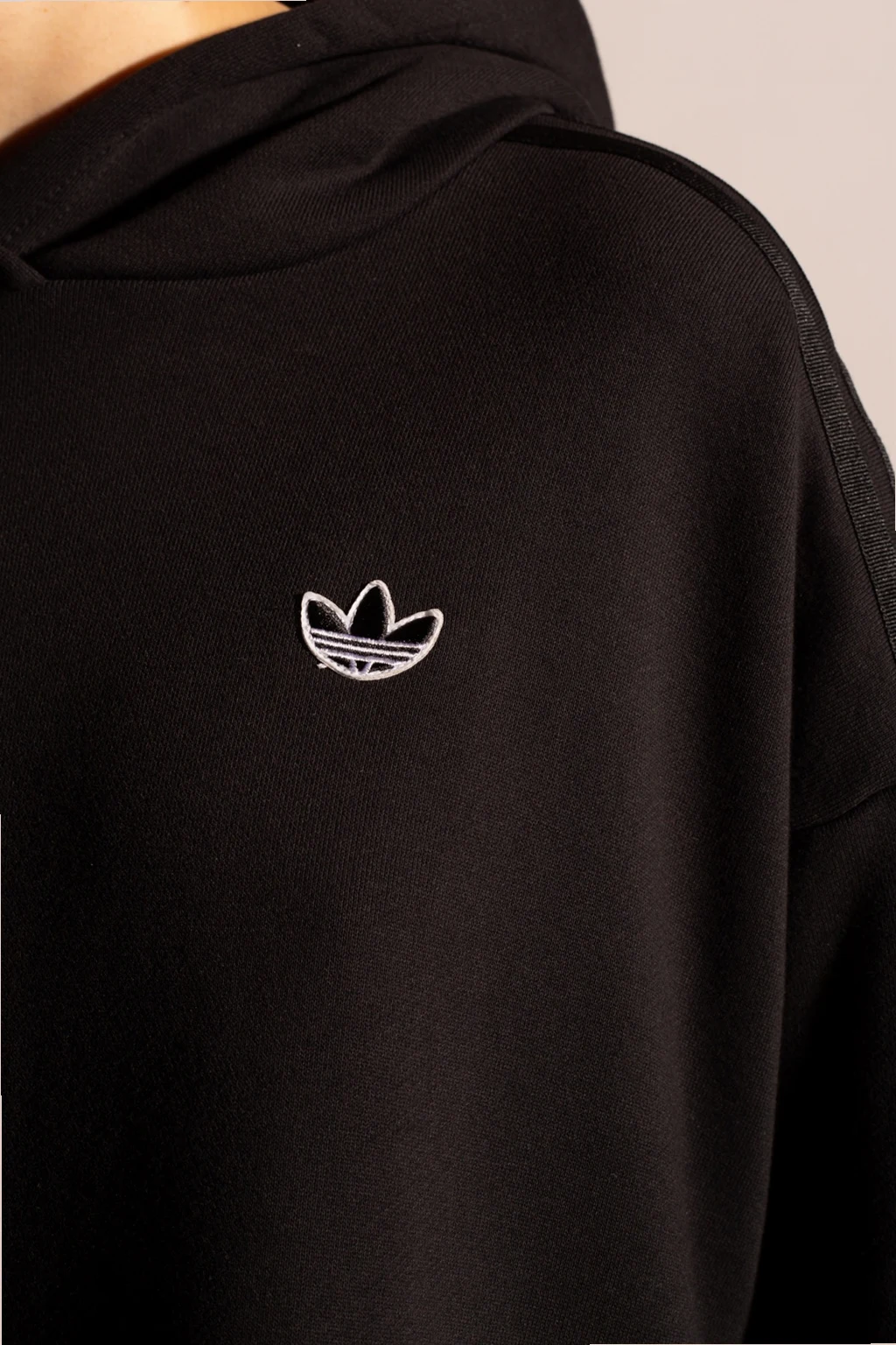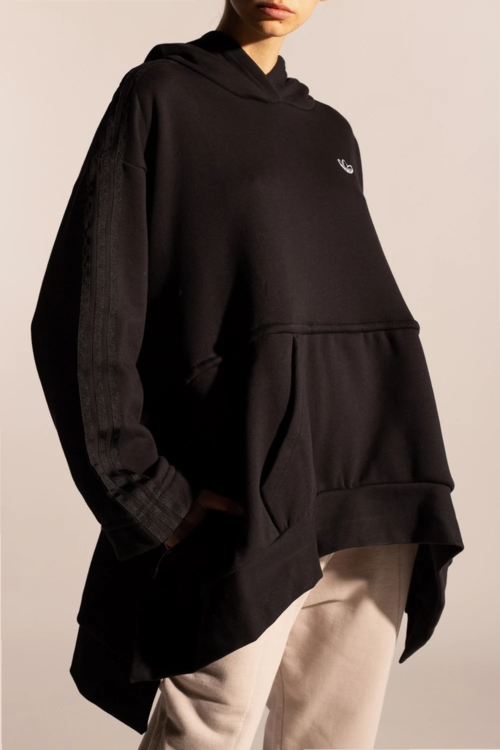 Czarna, bawełniana bluza z kapturem ADIDAS Originals. Ozdobiona naszytym logo, rozcięciami oraz charakterystycznymi dla marki trzema paskami. Z przodu wsuwana kieszeń. Po bokach ściągana trokami.