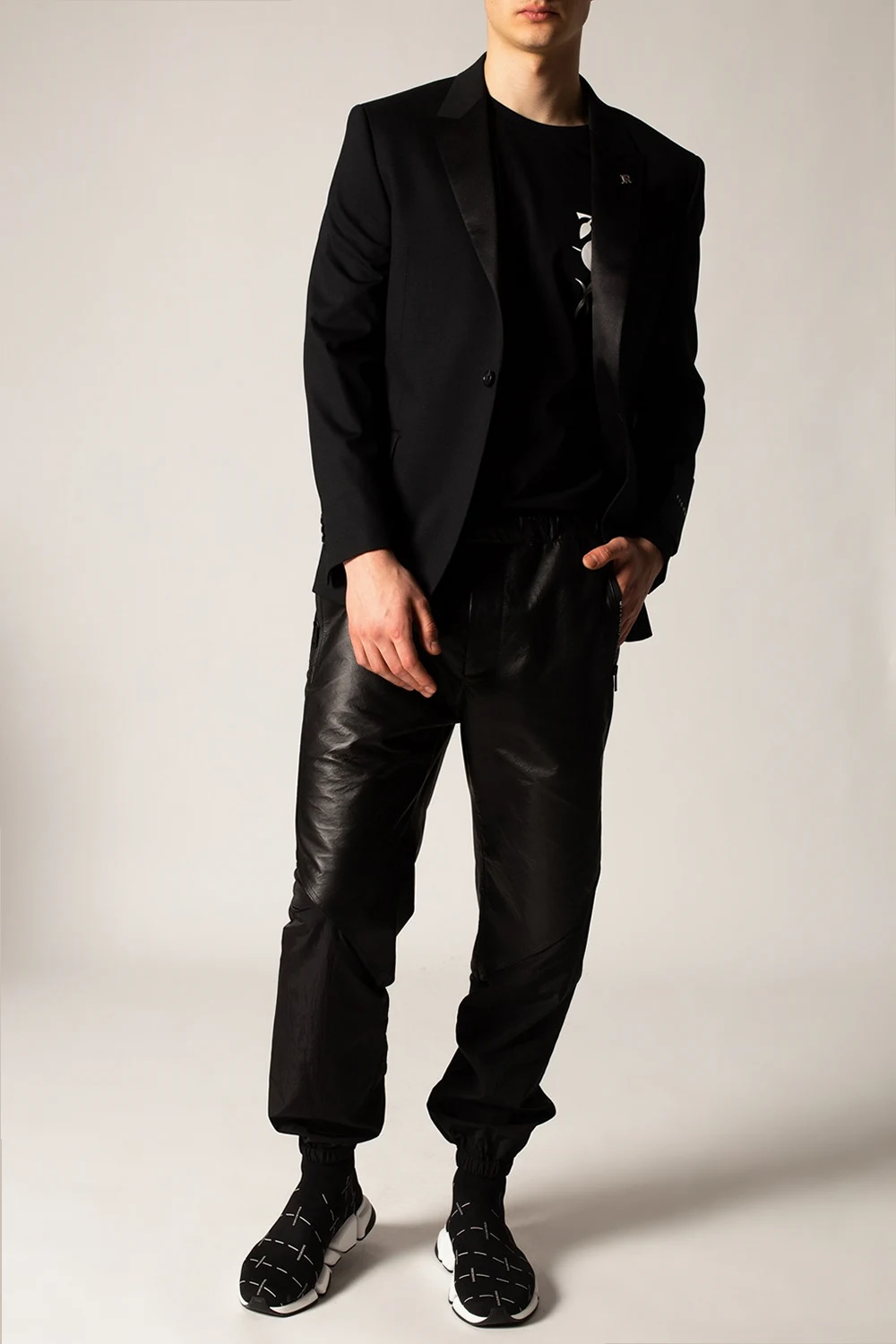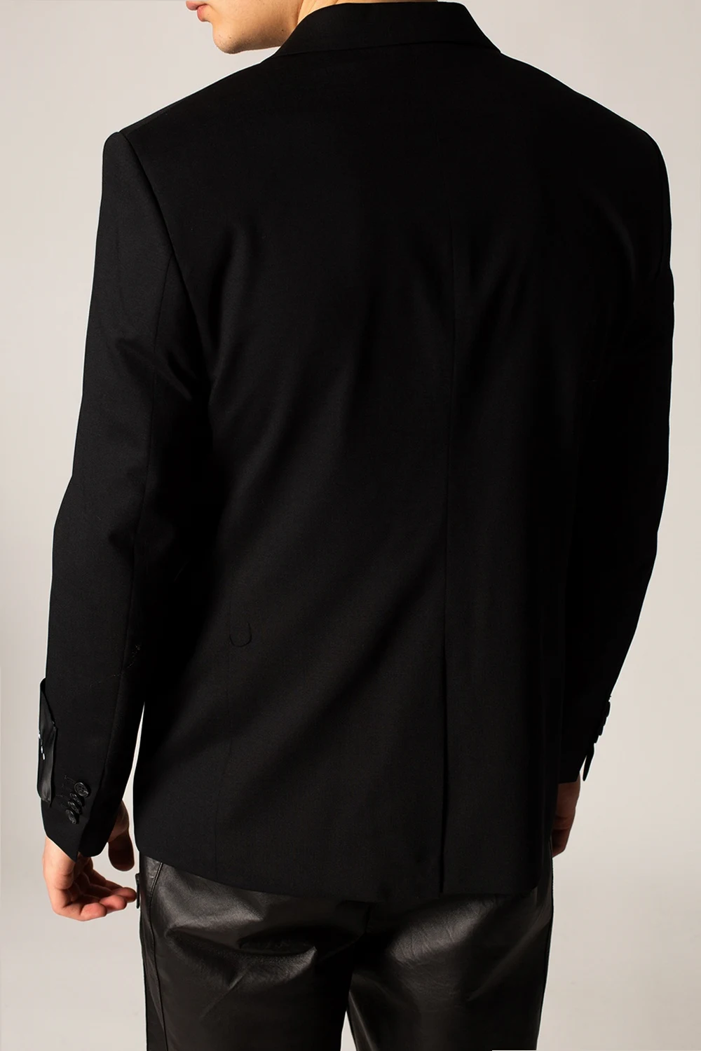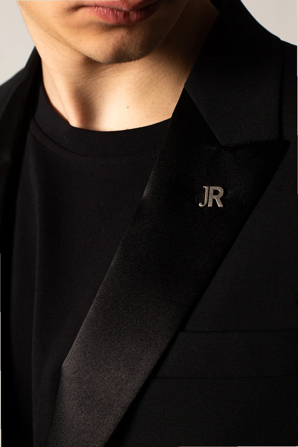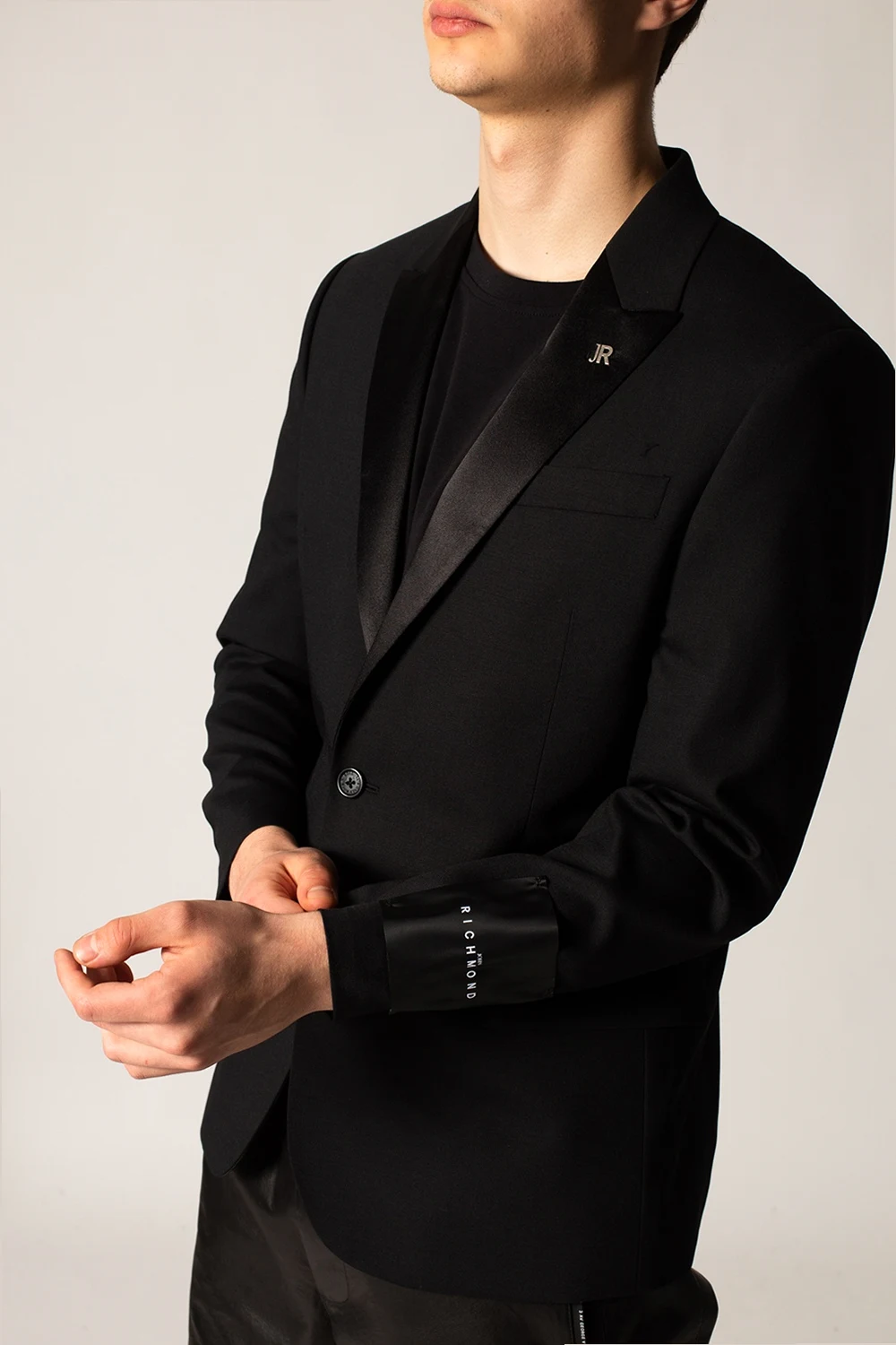 Czarna marynarka John Richmond. Wykonana z wełny. Zapinana na pojedynczy guzik. Zamknięte klapy z metalową aplikacją z logo w kolorze postarzanego srebra. Trzy wsuwane kieszenie. Naszywka na rękawie.