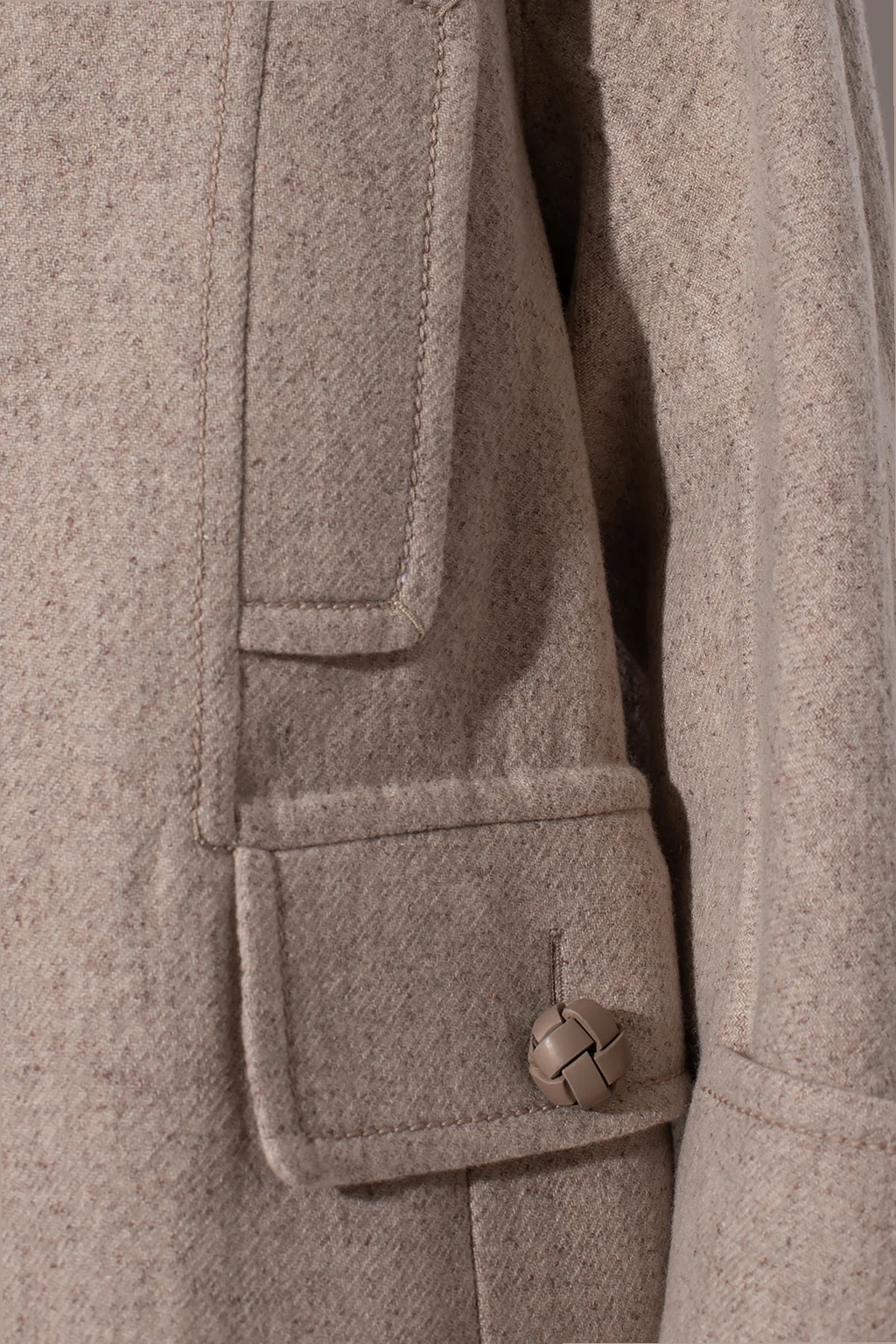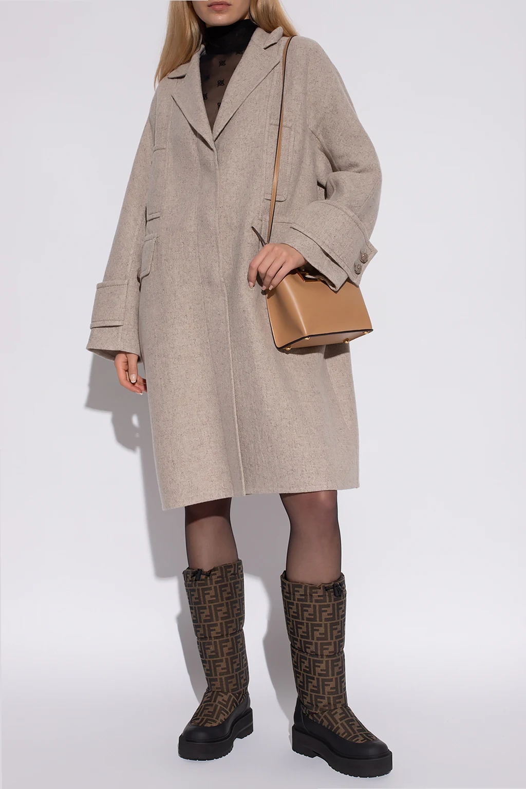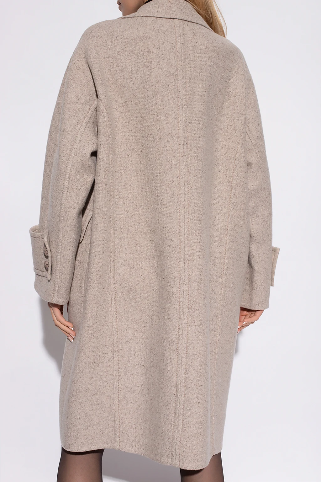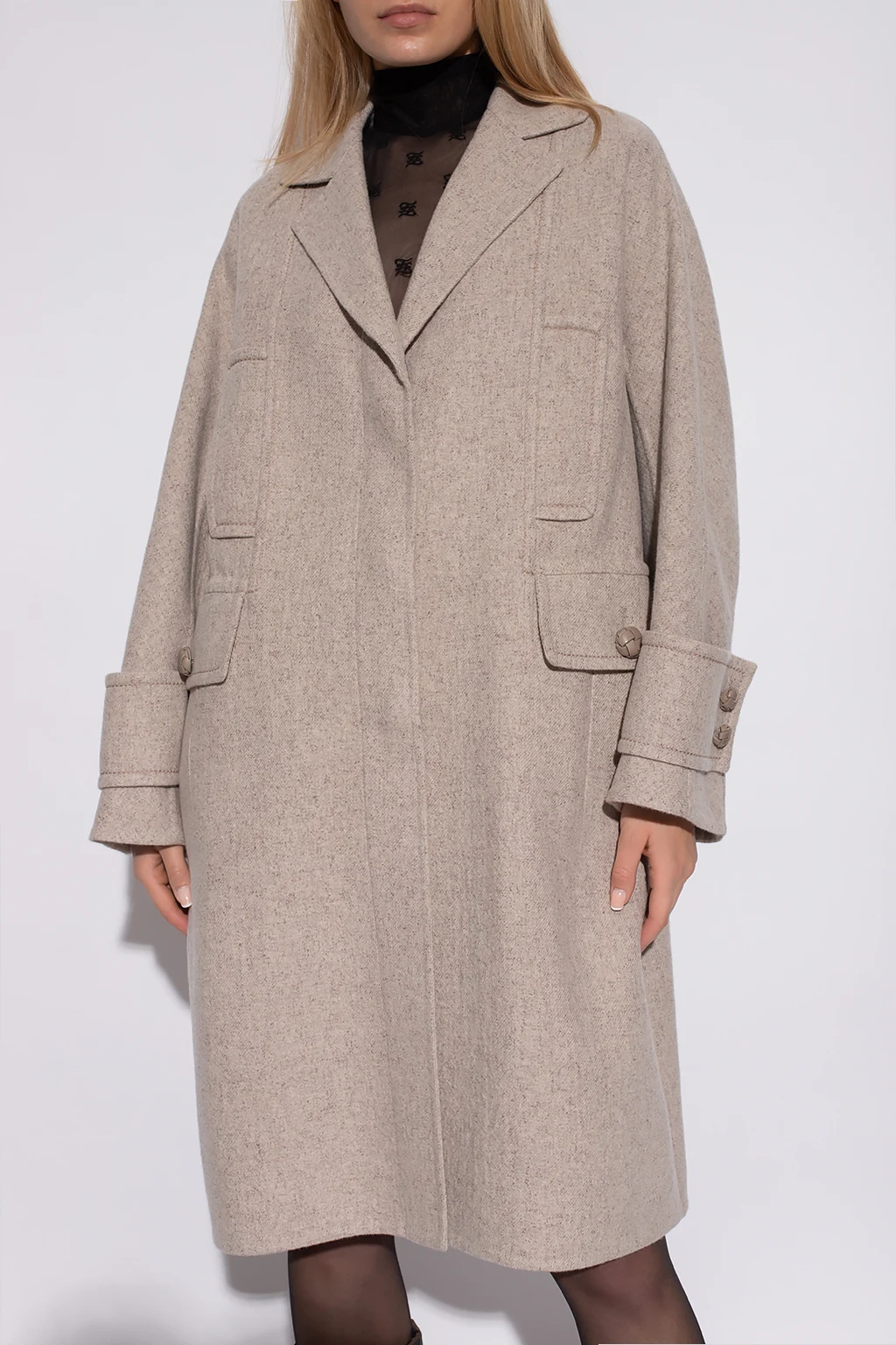Beżowy płaszcz z otwartymi klapami Agnona. Wykonany z kaszmiru z domieszką jedwabiu i wełny. Zapinany na guziki. Z przodu cztery kieszenie, dwie z patką zapinaną na guzik. Długie rękawy.