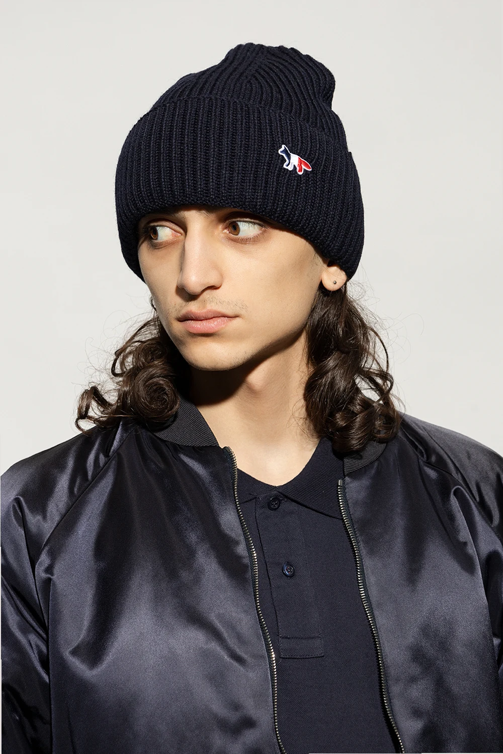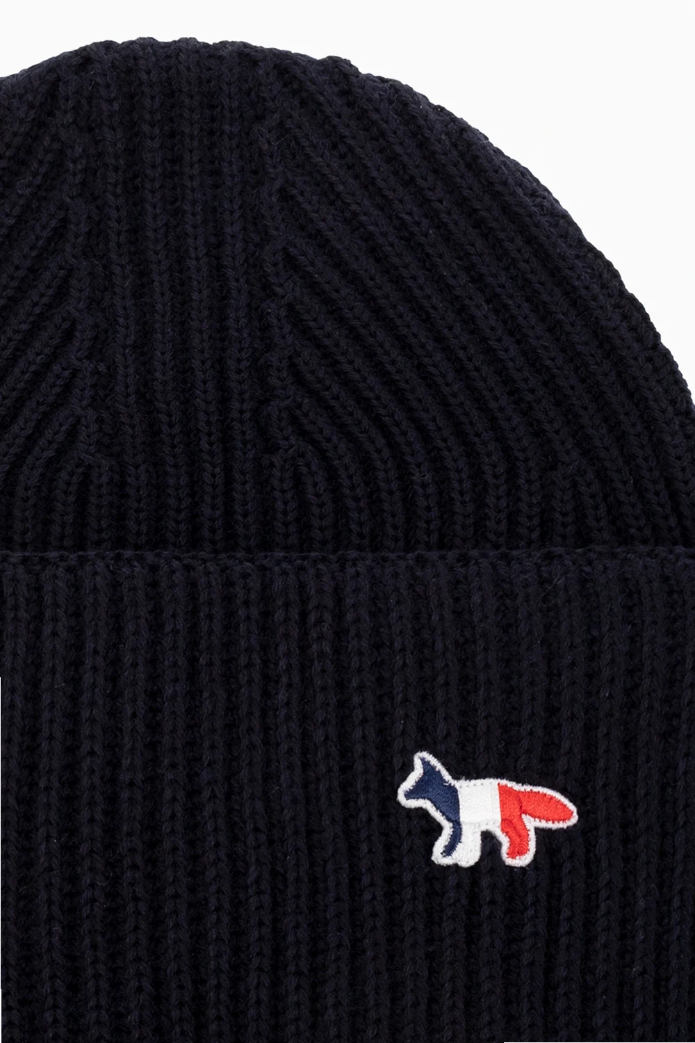 Granatowa, prążkowana czapka Maison Kitsune. Wykonana z wełny. Ozdobiona granatowo-biało-czerwoną naszywką z logo.