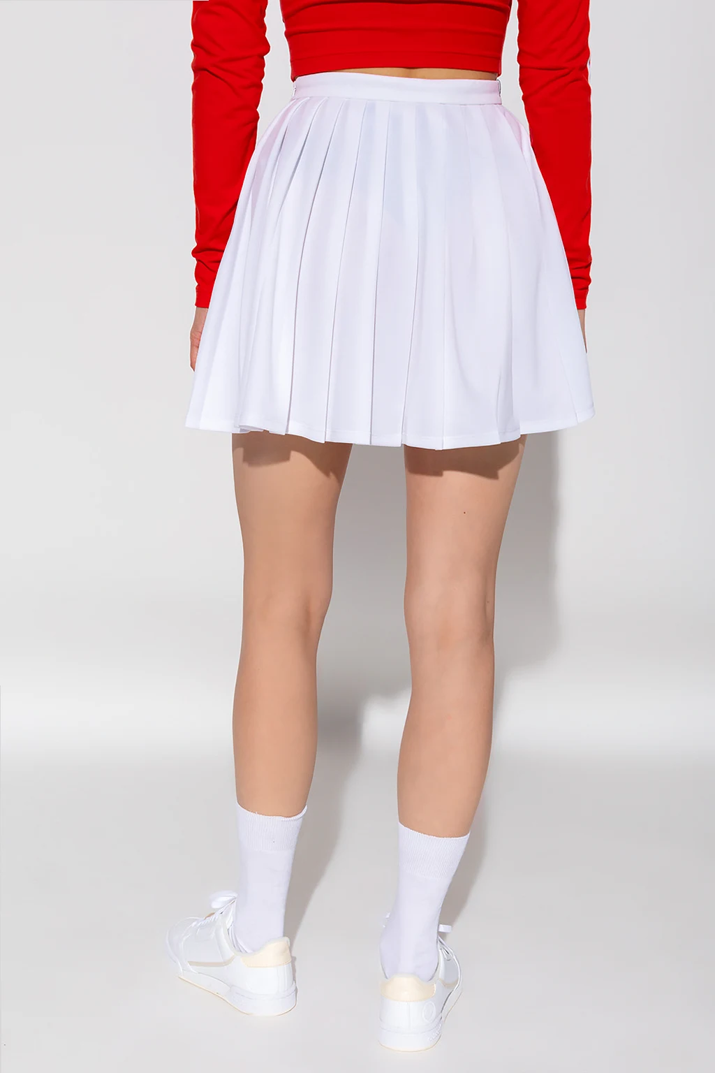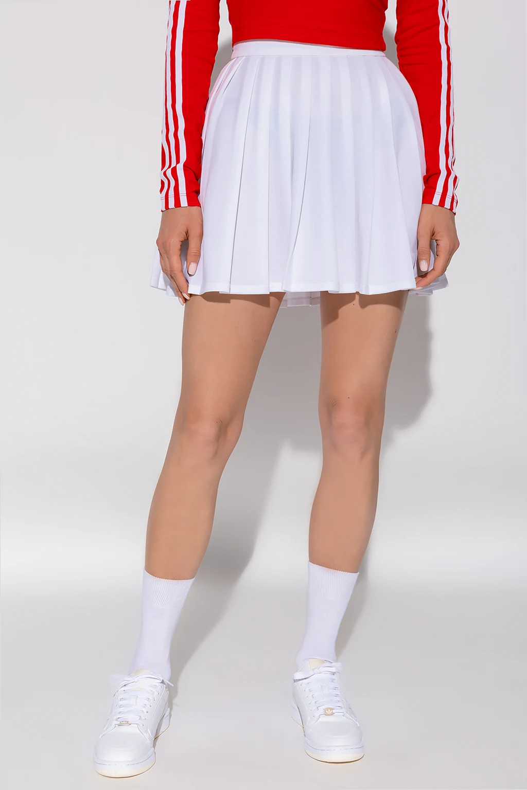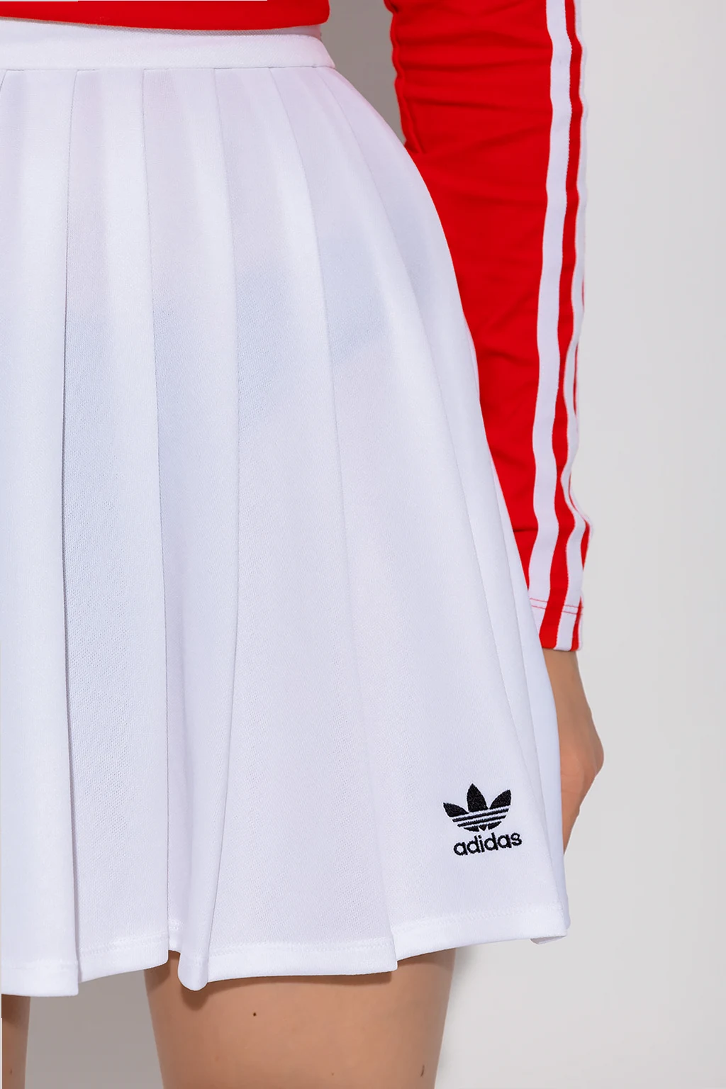 Biała, plisowana spódnica ADIDAS Originals, kolekcja ‘End Plastic Waste’. Wykonana z materiału z recyklingu. Z boku zapinana na kryty zamek. Z przodu ozdobiona wyszytym logo w kolorze czarnym.