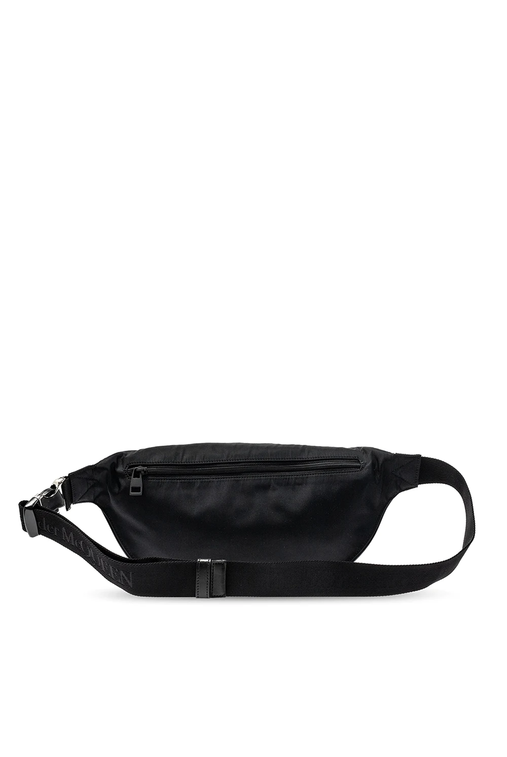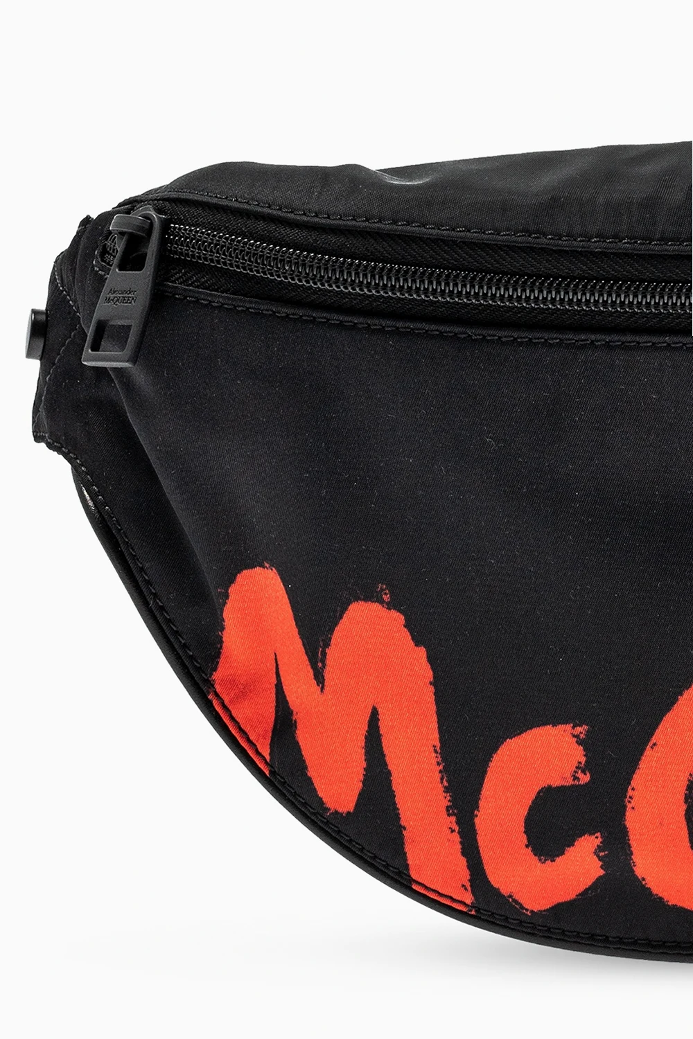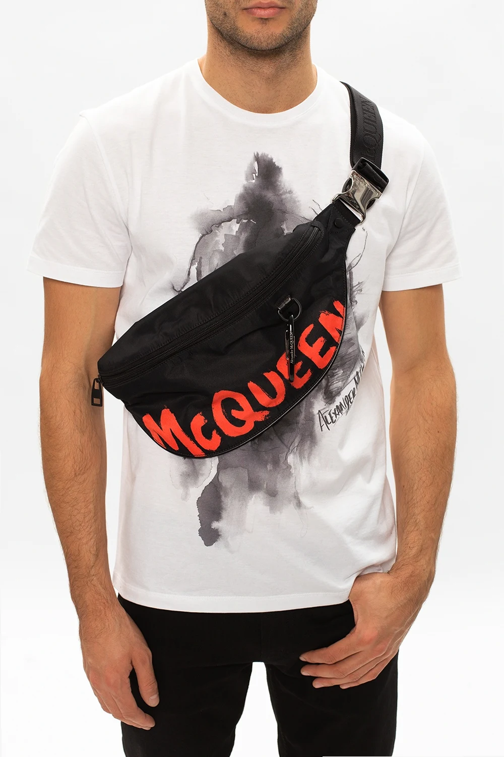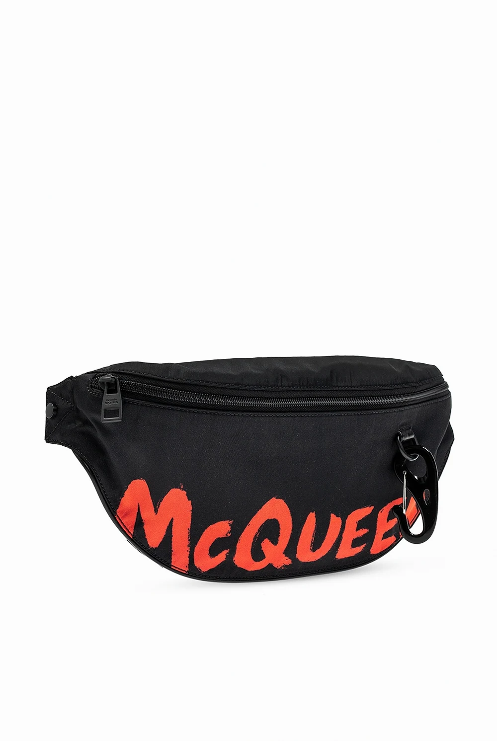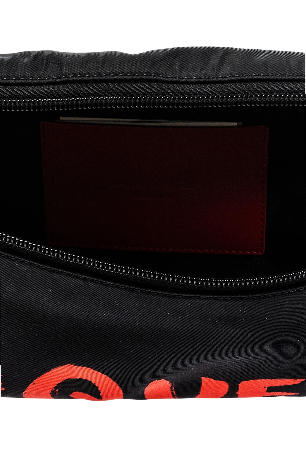 Czarna torba na pas Alexander McQueen. Zamykana na zamek. Z przodu dekoracyjny brelok oraz nadrukowane logo w kolorze czerwonym. Z tyłu kieszeń zamykana na zamek. Regulowany pas. Wewnątrz komora i miejsce na kartę.