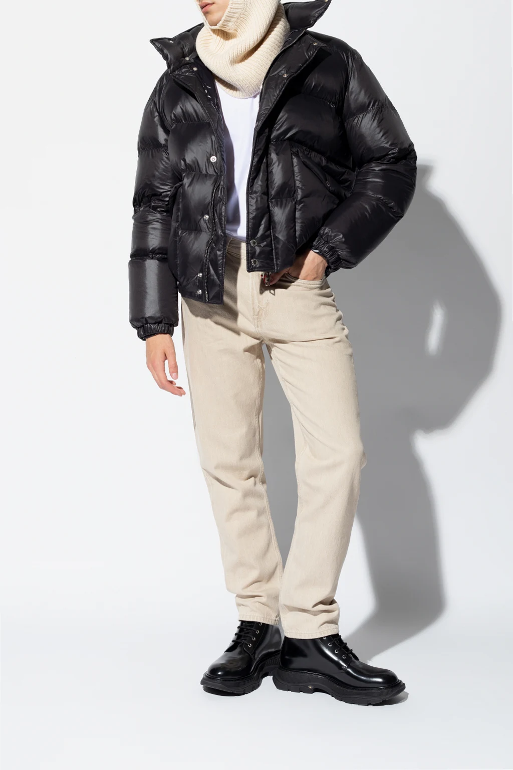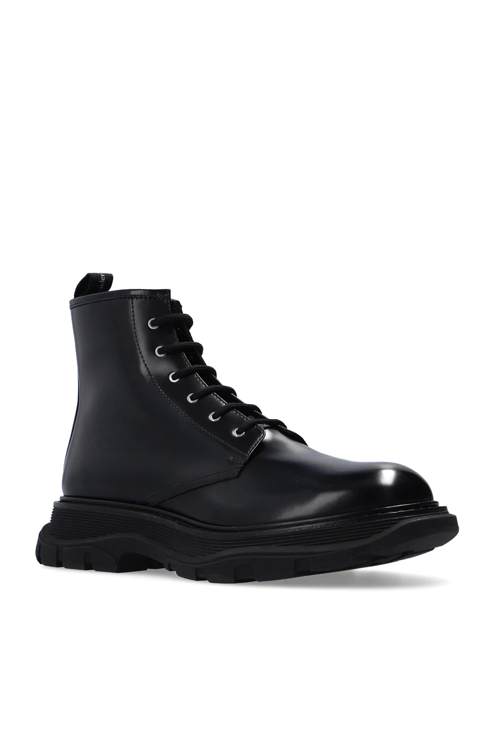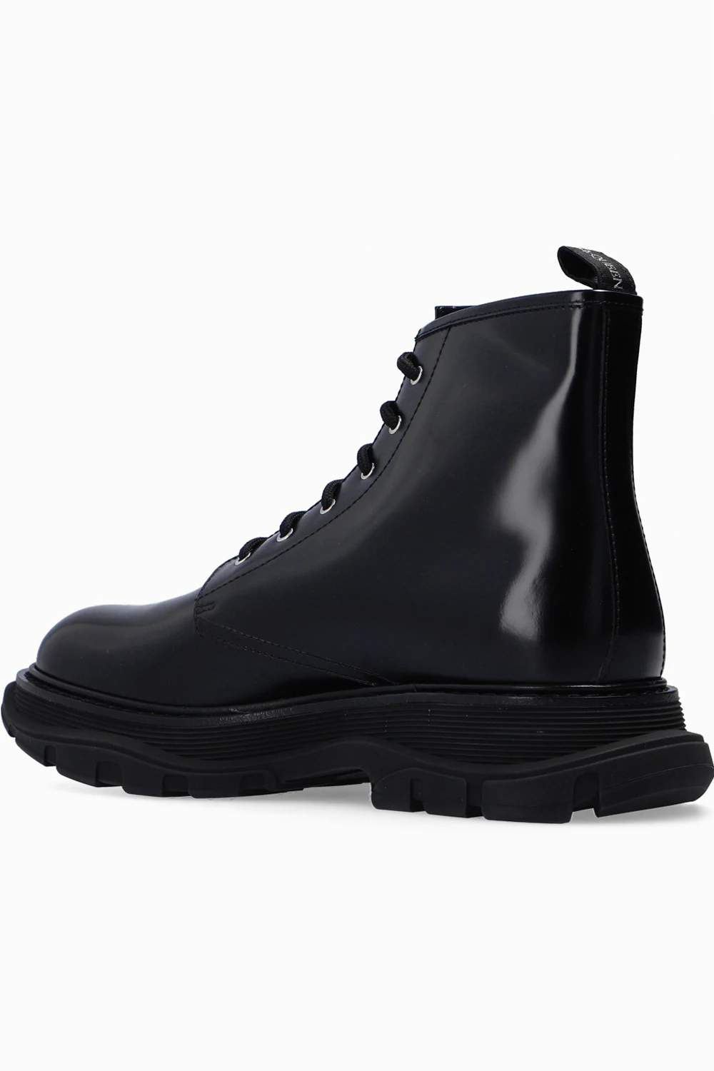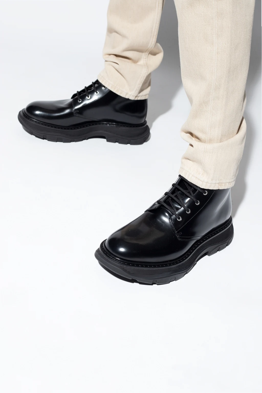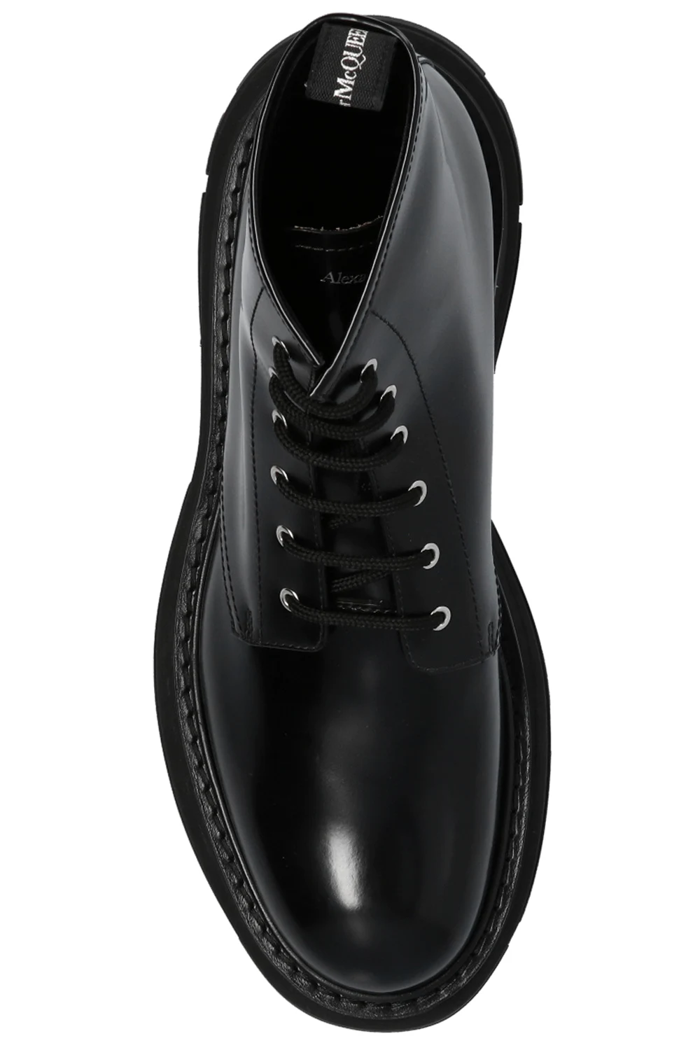Czarne, sznurowane buty za kostkę Alexander McQueen. Wykonane ze skóry. Ozdobione wstawką z wyszytym wzorem z logo w kolorze srebrnym. Migdałowy nosek. Czarna, gumowa podeszwa.
