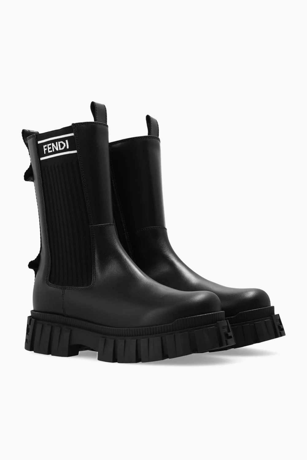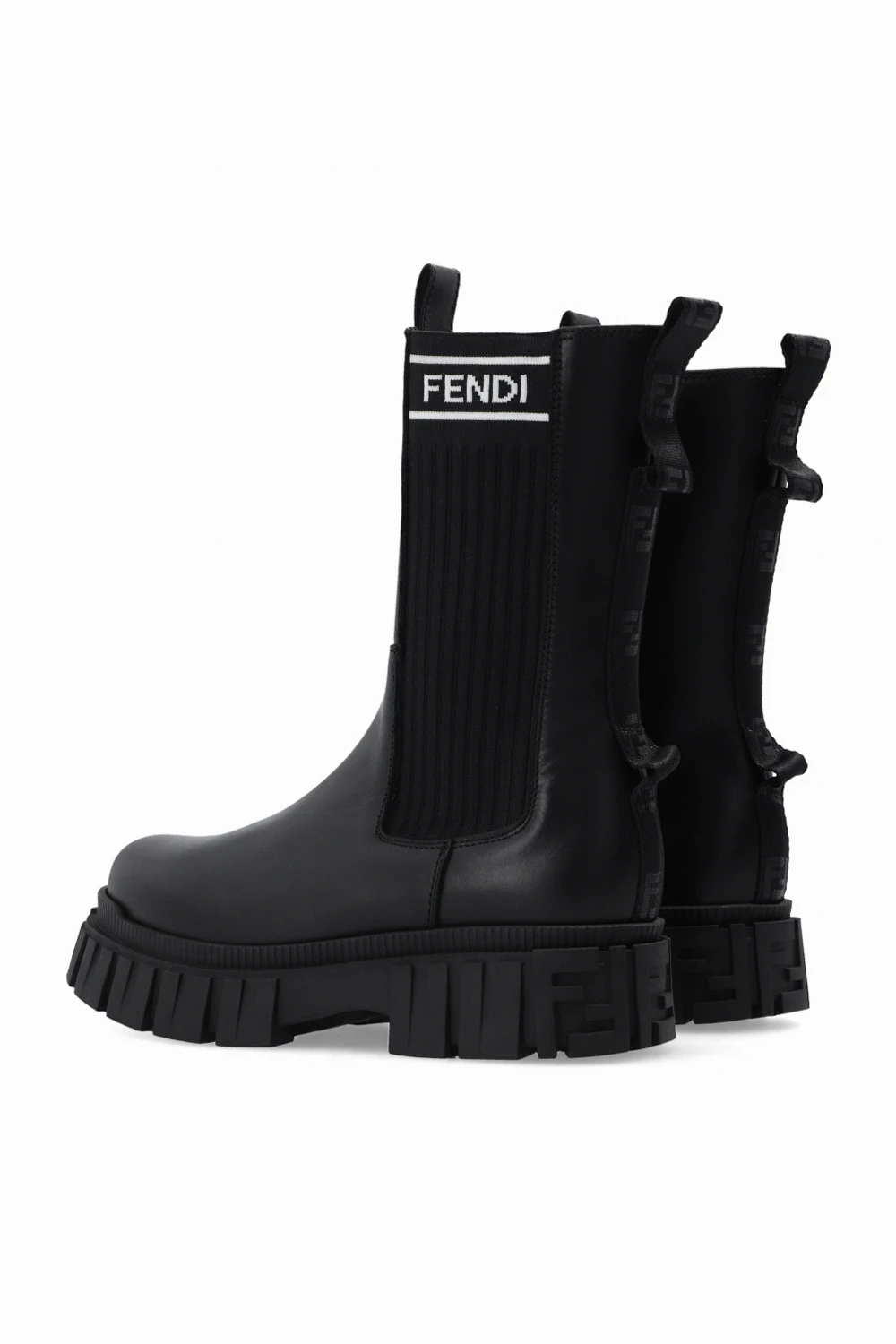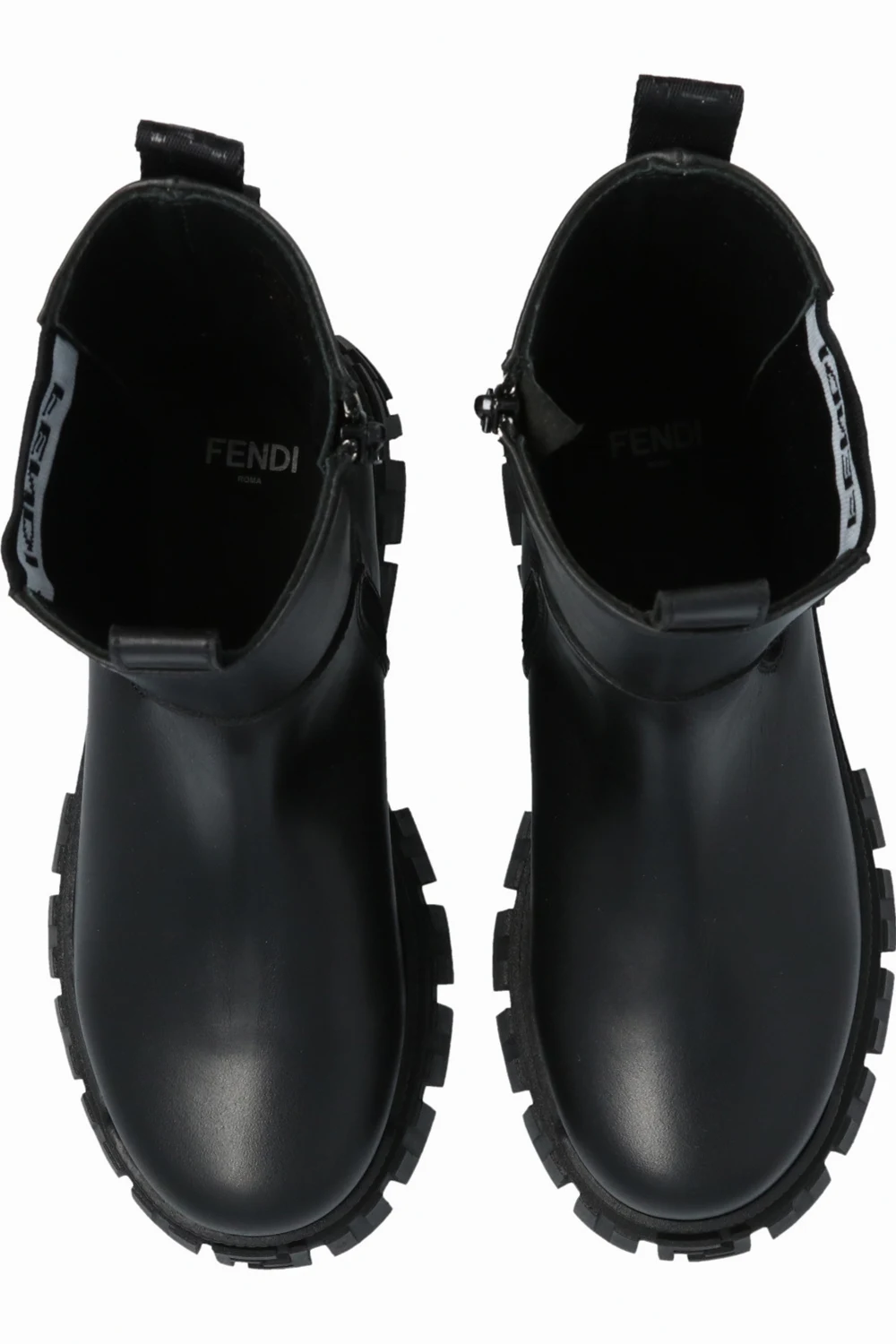 Czarne botki Fendi Kids. Wykonane ze skóry. Z jednej strony zapinane na zamek. Z drugiej strony wszyta czarna guma z logo w kolorze białym. Czarna, gumowa podeszwa.