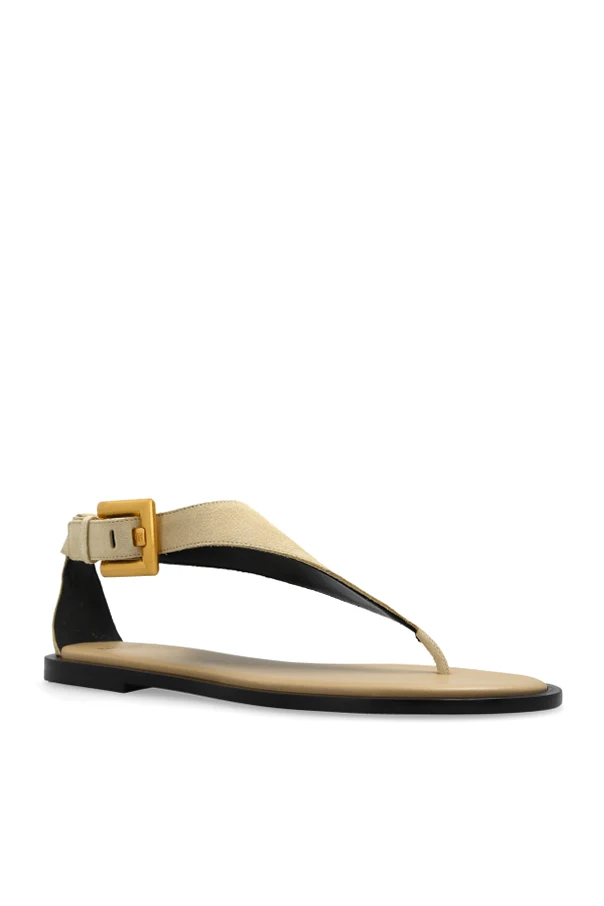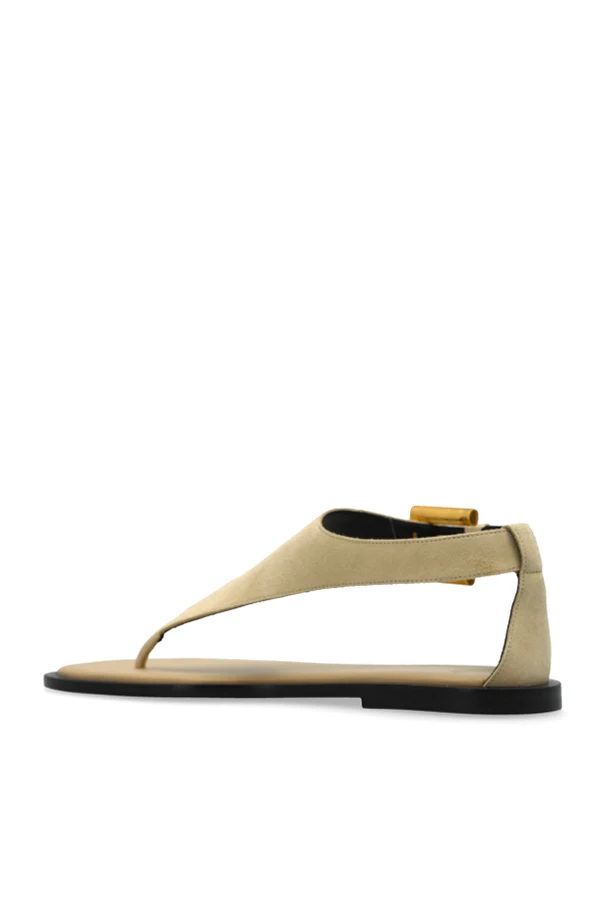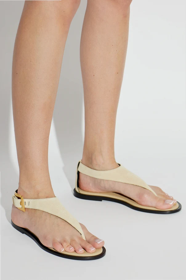 Zamszowe sandały „Anthem” zachwycają wyrafinowaną harmonią formy oraz subtelnością detali. Minimalistyczny fason typu flat sandals z szerokim paskiem w kształcie litery „T” otula stopę, zaś elegancka klamra w kremowo-żółtym odcieniu dodaje całości wyrazistego charakteru.