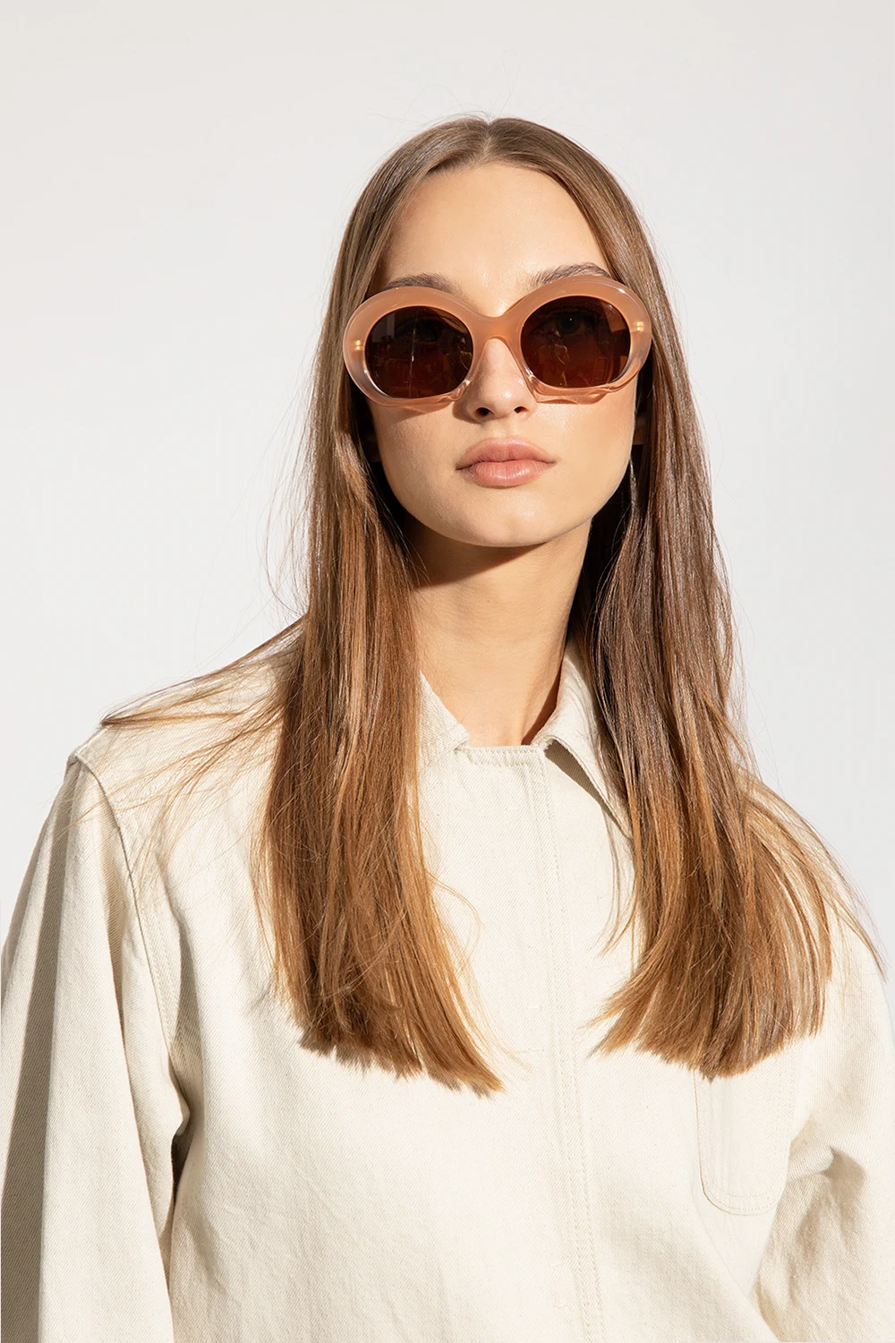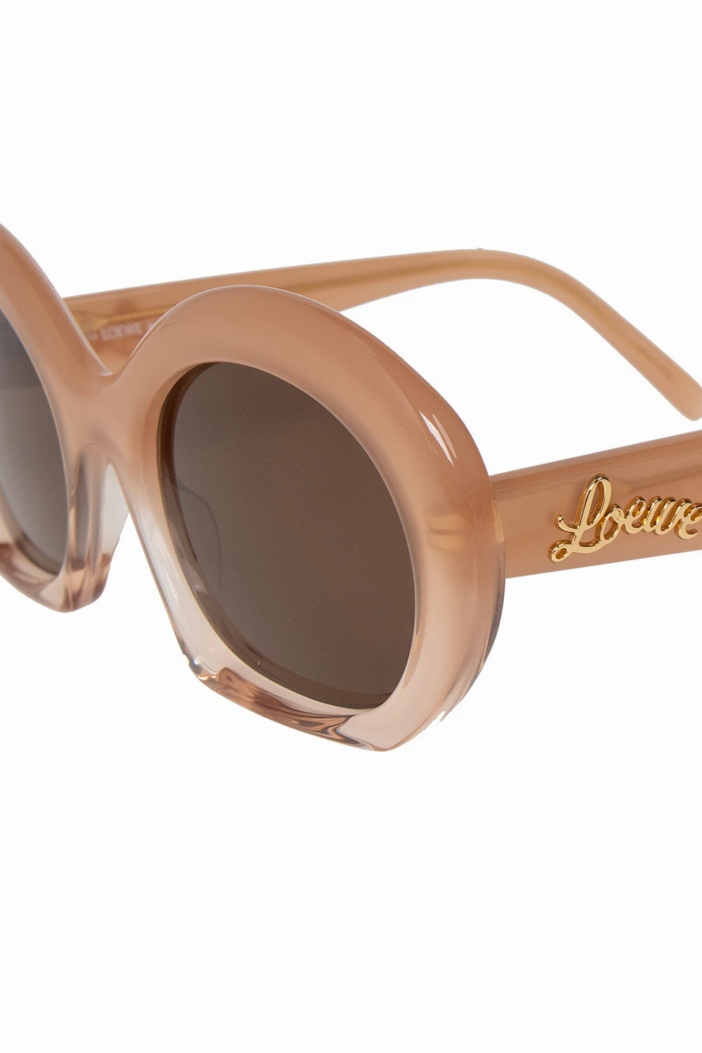 Beżowe okulary przeciwsłoneczne Loewe. Oprawki z transparentnym wykończeniem. Zauszniki ozdobione metalową aplikacją w kształcie logo w kolorze złotym. Brązowe szkła ze 100% ochroną przed promieniowaniem UVA/UVB. Dołączone etui.