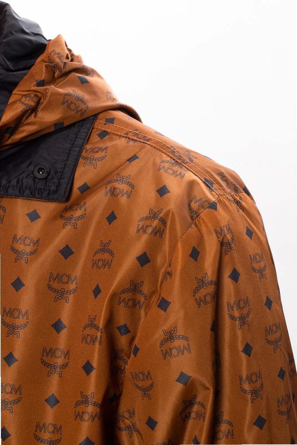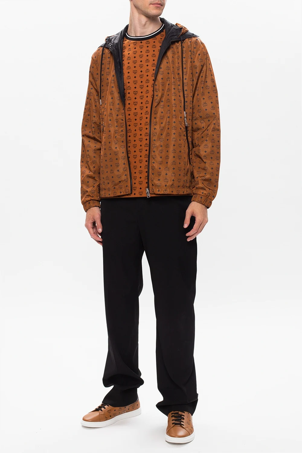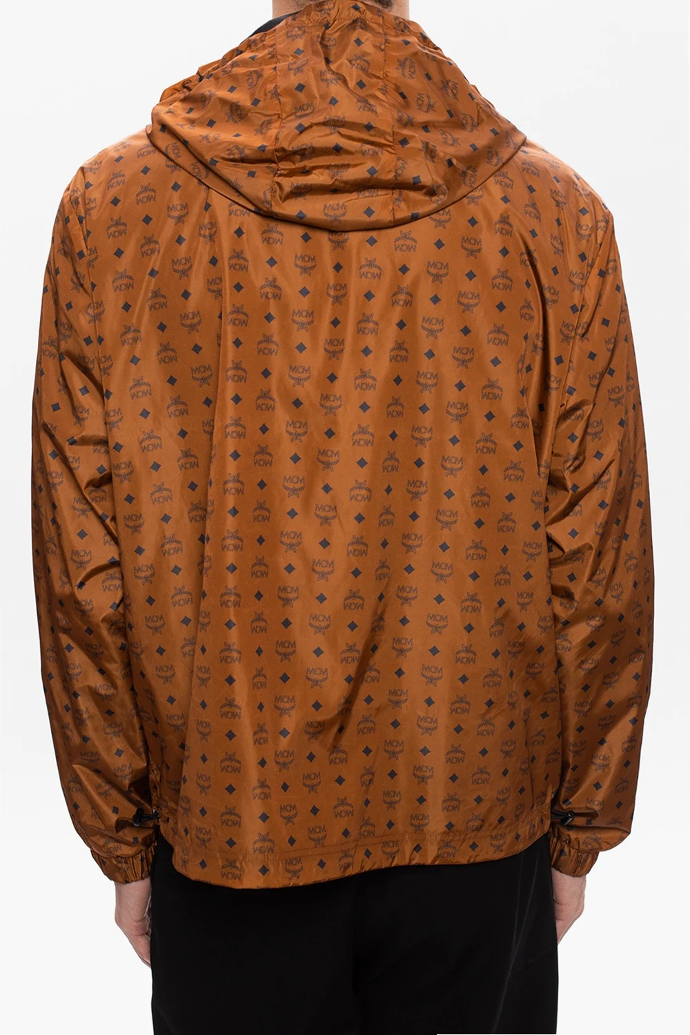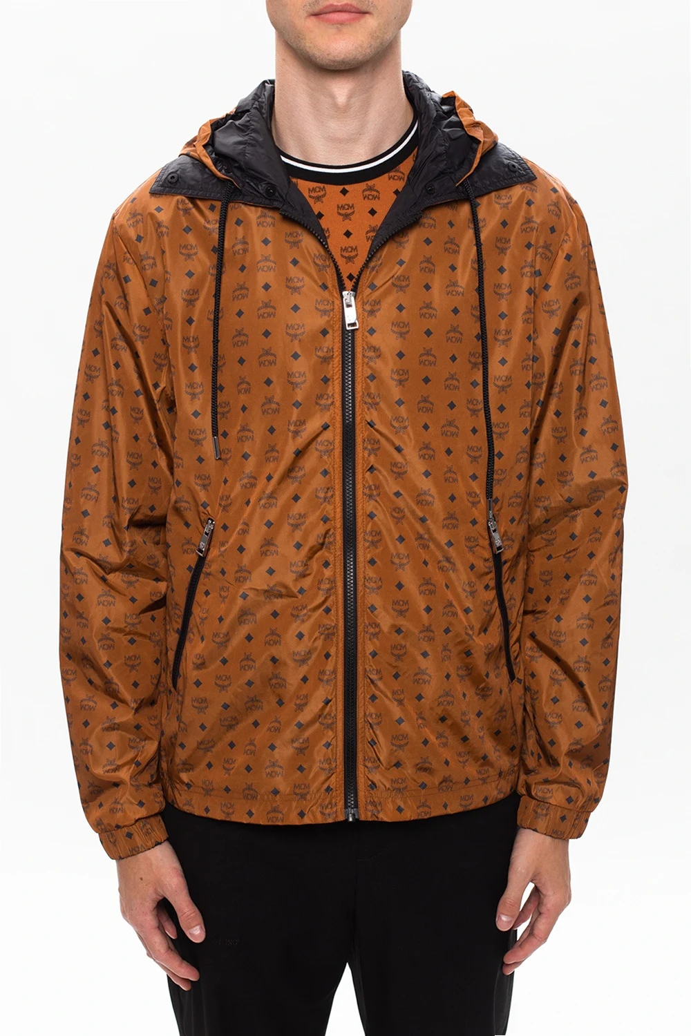 Brązowa kurtka przeciwdeszczowa MCM. Zapinana na zamek. Ozdobiona nadrukowanym logo w kolorze czarnym. Z przodu dwie kieszenie zapinane na zamek. Kaptur ściągany trokami.