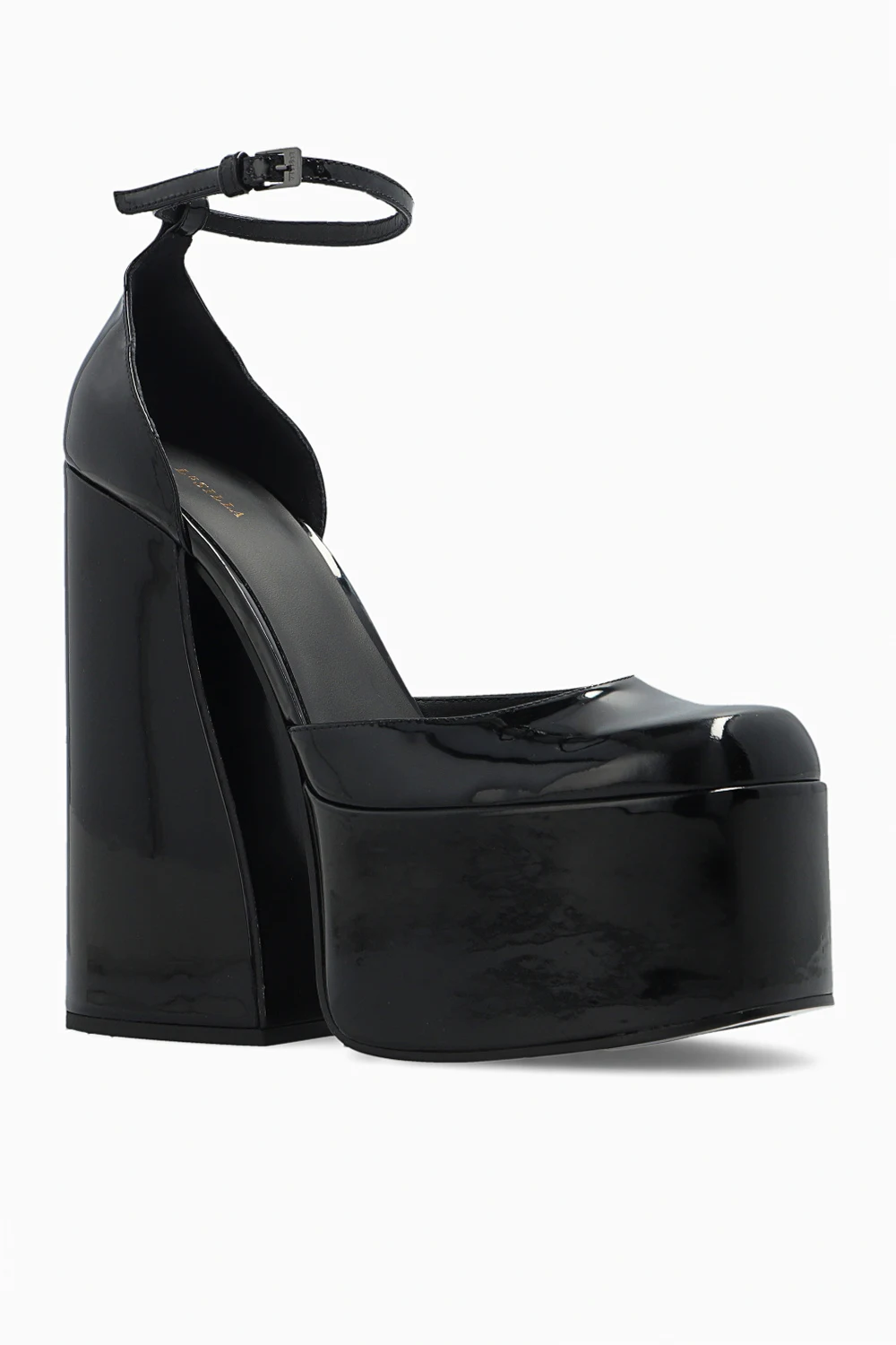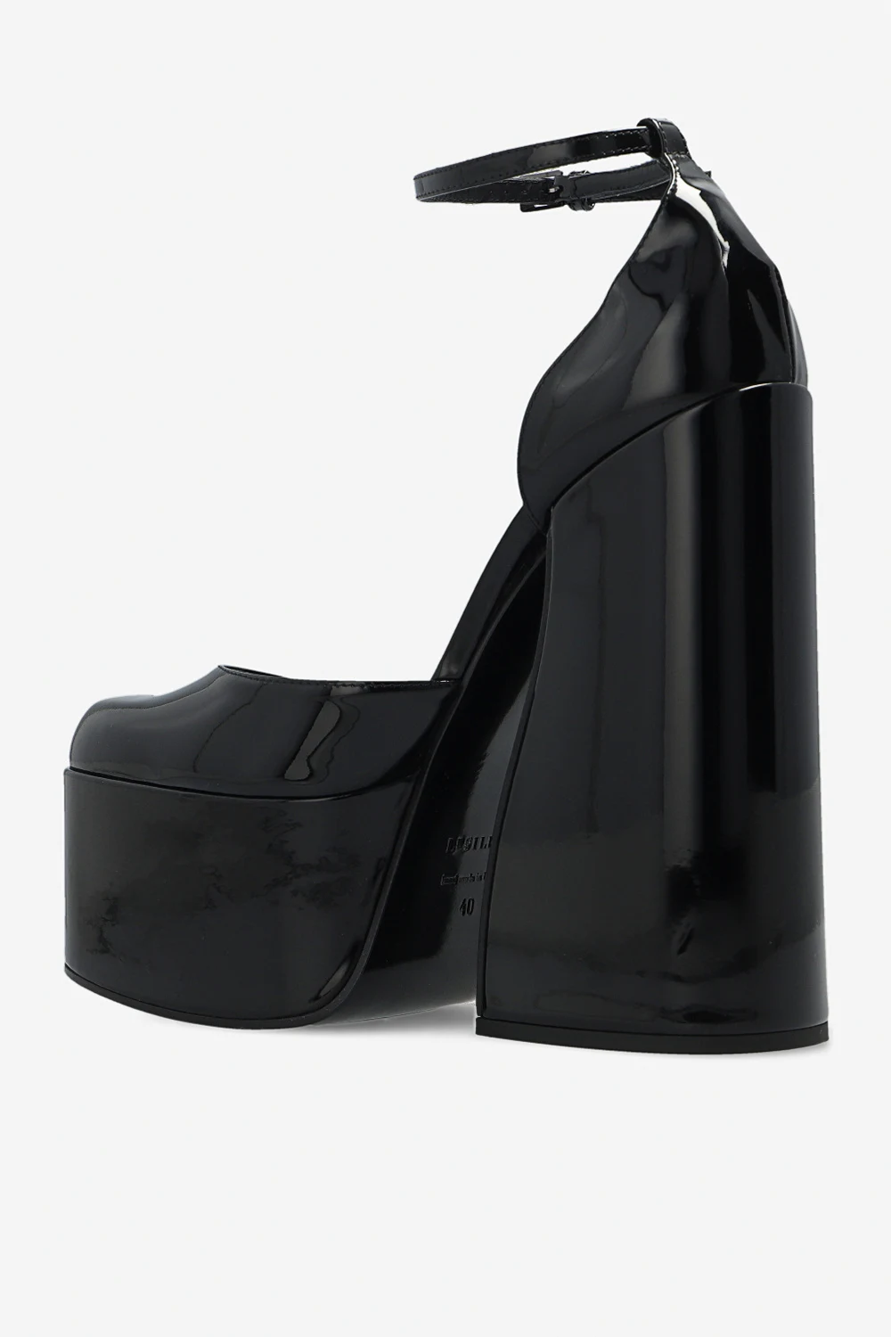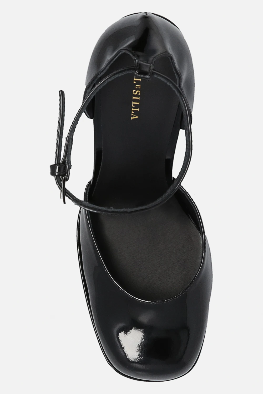 Czarne, lakierowane buty na platformie, model ‘Nikki’ Le Silla. Wykonane ze skóry cielęcej. Zapinane wokół kostki na regulowany pasek z klamrą. Zaokrąglony nosek. Szeroki obcas. Czarna, skórzana podeszwa wykończona gumą.