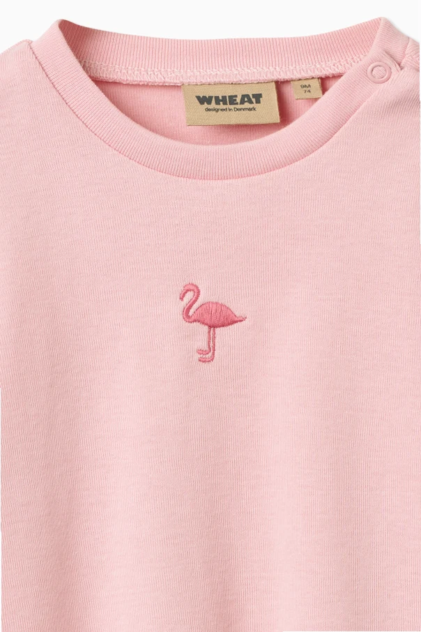 Miękka dzianina bawełniana o drobnym splocie otula skórę dziecka wyjątkową łagodnością, stanowiąc zarazem gwarancję bezpieczeństwa i przewiewności. Uwagę zwraca subtelny, haftowany motyw flaminga, którego obecność na środku przodu nadaje modelowi unikatowy charakter. Praktyczne napy przy dekolcie ułatwiają zakładanie t-shirtu i są dyskretnym udogodnieniem dla rodziców.