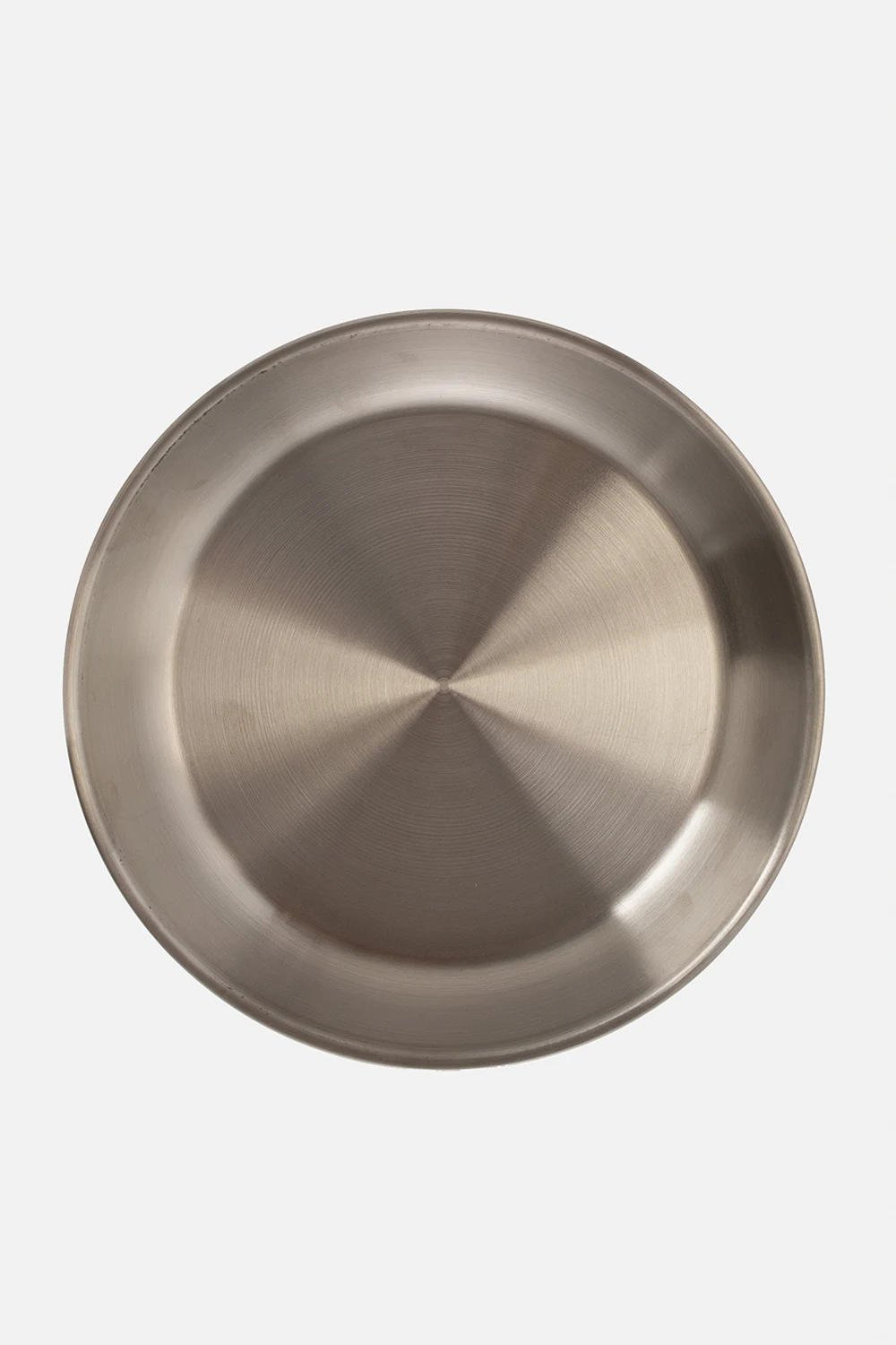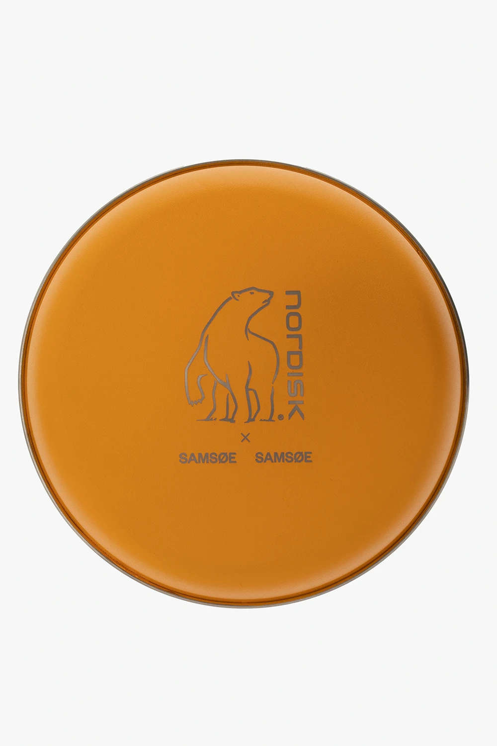 Pomarańczowy talerz podróżny Samsoe Samsoe x Nordisk. Wykonany ze stali nierdzewnej. Dno ozdobione logo w kolorze srebrnym oraz motywem niedźwiedzia polarnego. Można myć w zmywarce.