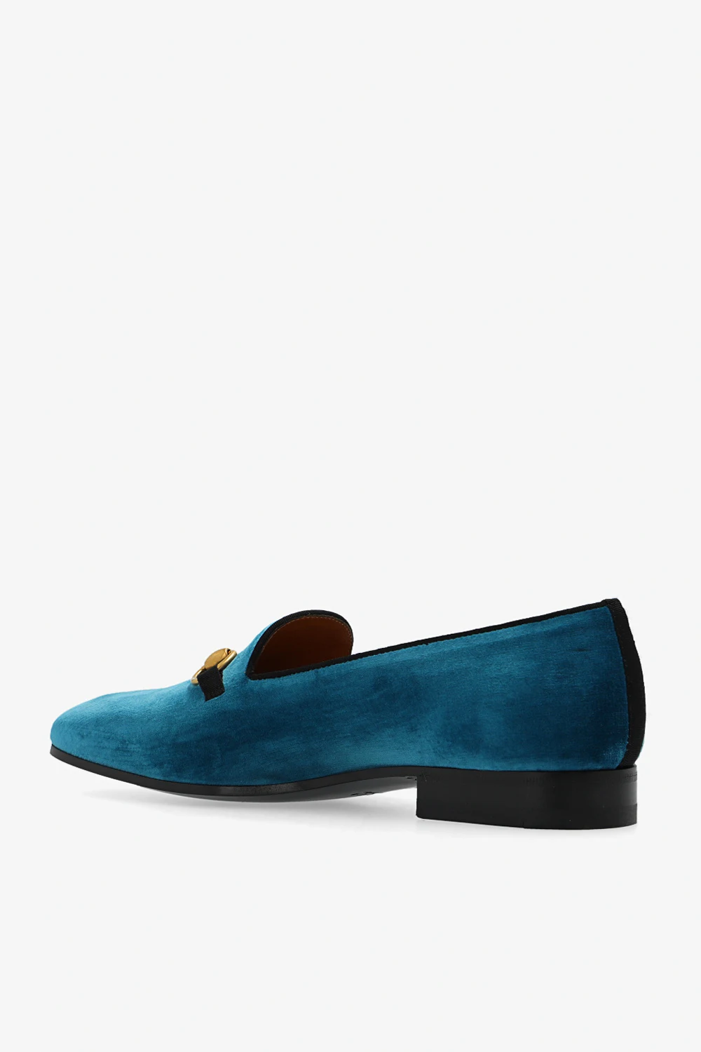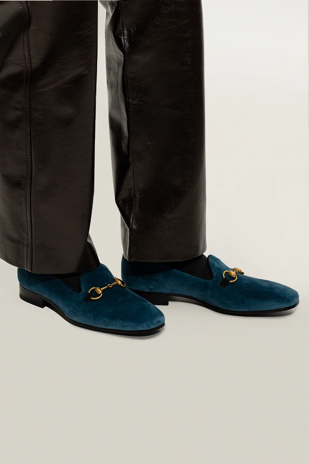 Niebieskie, aksamitne mokasyny Gucci. Wykończone czarnym rypsowym paskiem. Z przodu charakterystyczne wędzidło w kolorze złotym. Czarna, skórzana podeszwa.