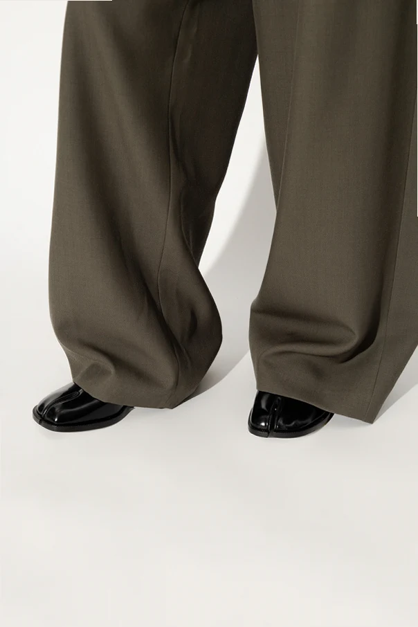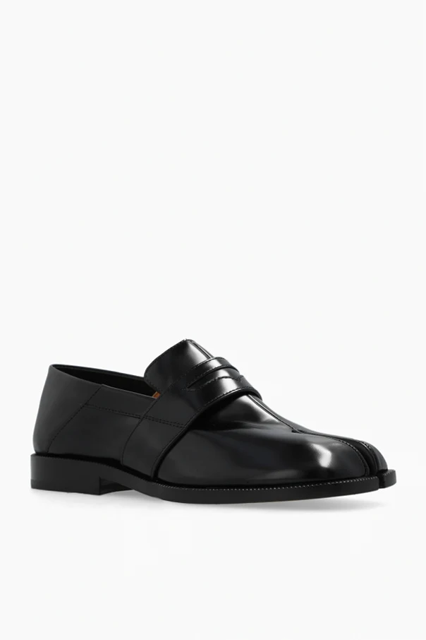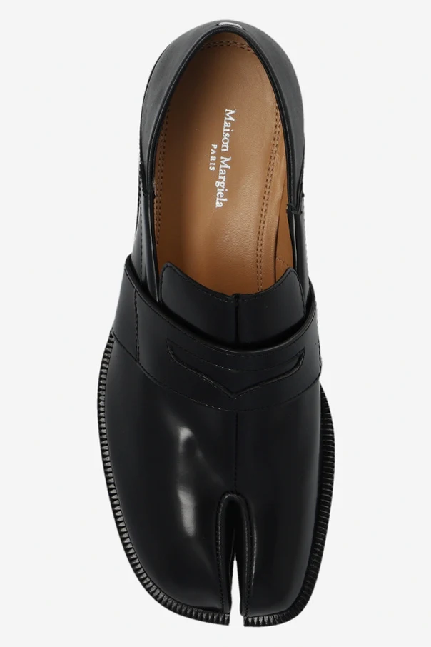 Czarne buty typu ‘loafers’ Maison Margiela. Wykonane ze skóry. Z przodu charakterystyczne wycięcie ‘Tabi’. Beżowa, skórzana podeszwa.