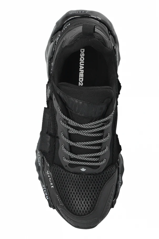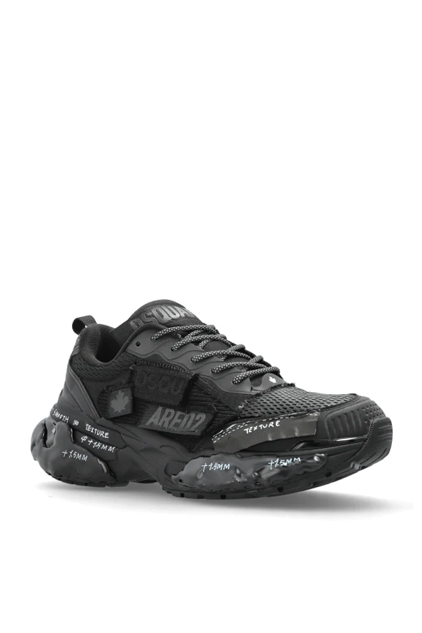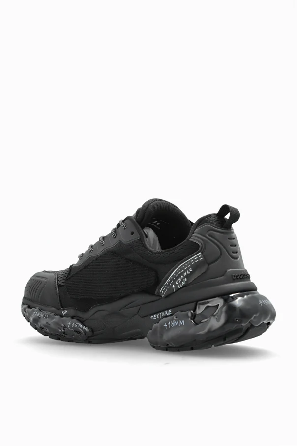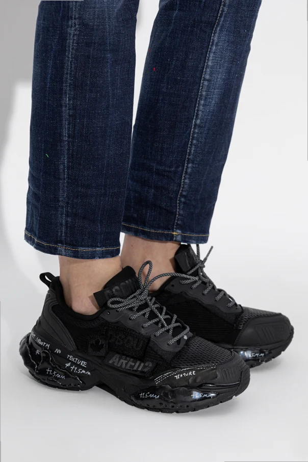 Subtelne napisy oraz wyraziste detale marki Dsquared2 – zarówno w formie wytłaczanych oznaczeń, jak i nadruków – umieszczone na bocznych panelach oraz języku, są wyraźnym akcentem designerskiego zamysłu. Solidna, kontrastująca podeszwa z miękkiej gumy rozświetla sylwetkę buta, nadając mu nowoczesnego wyrazu.