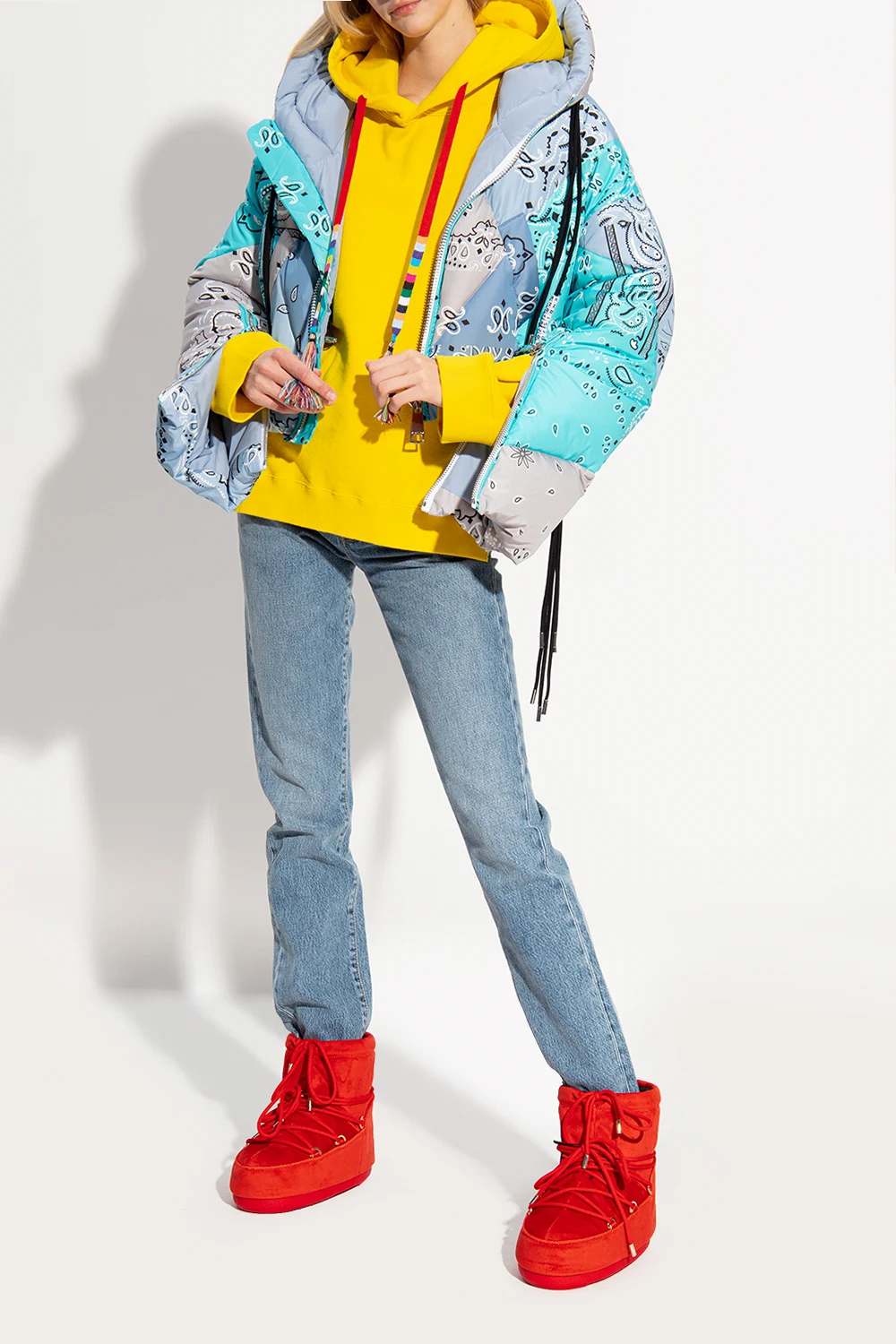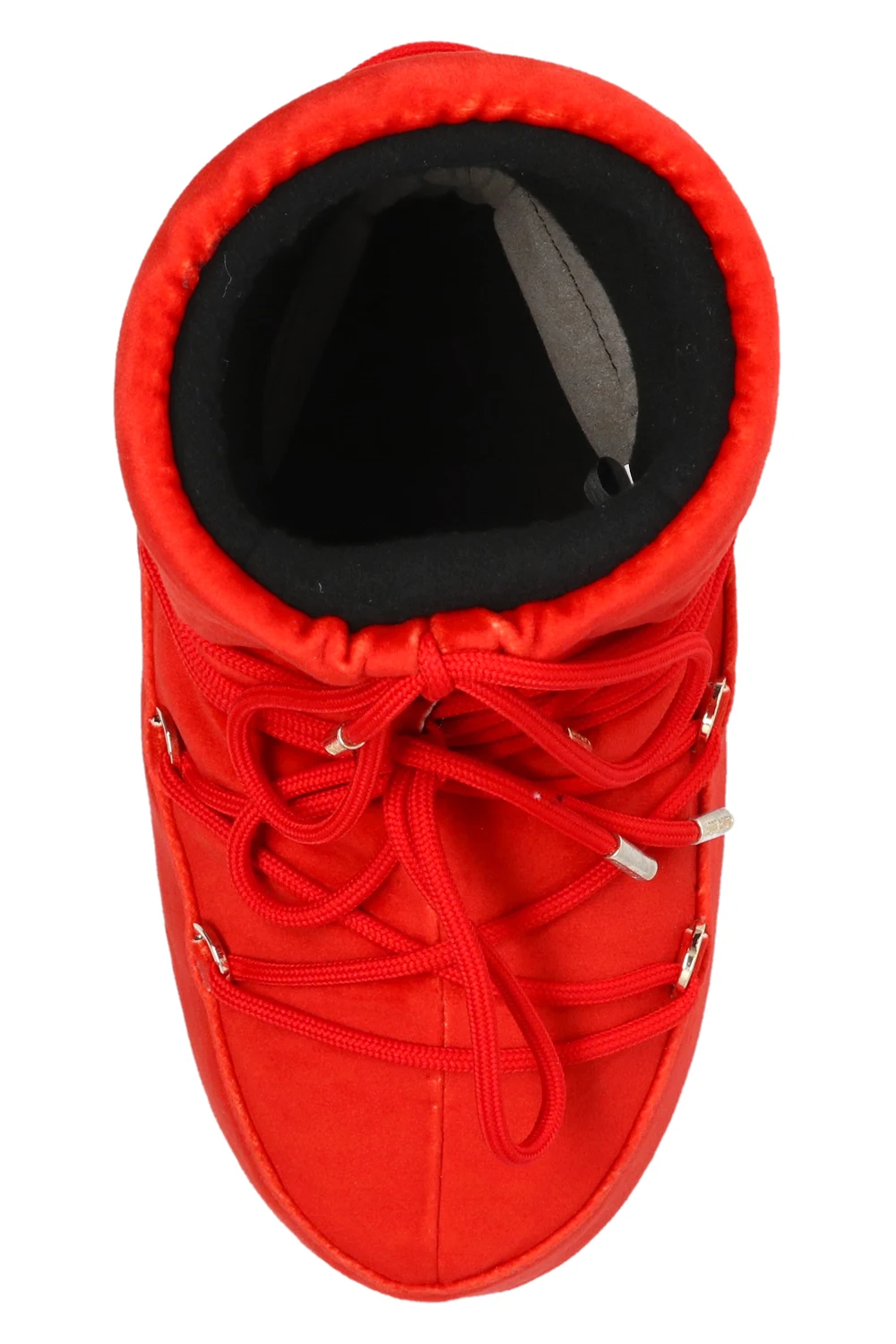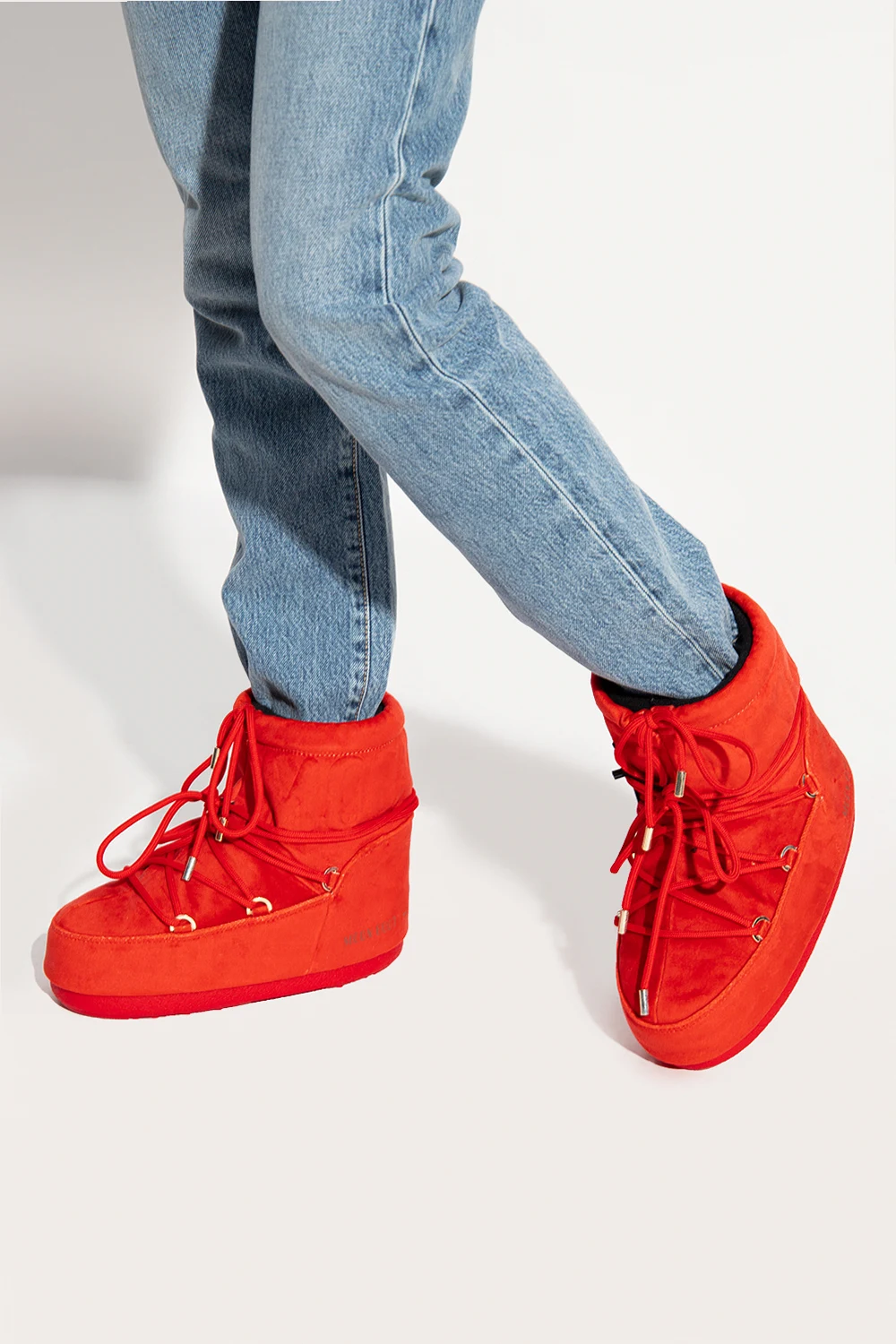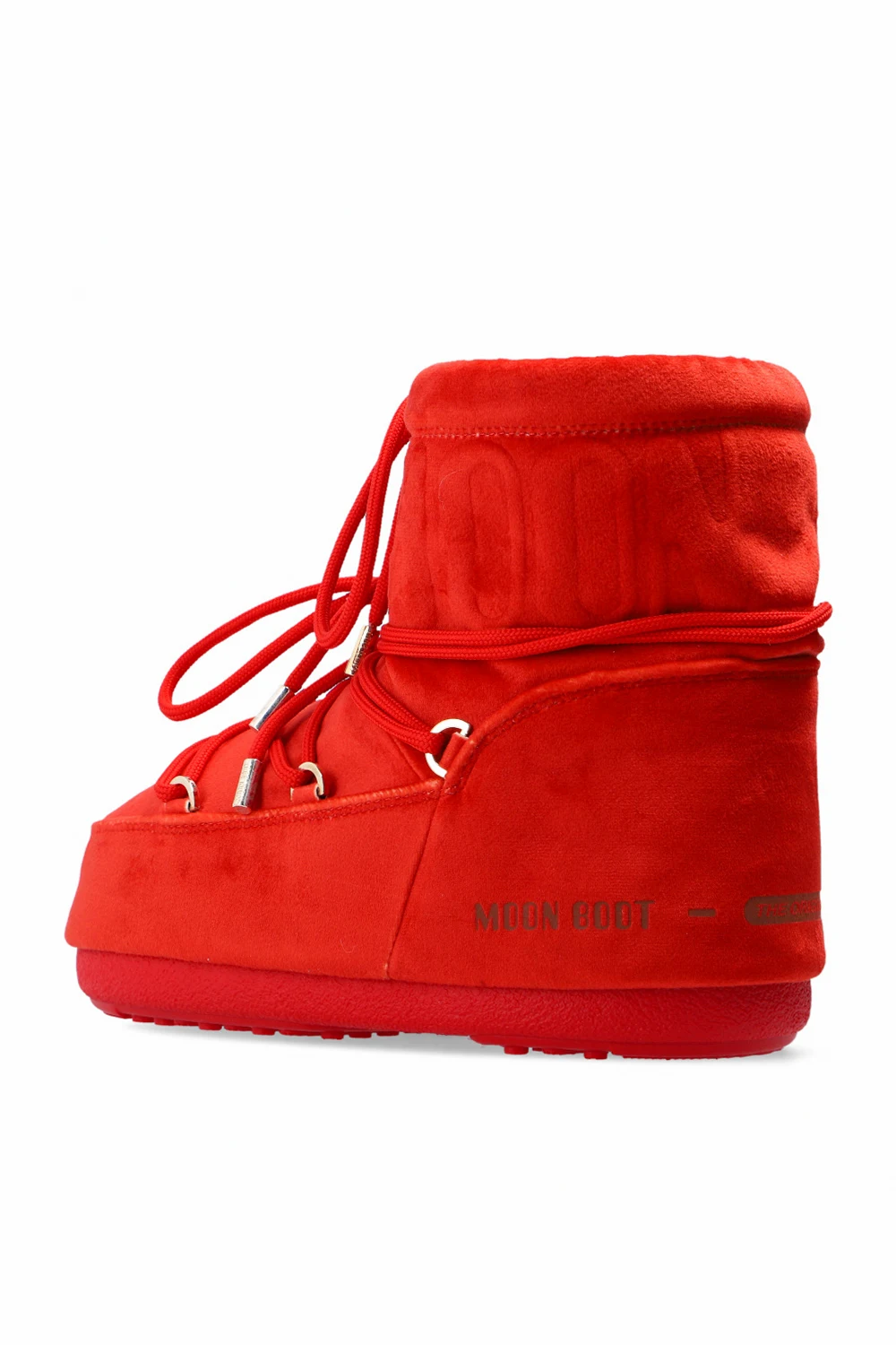 Czerwone, welurowe śniegowce, model ‘Mars Velvet’ Moon Boot. Wzór z logo. Dekoracyjne sznurowanie. Czerwona, gumowa podeszwa. Metalowe elementy w kolorze srebrnym. Śniegowce inspirowane specyficznym kształtem i technologią butów dla astronautów. Zaprojektowane w 1969 roku, kiedy pierwszy człowiek stanął na Księżycu.
