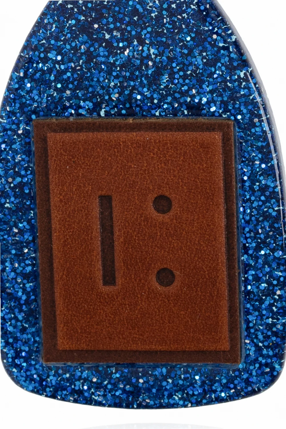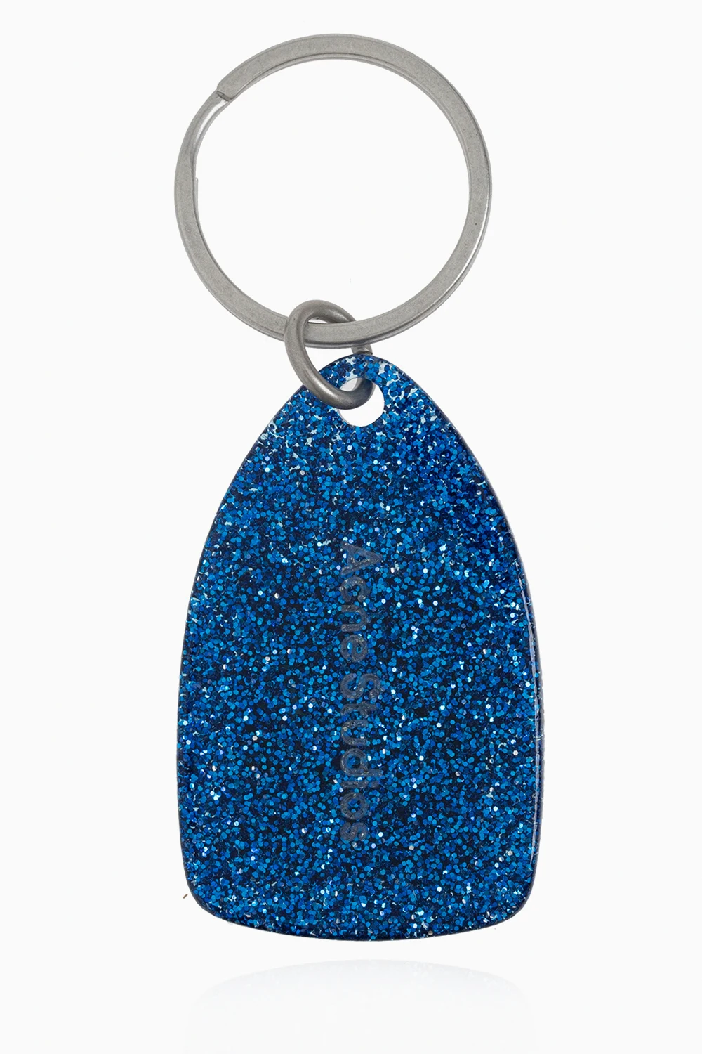 Niebieski brelok Acne Studios. Brokatowe wykończenie. Aplikacja w kolorze brązowym oraz wytłoczone logo. Metalowe elementy w kolorze srebrnym.