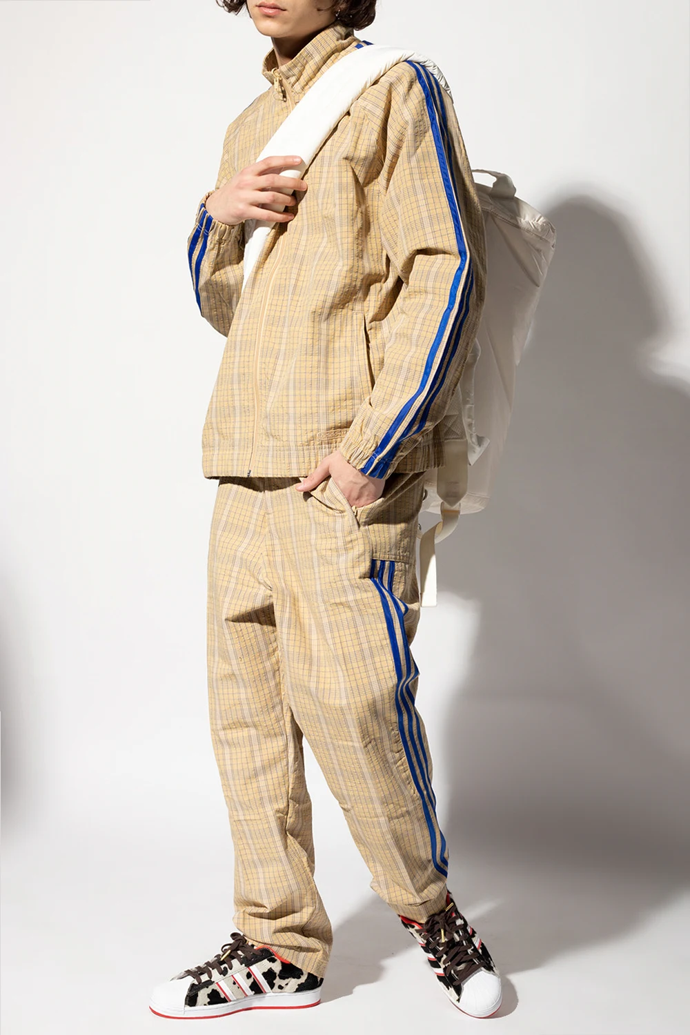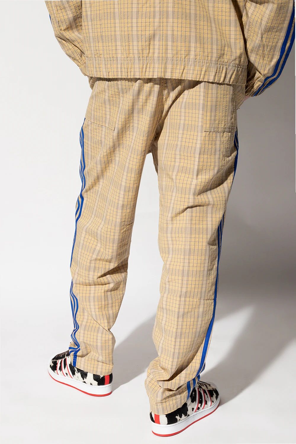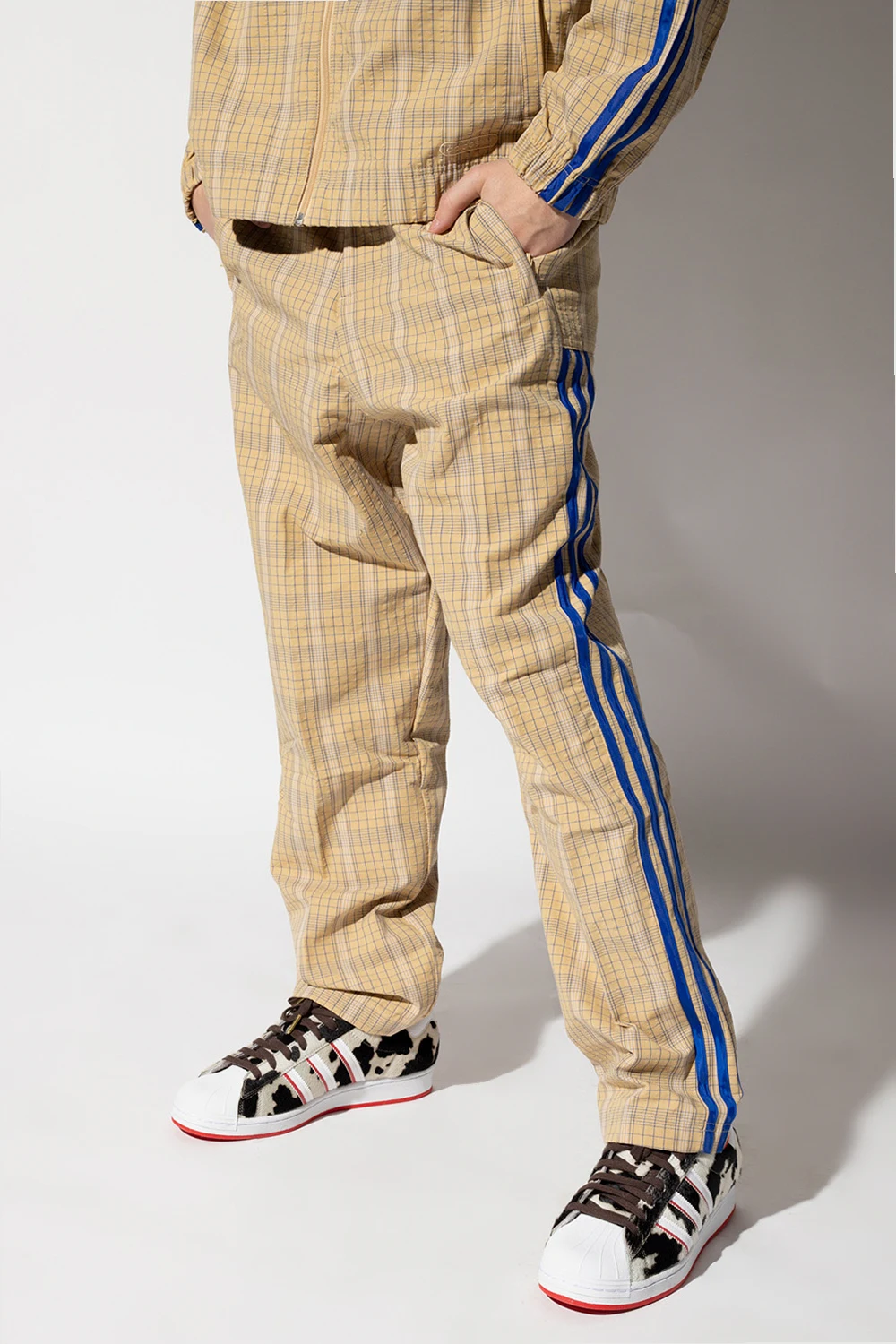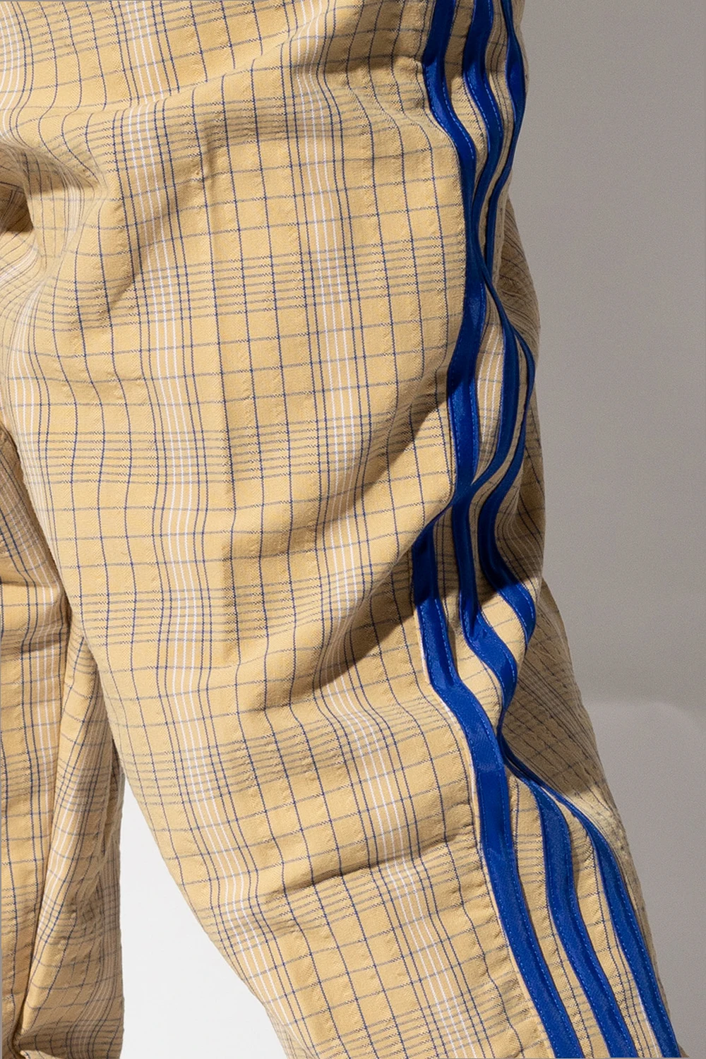Żółte spodnie ADIDAS Originals. Wykonane z bawełny. Zapinane na zamek oraz guzik. Nadrukowany wzór w kratę. Wyszyte logo. Z boku charakterystyczne dla marki trzy paski w kolorze granatowym. Cztery kieszenie: dwie zapinane na zamek z przodu oraz dwie wsuwane z tyłu. Zwężane nogawki.