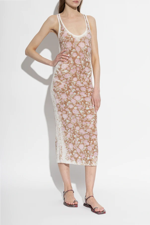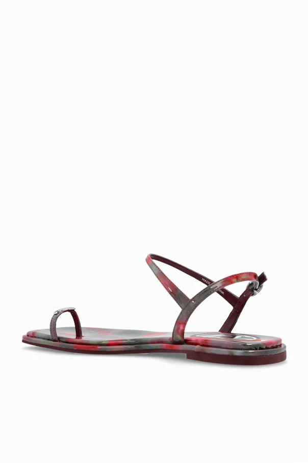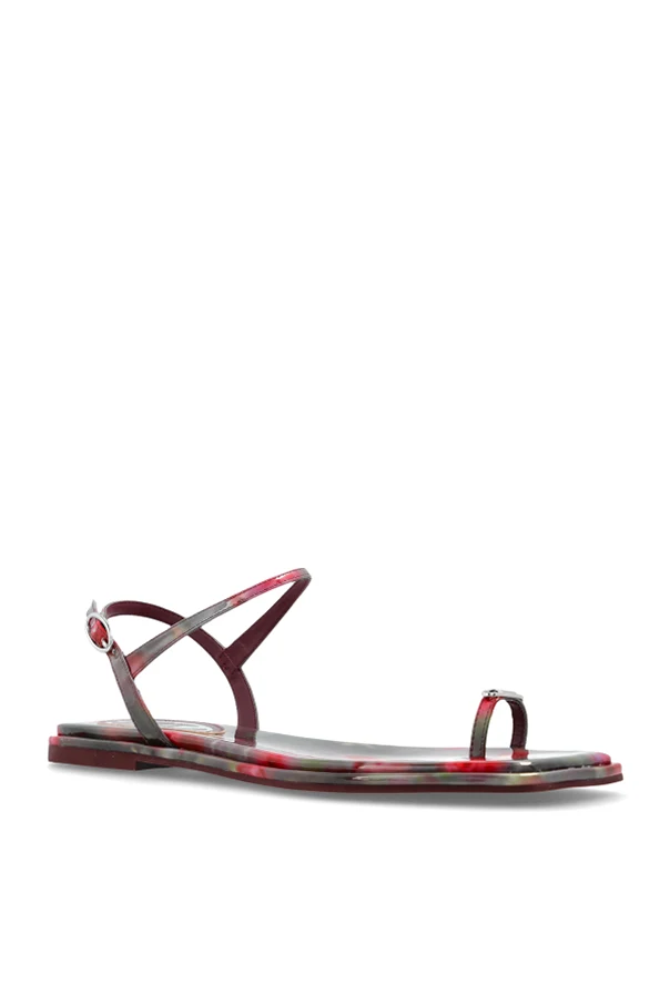 Sandały w kolorze multikolor wyróżniają się efektownym, akwarelowo-kwiatowym deseniem, w którym dominują odcienie czerwieni, bordo, zieleni oraz subtelne nuty bieli na tle transparentnej, połyskującej struktury. Wykorzystanie najwyższej jakości gumy zapewnia nie tylko odporność na zarysowania, lecz także lekkość oraz wygodę użytkowania. Wysublimowany charakter podkreśla widoczne na wkładce logo renomowanego twórcy.