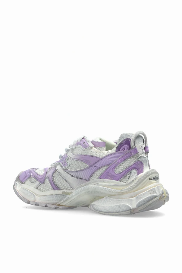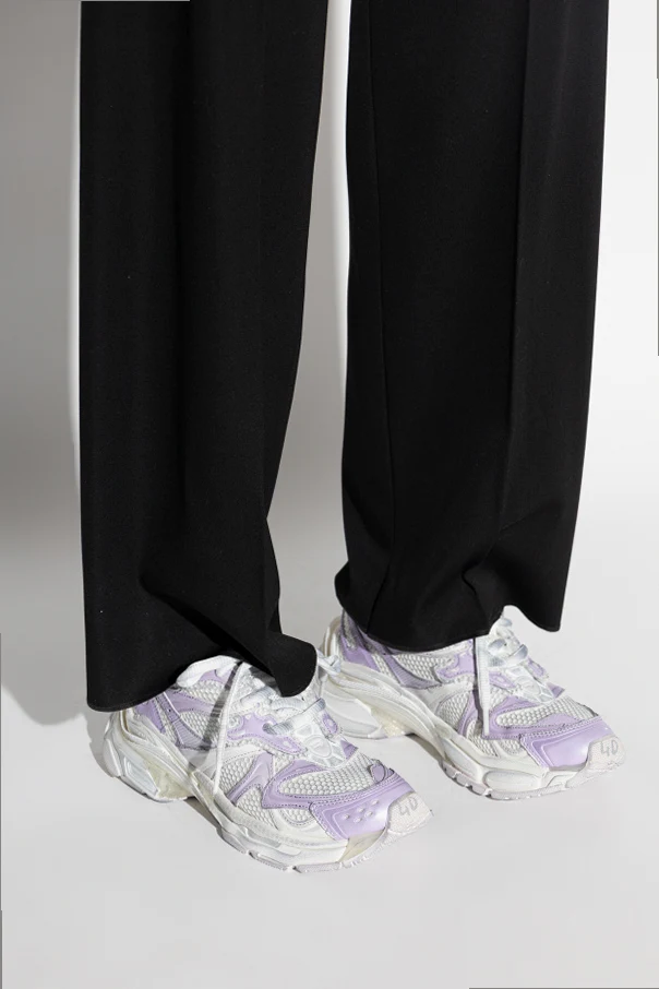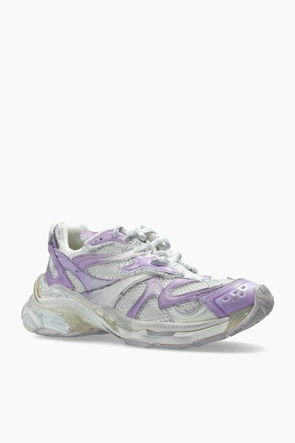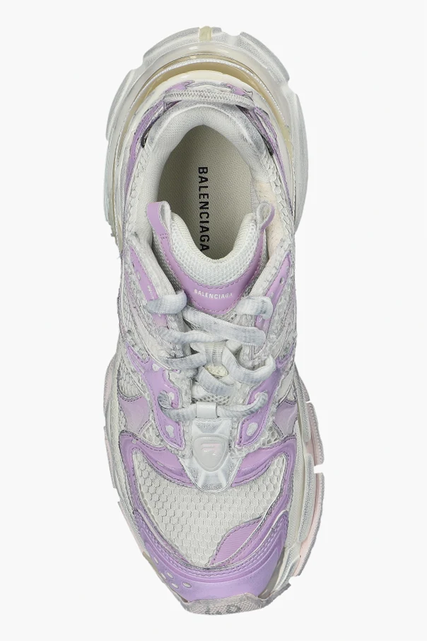 Cholewka z przewiewnej siateczki typu mesh, uzupełniona pastelowofioletowymi, kontrastującymi akcentami syntetycznymi i tekstylnymi, zapewnia wyjątkowy komfort oraz intrygujący wygląd. Biały kolor podkreśla ekskluzywny charakter obuwia, stanowiąc doskonałą bazę dla eleganckiego logotypu „BALENCIAGA”, umieszczonego na języku i wewnątrz buta.