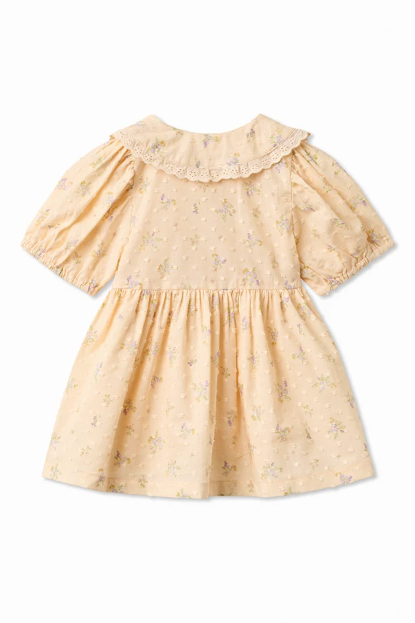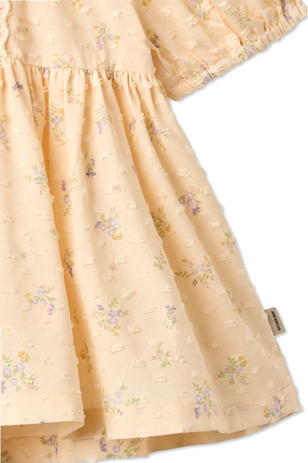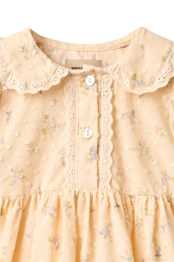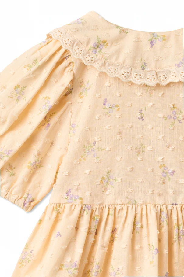 Sukienka „Adele” , stworzona przez renomowanego projektanta Wheat, zachwyca klasycznym krojem oraz lekkością wykonania. Jej rozkloszowany fason sięgający kolan subtelnie podkreśla dziecięcą sylwetkę, zaś lekko odcinana talia dodaje całości wyrafinowanego uroku. Krótkie, bufiaste rękawy z marszczonym wykończeniem oraz ozdobny, szeroki kołnierzyk z haftowaną koronką kreują niezwykle dziewczęcy, wysublimowany charakter.