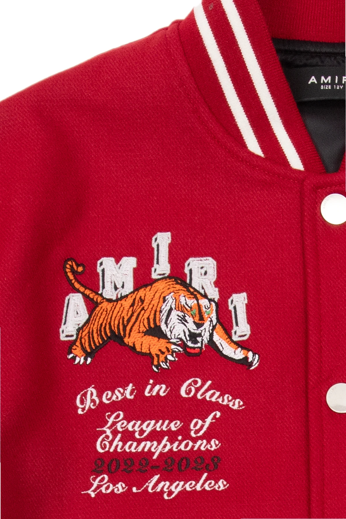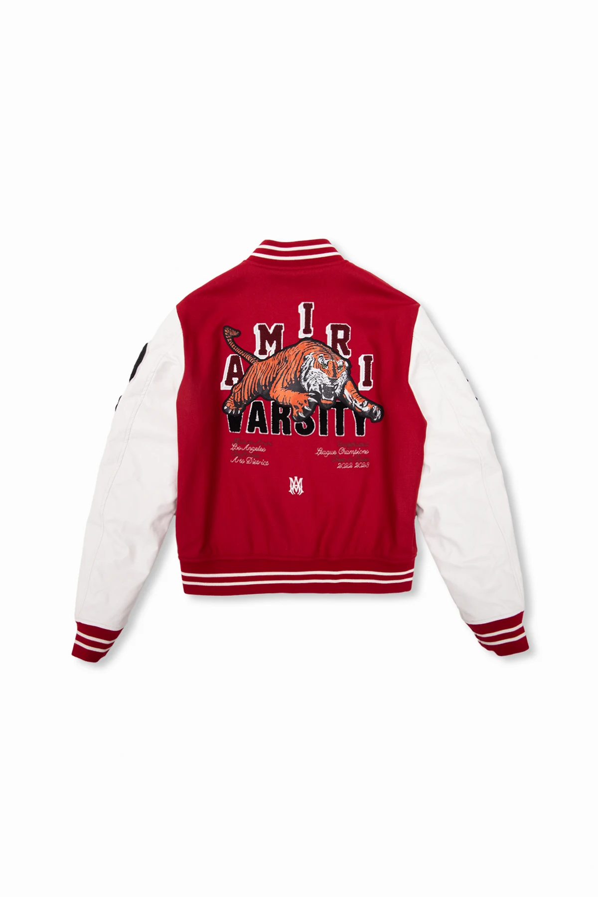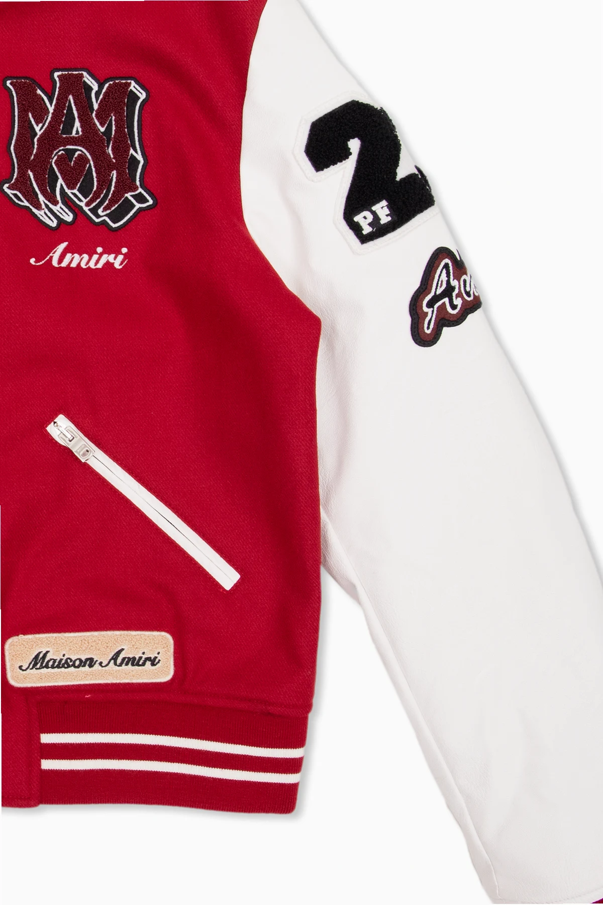Czerwono-biała kurtka typu ‘bomber’ Amiri Kids. Rękawy wykonane z materiału imitującego skórę. Zapinana na zatrzaski. Ozdobiona kolorowymi naszywkami i logo. Dwie kieszenie zapinane na zamek. Dekolt, długie rękawy i dół zakończone ściągaczem.