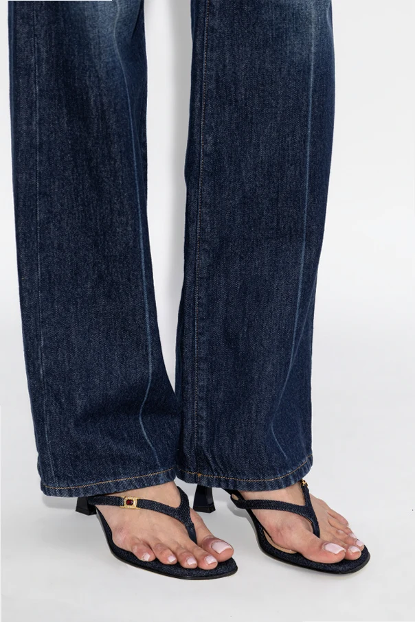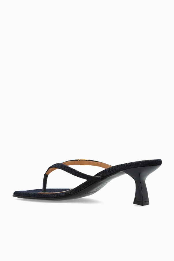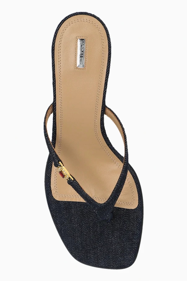 Wierzch wykonano z materiału tekstylnego o strukturze przywodzącej na myśl denim, natomiast wnętrze oraz podeszwa emanują szlachetną gładkością skóry w kolorze beżowym. Pasek w stylu japonek zmysłowo oplata śródstopie, a jego ozdobę stanowi finezyjna, złota aplikacja z kolorowym akcentem, zapewniająca niepowtarzalny charakter.