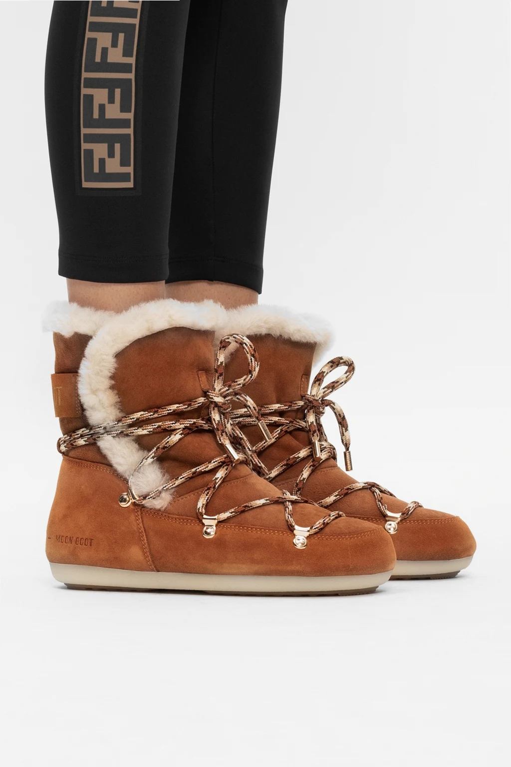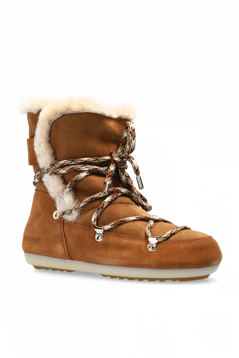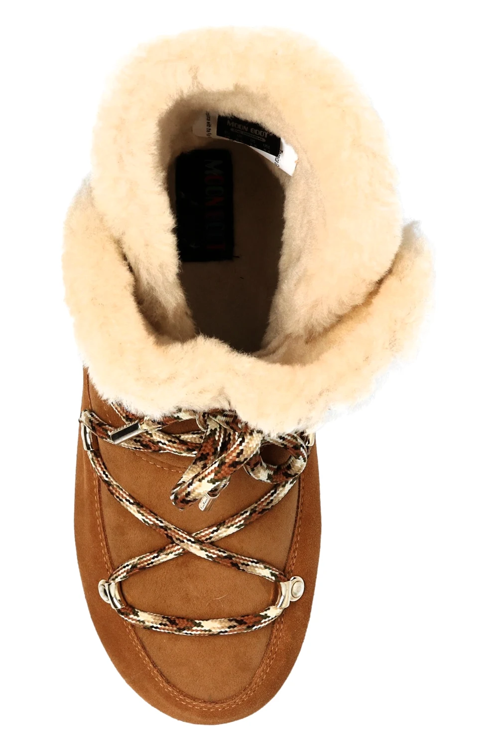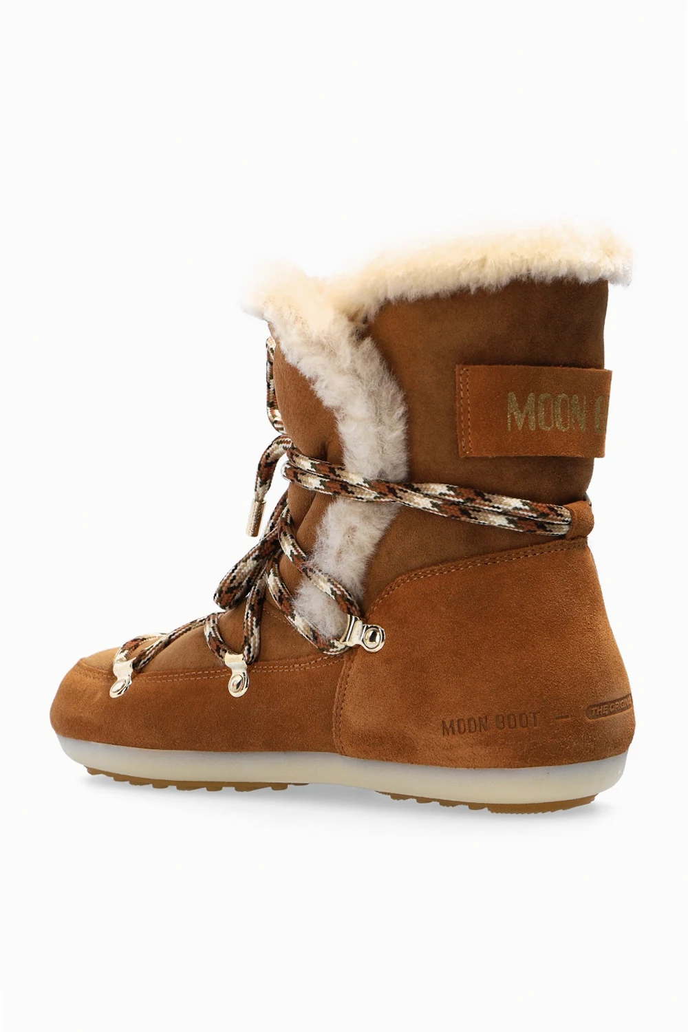 Brązowe, sznurowane śniegowce, model ‘Dark Side High Shearling’ Moon Boot. Ozdobione wytłoczonym logo. Żółta, gumowa podeszwa.