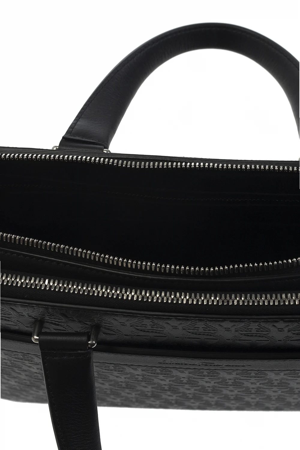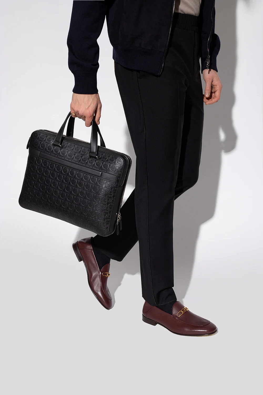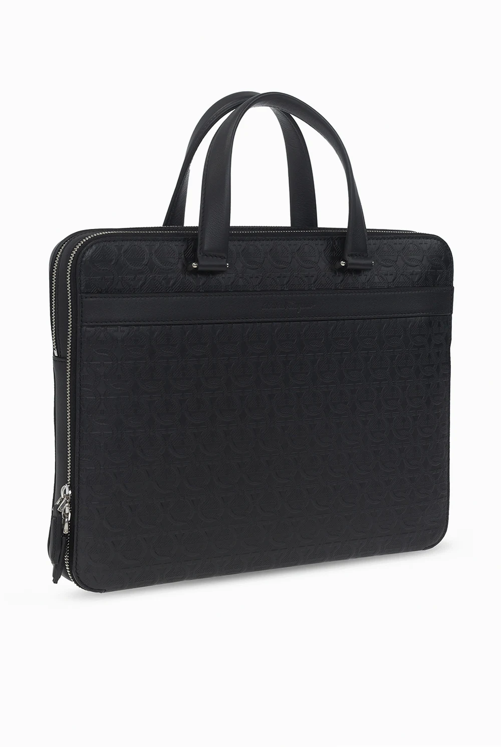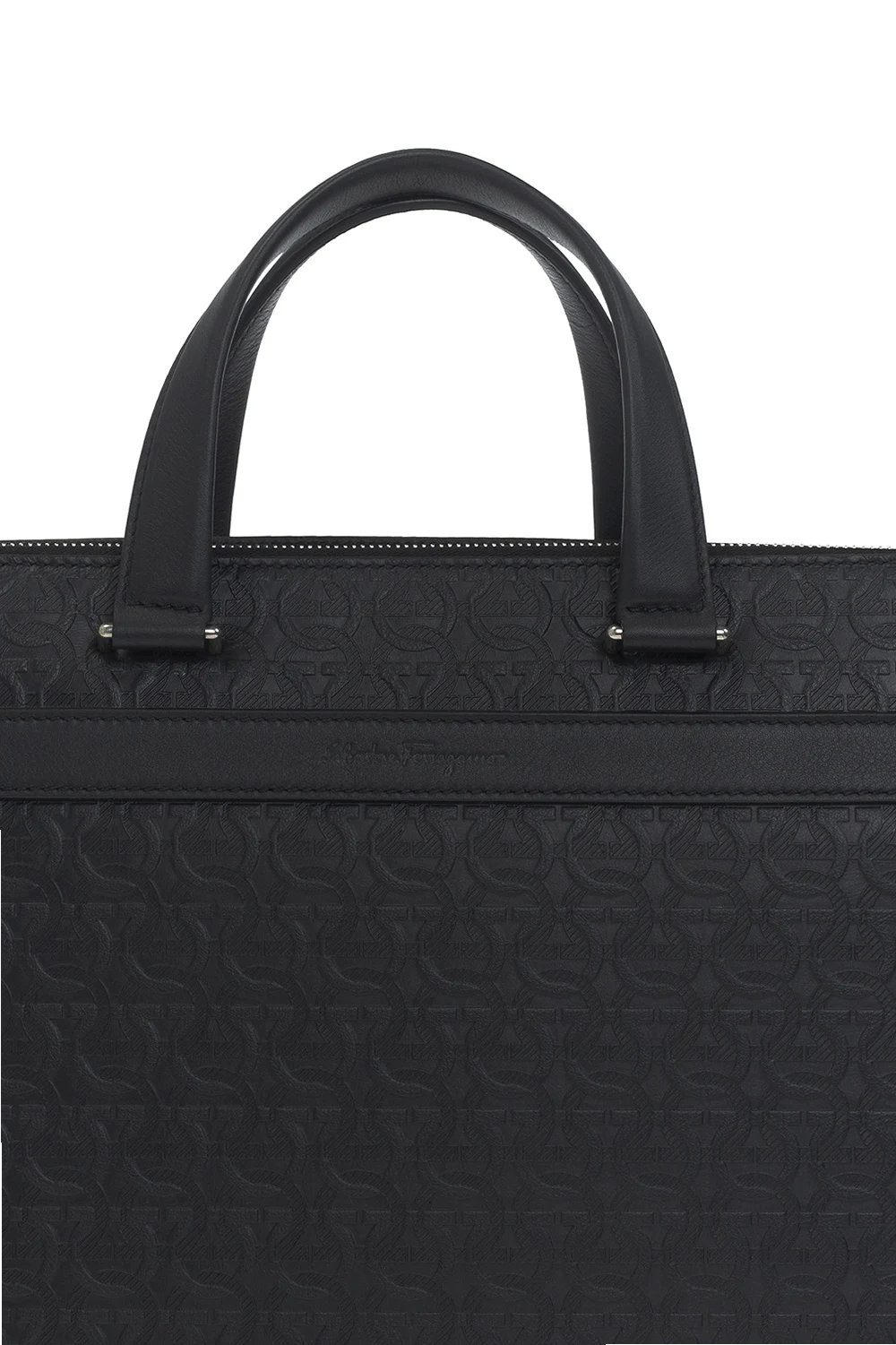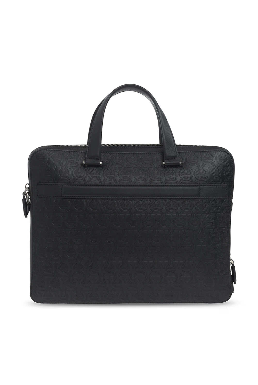 Czarna, skórzana aktówka Salvatore Ferragamo. Zamykana na dwubiegunowe zamki. Ozdobiona wytłoczonym wzorem ‘Gancini’ oraz logo. Z przodu wsuwana kieszeń. Z tyłu uchwyt. Dwie półokrągłe rączki. Dwie komory z pięcioma kieszeniami: czterema wsuwanymi oraz zamykaną na zamek.