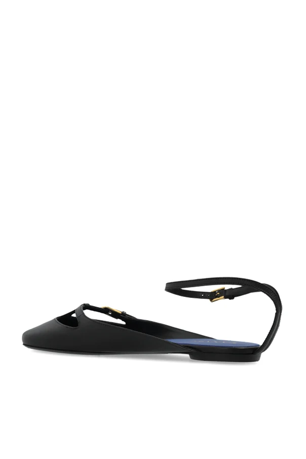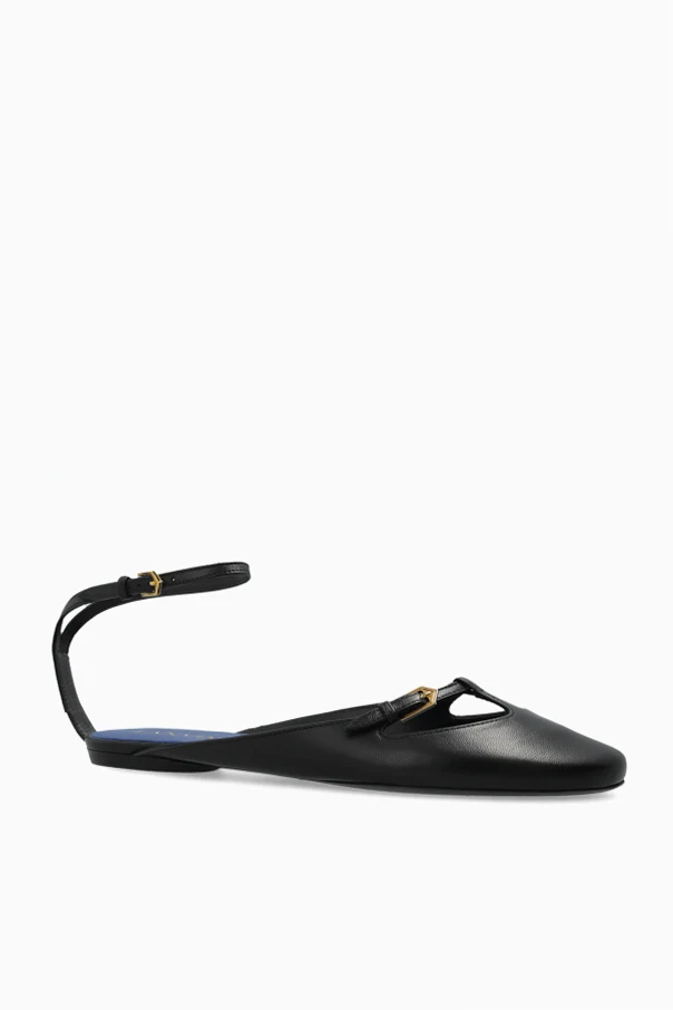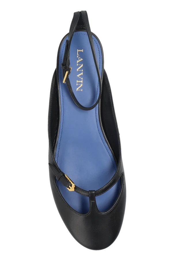 Baleriny Mary-Jane marki Lanvin to kwintesencja wyrafinowania, gdzie czarny kolor nadaje klasycznej sylwetce wyjątkową głębię. Delikatnie wydłużony, zwężany nosek oraz minimalistyczna forma bez zbędnych zdobień podkreślają szlachetny charakter obuwia. Ozdobne, cienkie paski wokół kostki i nad śródstopiem, wyposażone w subtelne złote sprzączki, czynią model nietuzinkowym ukłonem w stronę stylu retro, zachowując przy tym współczesną lekkość.