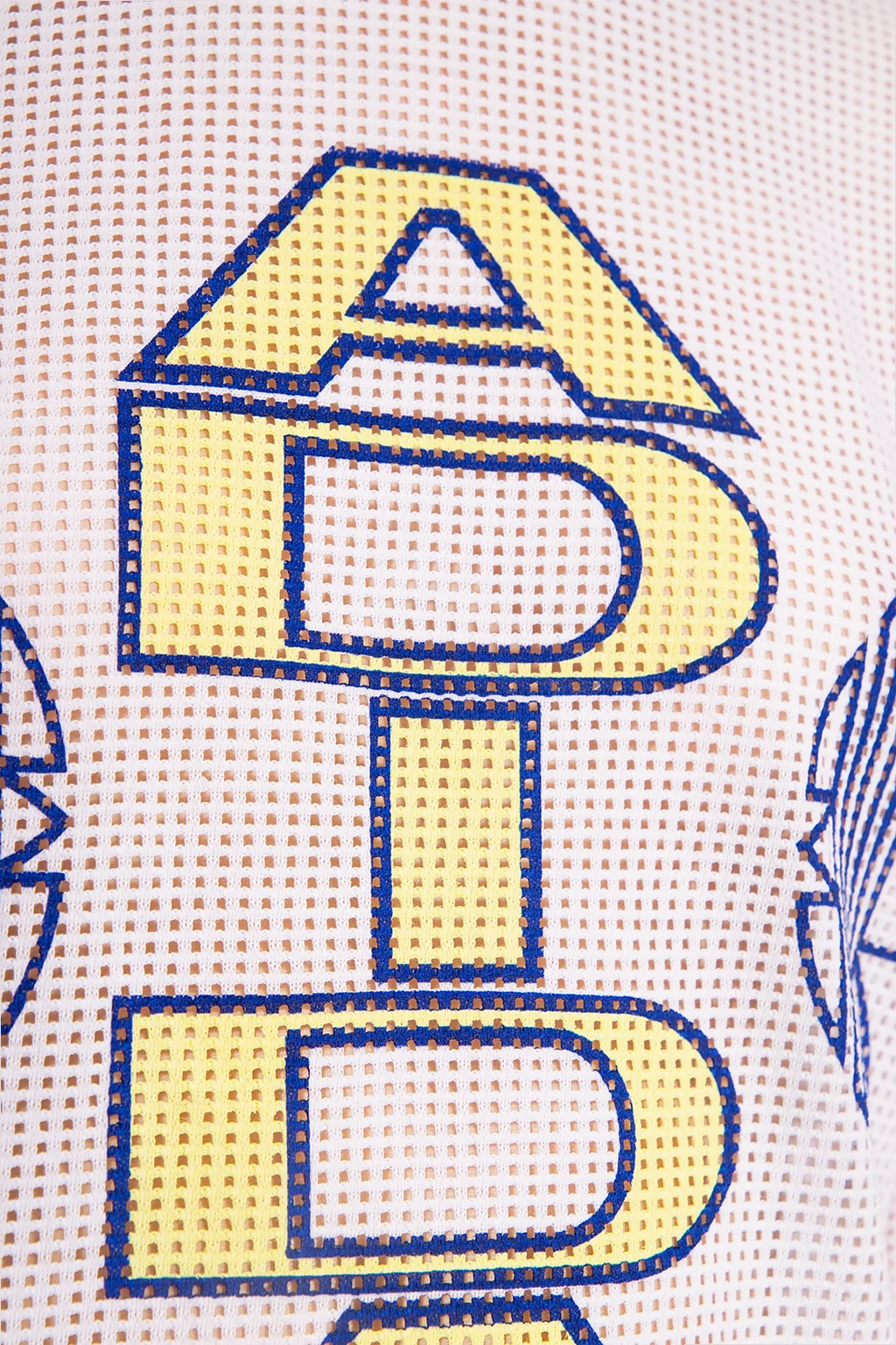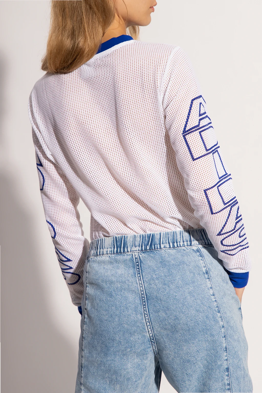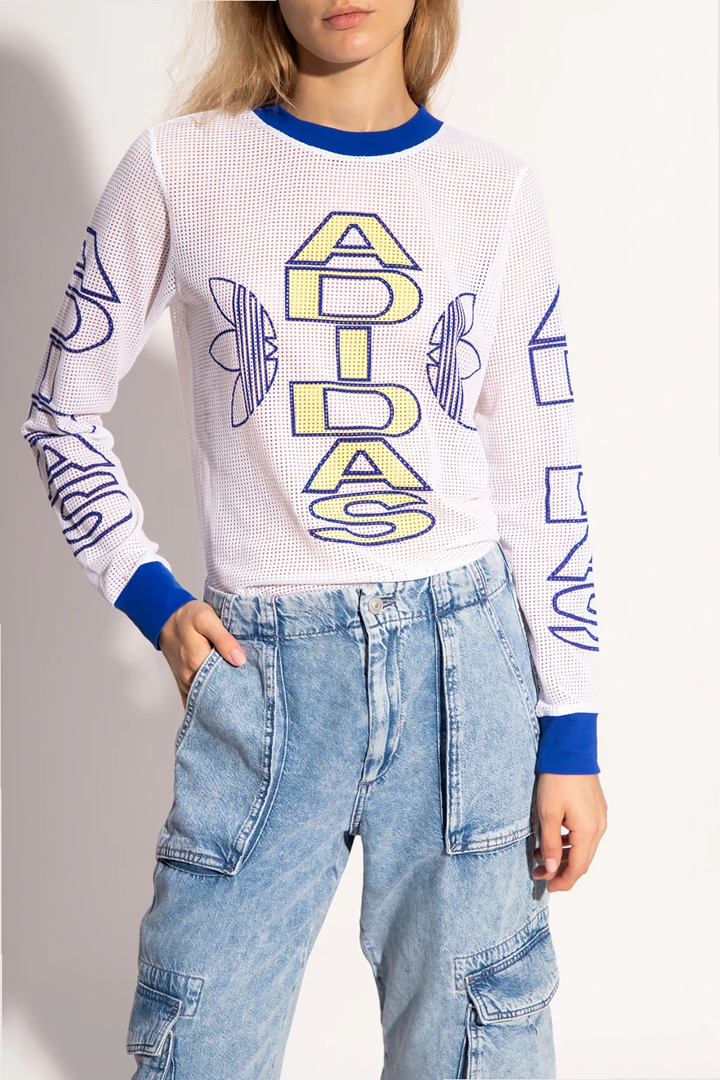 Biały t-shirt z długimi rękawami ADIDAS Originals. Wykonany z materiału o strukturze siatki pochodzącego z recyklingu. Nadrukowane logo w kolorze ciemnoniebiesko-żółtym. Okrągły dekolt. Rękawy zakończone ściągaczami.