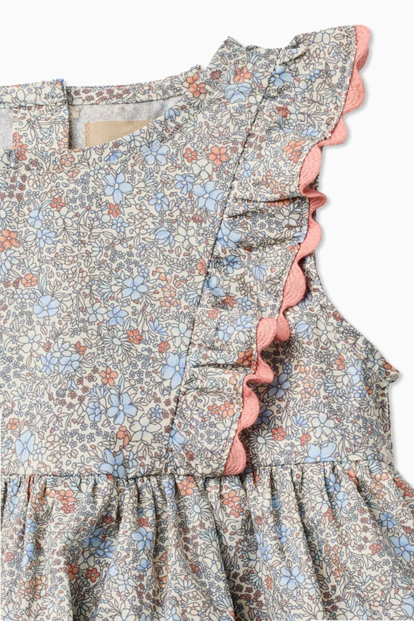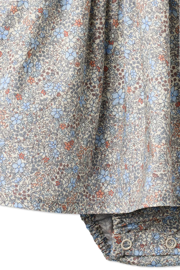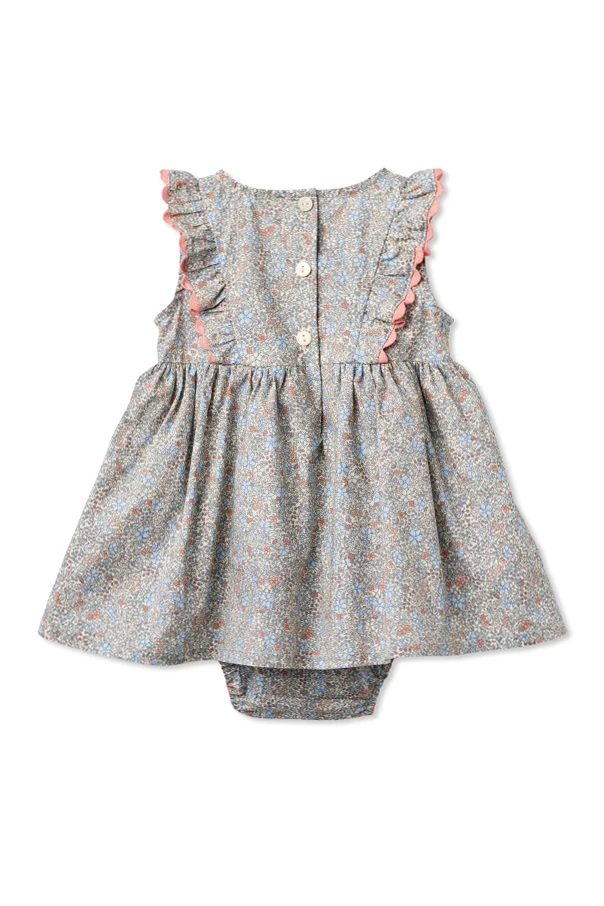 Tkanina sukienki została pokryta drobnym, kwiatowym wzorem w pastelowych odcieniach błękitu, szarości oraz subtelnego różu. Materiał bawełniany zapewnia niezwykłą lekkość i przewiewność, stanowiąc wymarzoną propozycję na ciepłe dni. Z tyłu sukienkę zapinają jasne guziki. Zestaw uzupełniają dopasowane majtki typu bloomers w szarym kolorze, zapinane na praktyczne zatrzaski.