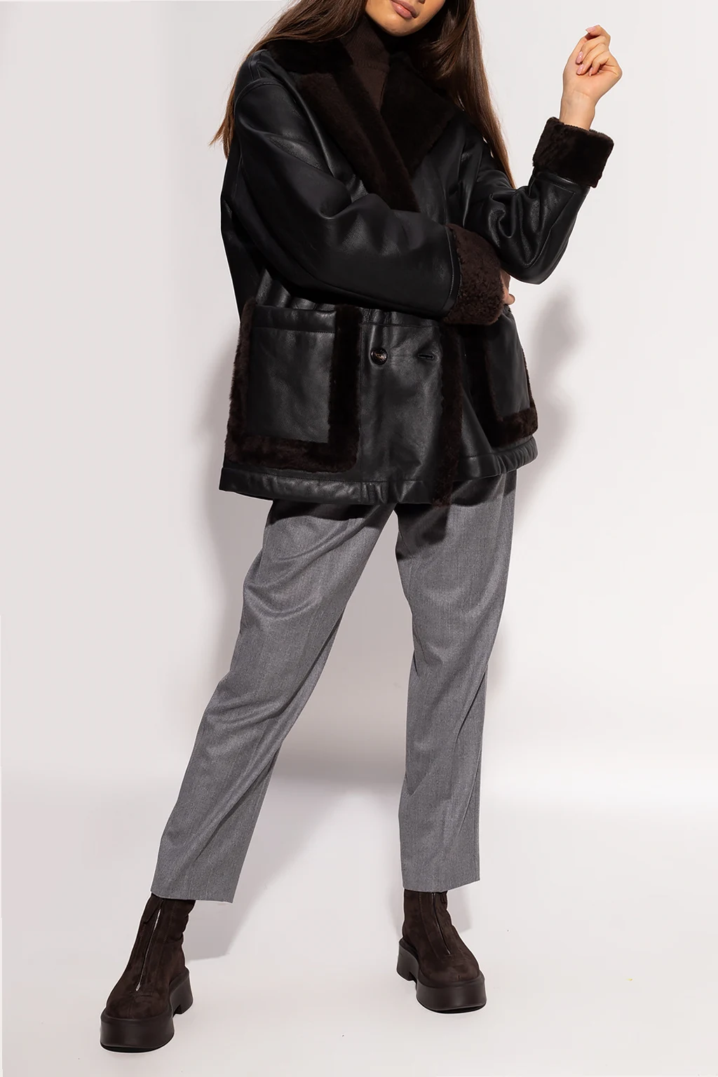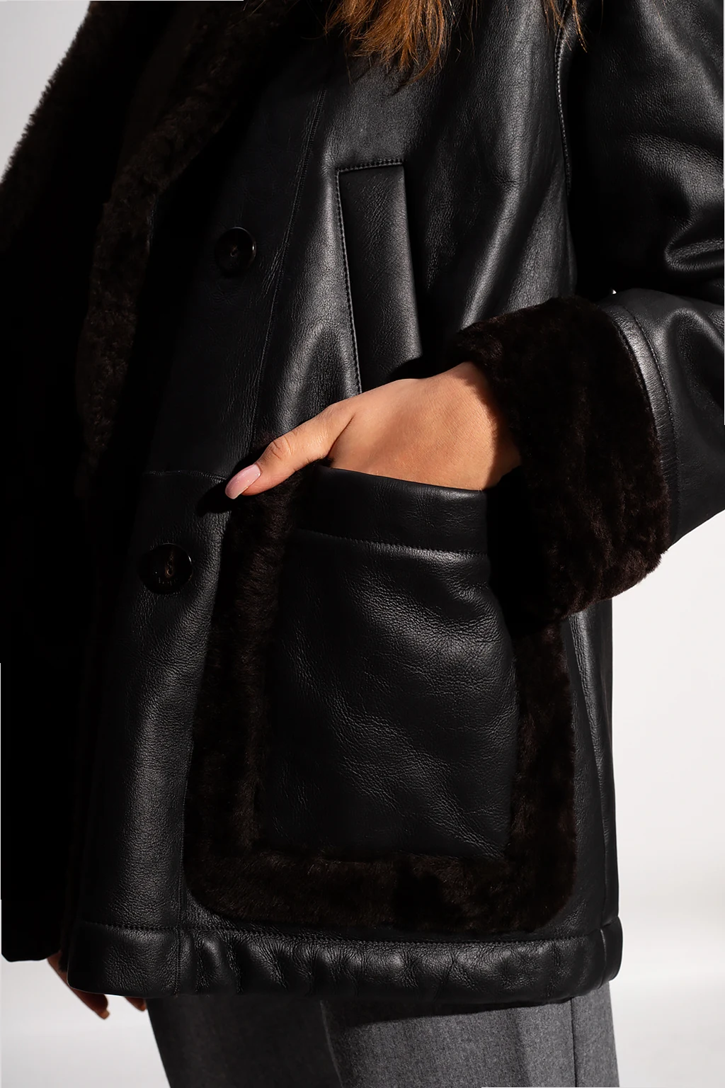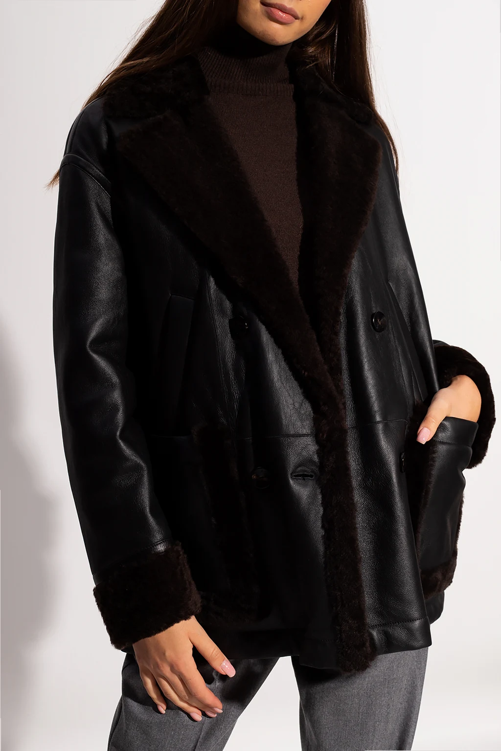 Czarna kurtka Agnona. Wykonana ze skóry jagnięcej. Wykończona futrem. Zapinana na dwurzędowe guziki. Cztery wsuwane kieszenie.