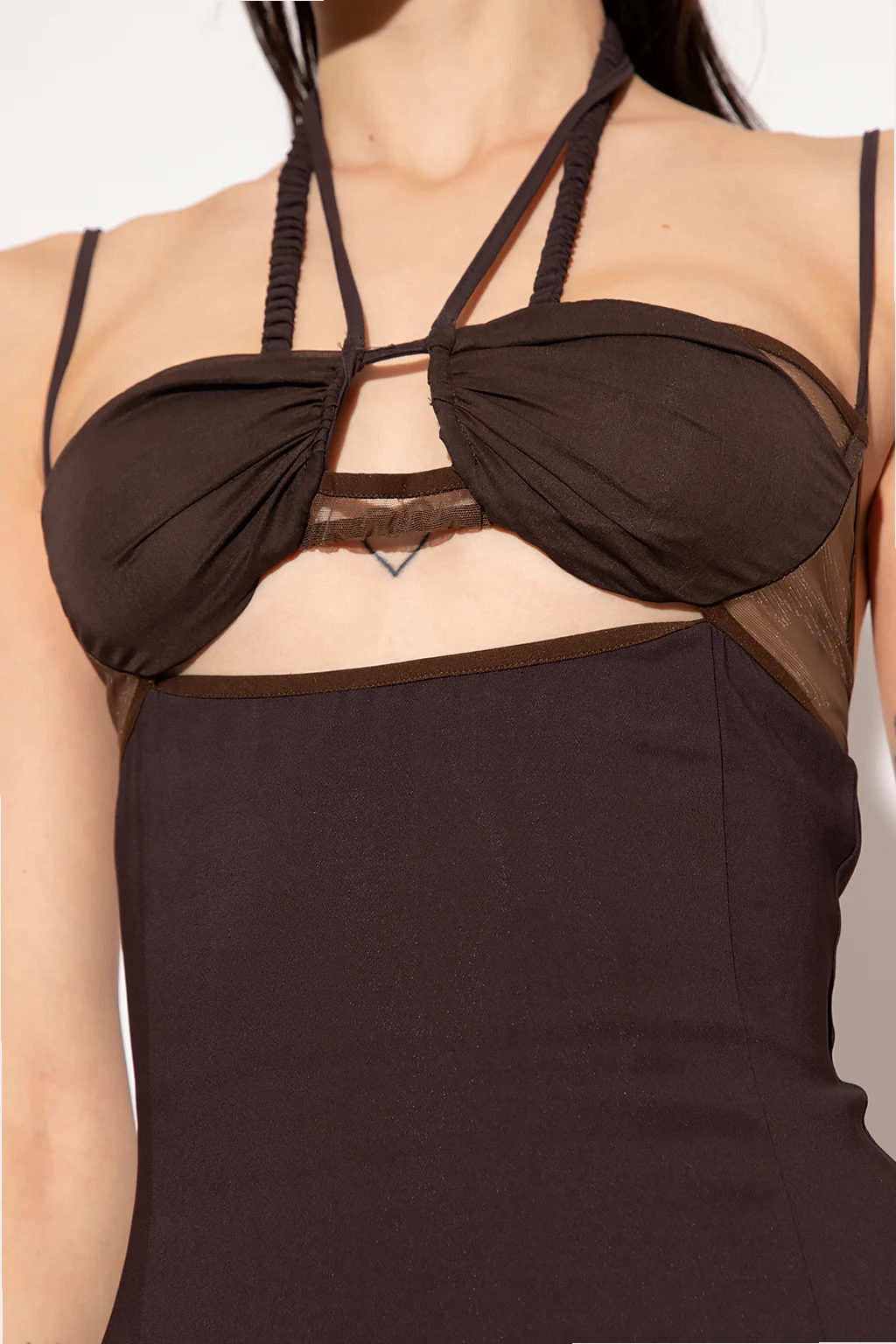 Brązowa sukienka Nensi Dojaka. Wykonana z wiskozy i jedwabiu. Z tyłu kryty zamek oraz pasek zapinany na haftkę. Regulowane ramiączka oraz pasek na szyję. Transparentne wstawki. Dekoracyjne wycięcia.