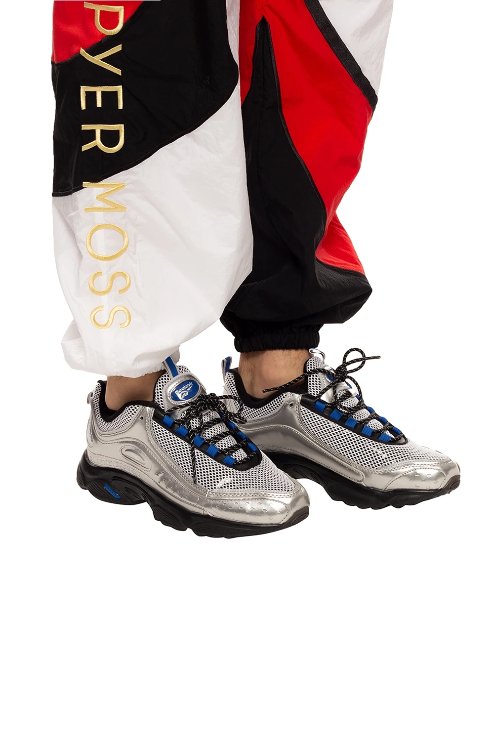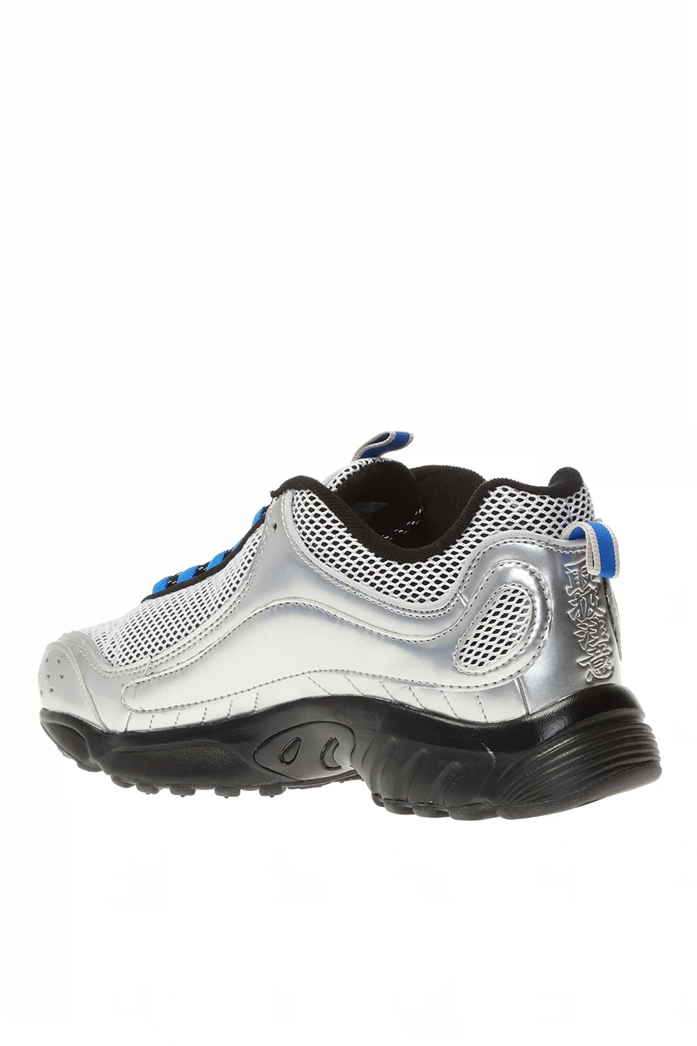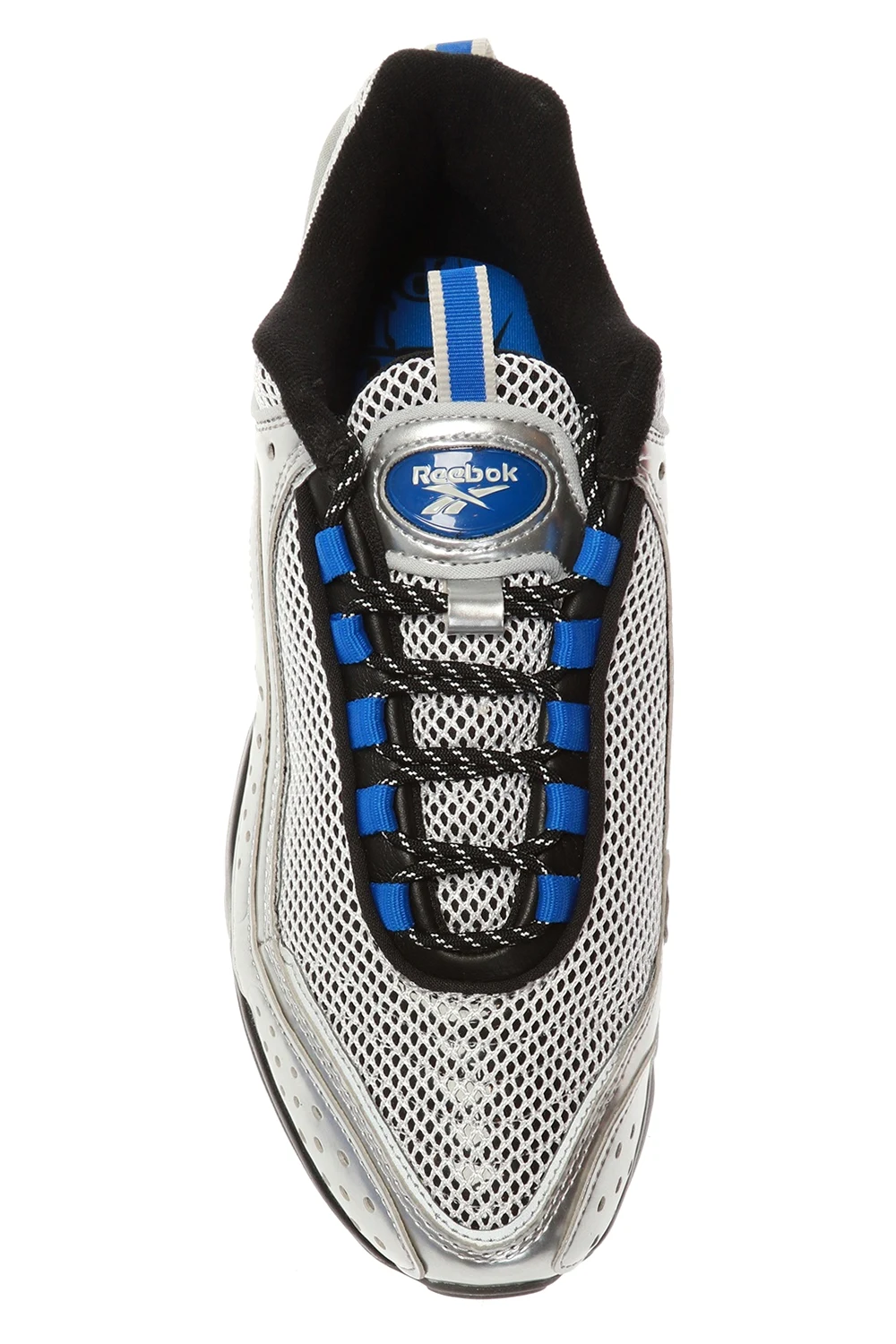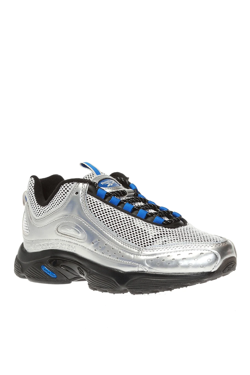 Sznurowane buty sportowe w kolorze srebrno-czarno-niebieskim, model ‘Daytona DMX II’ Reebok. Z przodu i z boku logo. Czarna, gumowa podeszwa.