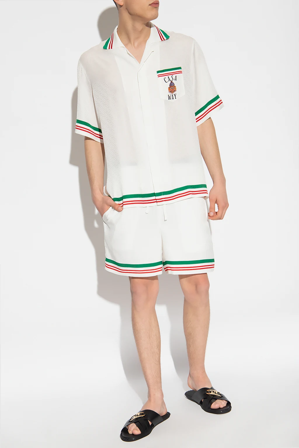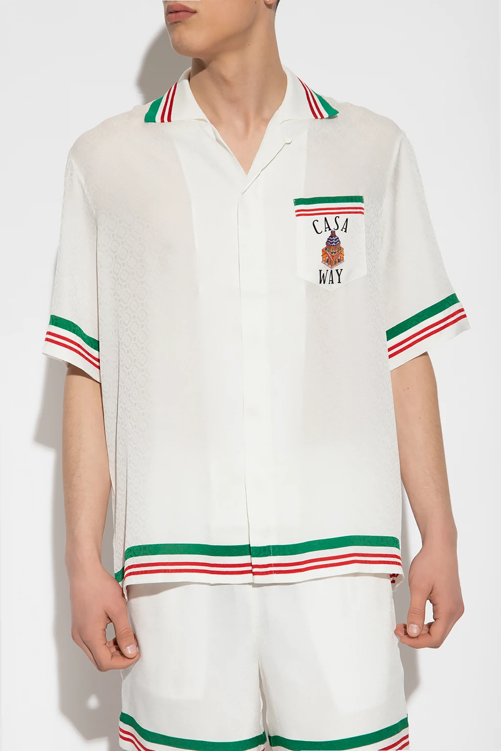 Biała koszula, model 'Casa Way' Casablanca. Wykonana z jedwabiu. Zapinana na guziki. Ozdobiona żakardowym wzorem z monogramem oraz kolorowym wzorem z logo. Krótkie rękawy.