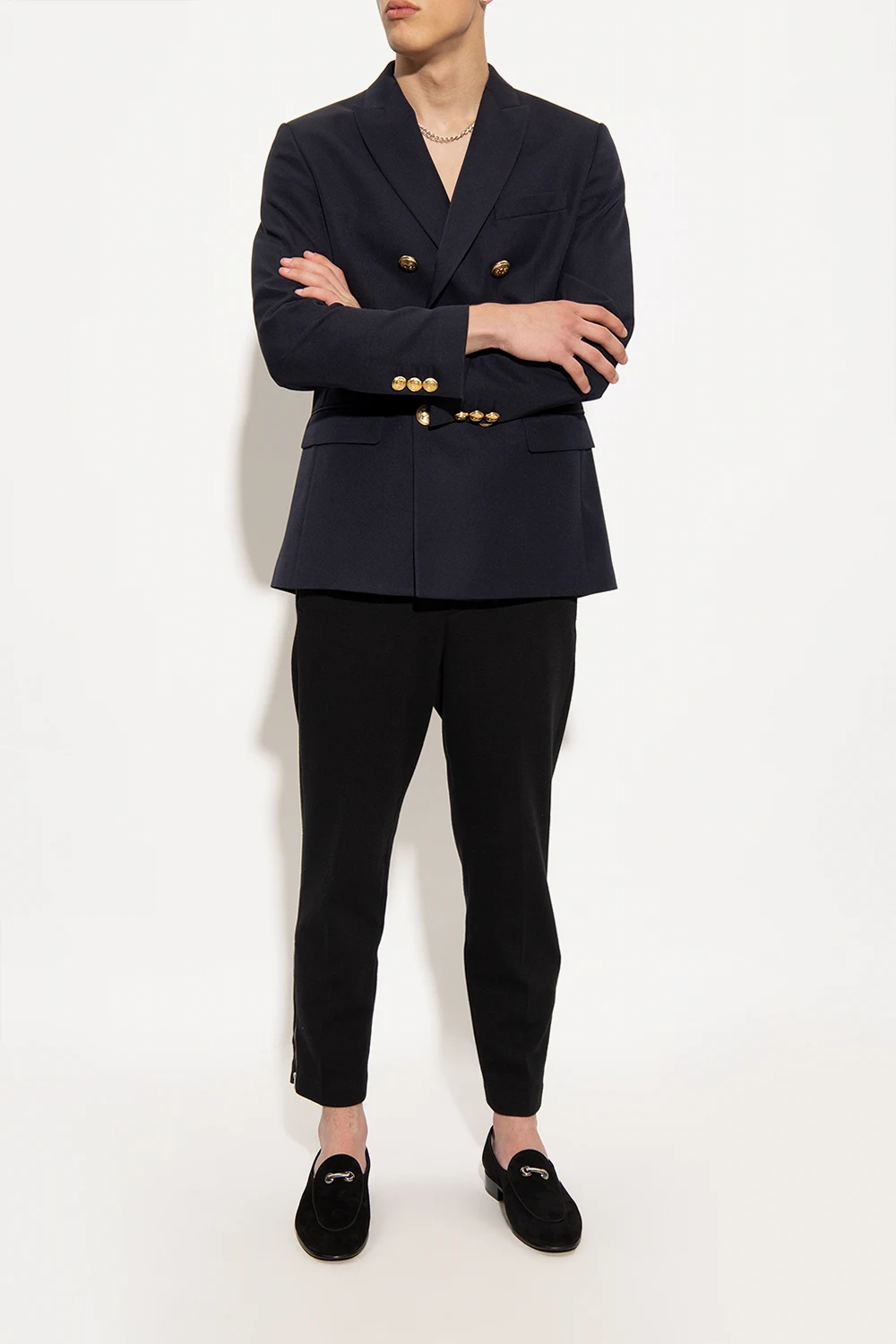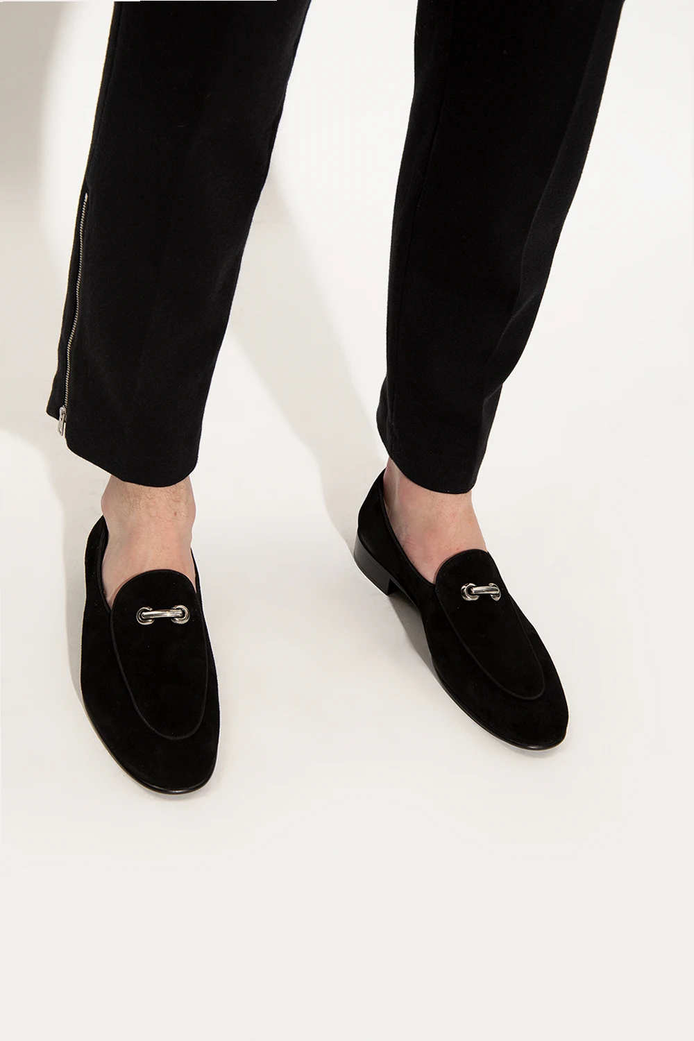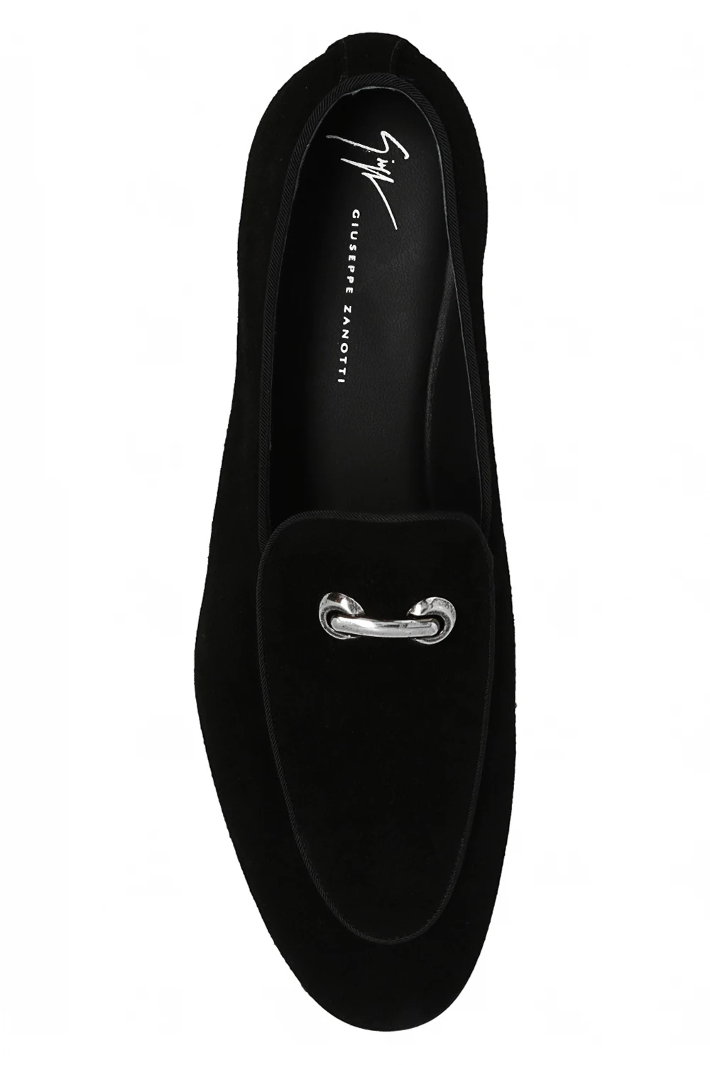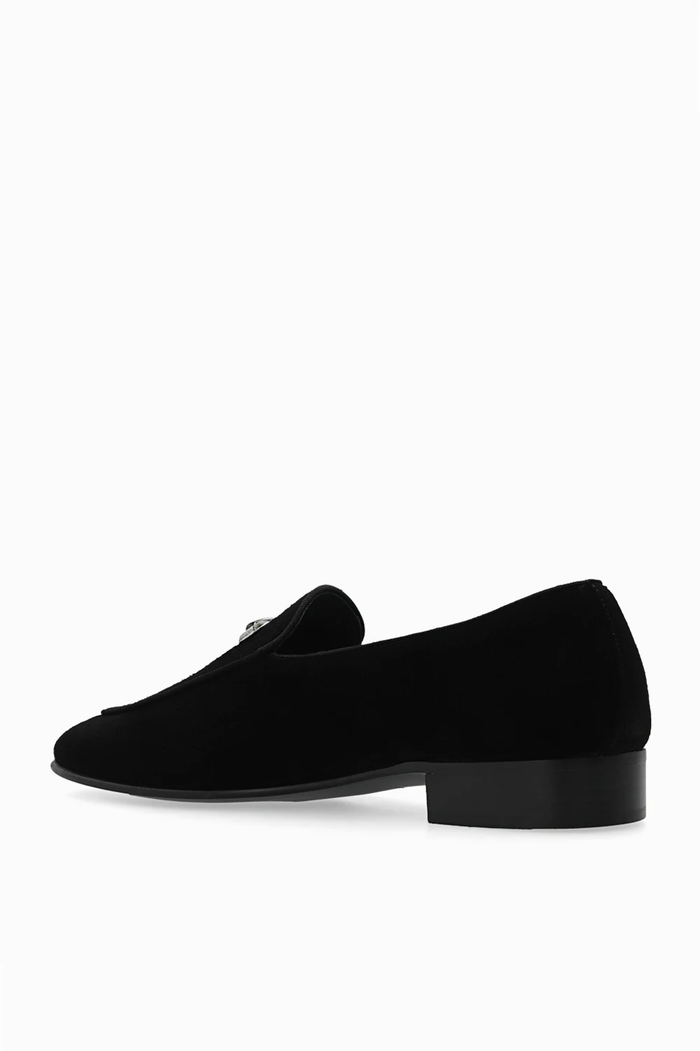 Czarne buty typu ‘loafers’, model ‘Archibald’ Giuseppe Zanotti. Wykonane z zamszu. Z przodu ozdobione metalową aplikacją w kolorze postarzanego srebra. Czarna, skórzana podeszwa.