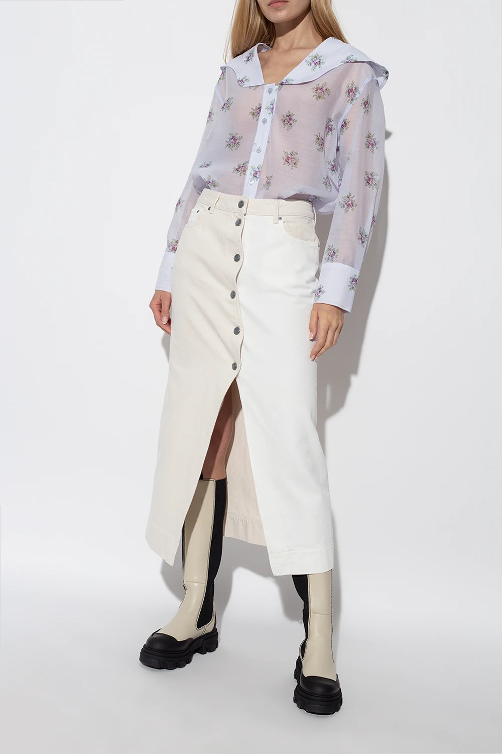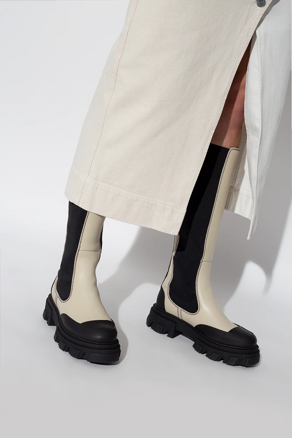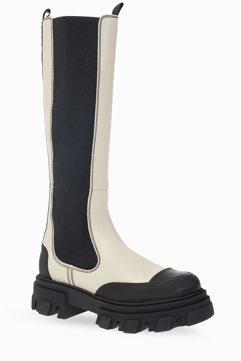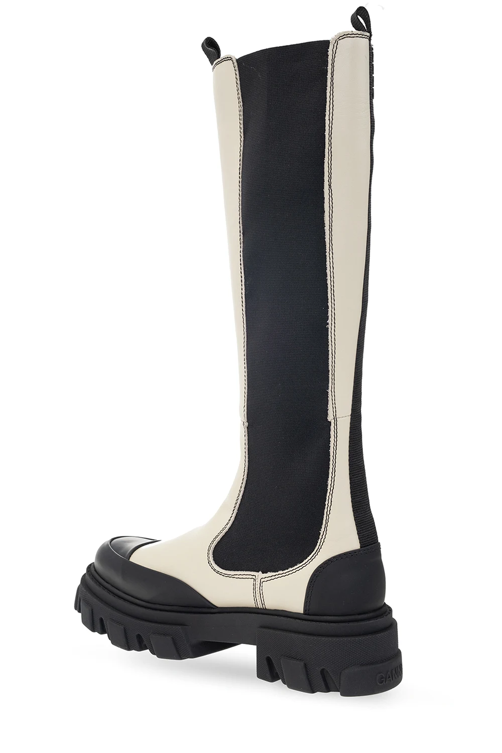 Kremowo-czarne, sznurowane buty pod kolano Ganni. Wykonane ze skóry i materiału. Z tyłu czarne logo. Czarna, gumowa podeszwa.