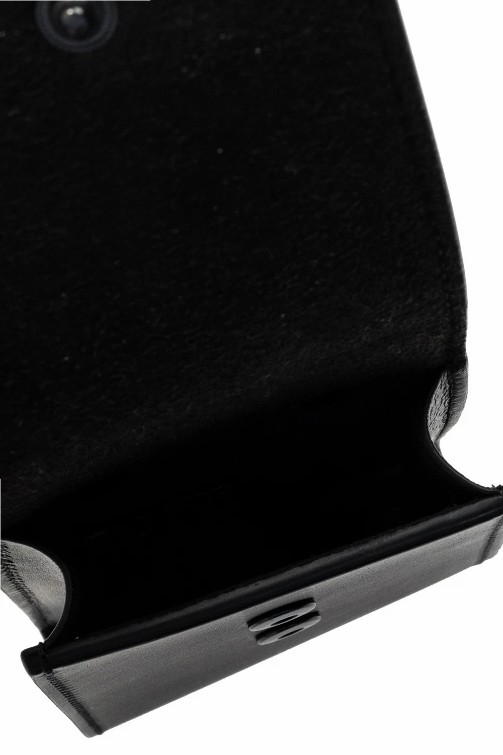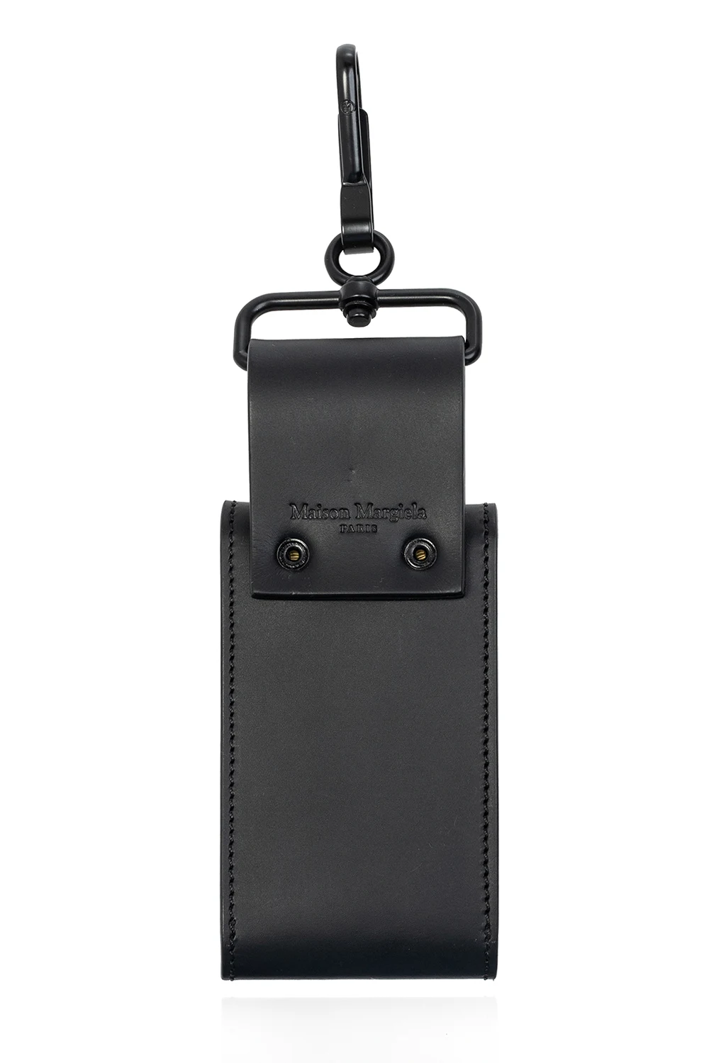 Czarne, skórzane etui na środek dezynfekujący Maison Margiela. Zamykane na zatrzask. Ozdobione wytłoczonym logo. Dołączony karabińczyk. Wewnątrz komora.