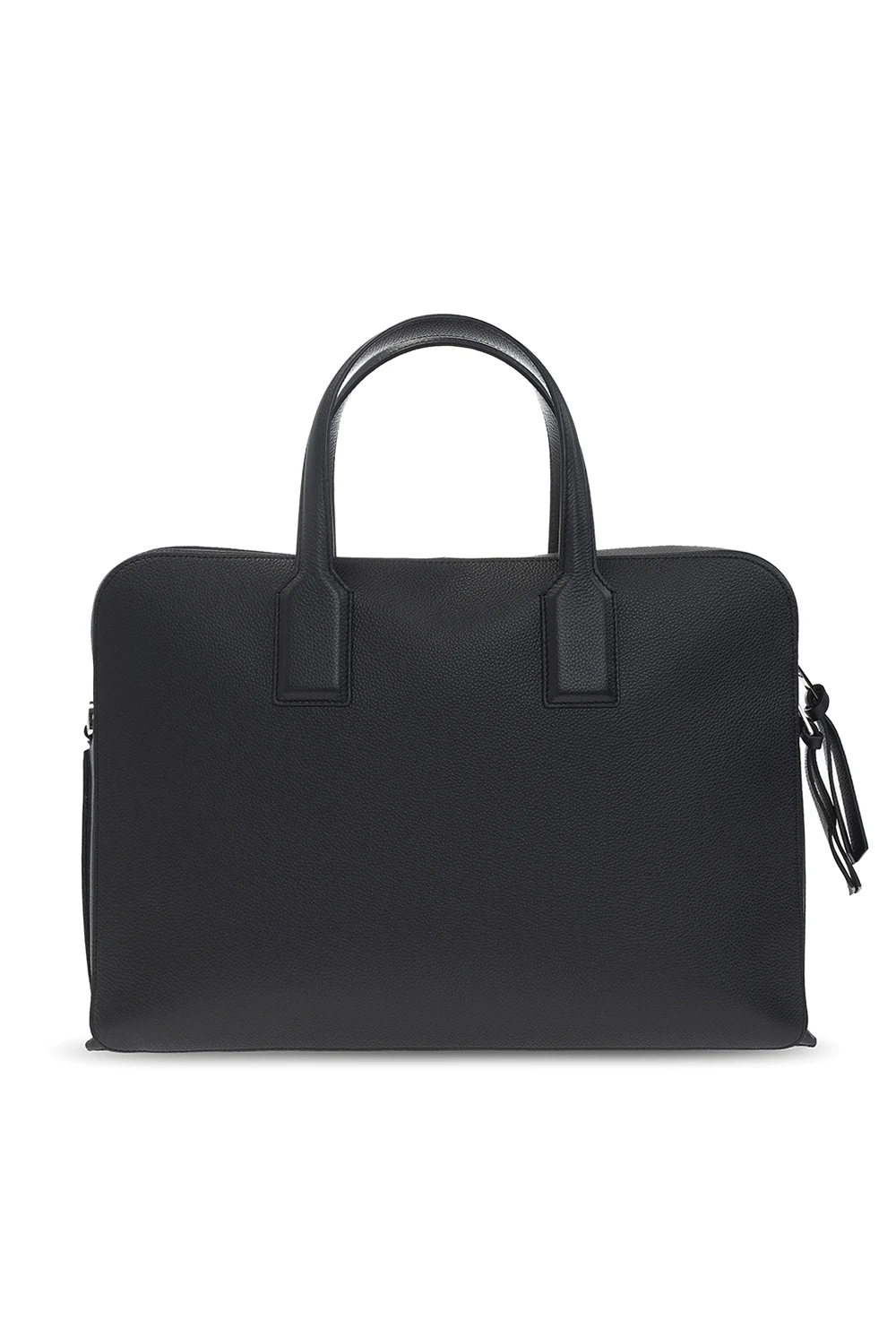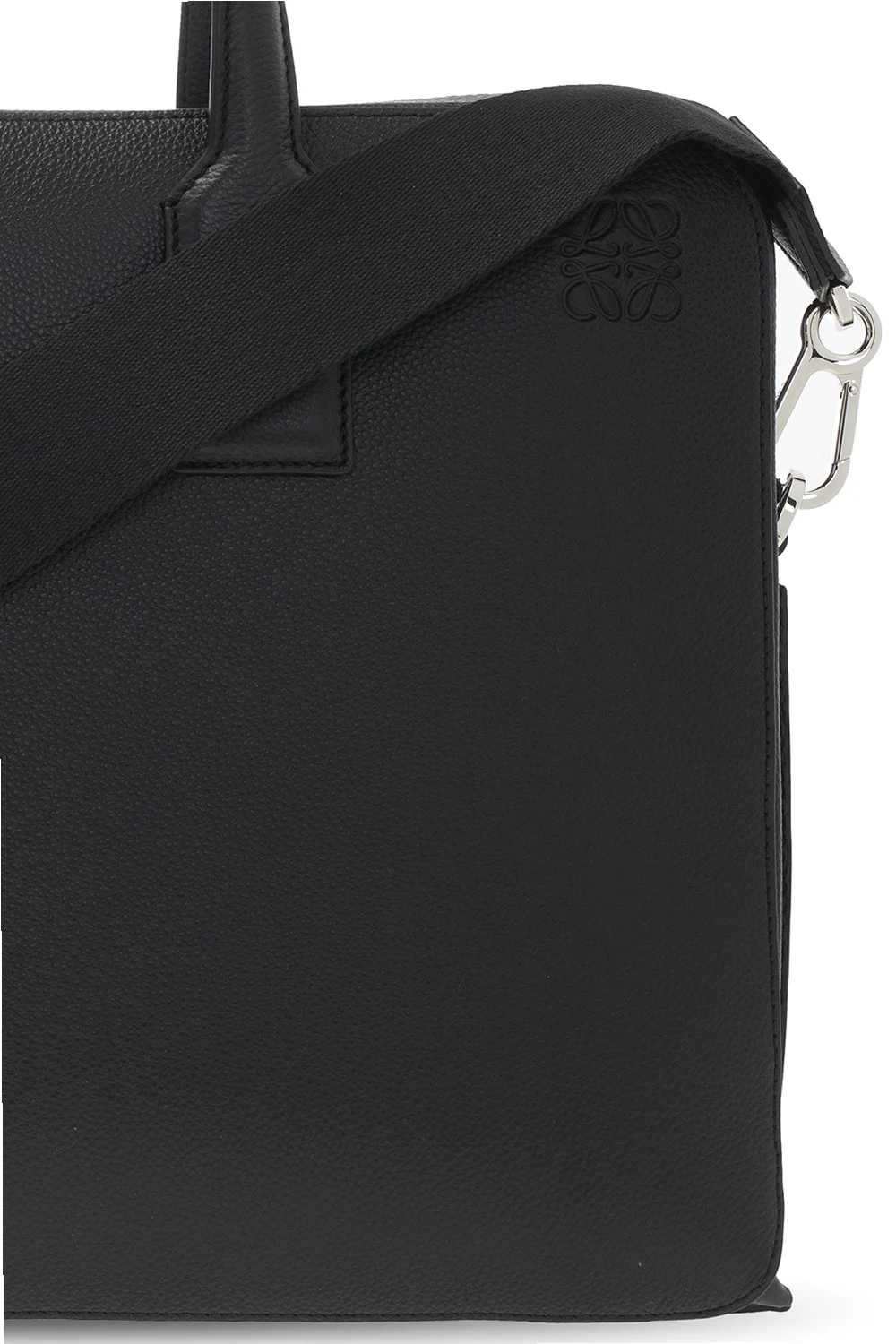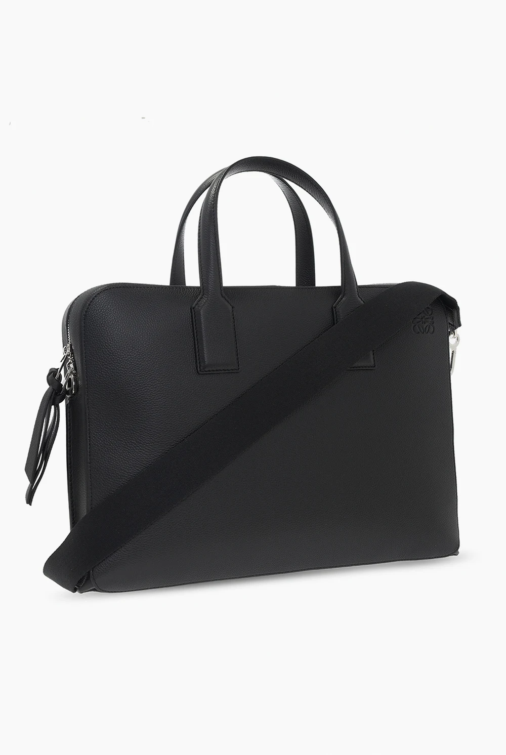 Czarna aktówka, model ‘Goya’ Loewe. Wykonana ze skóry cielęcej. Zamykana na dwubiegunowy zamek. Ozdobiona wytłoczonym logo. Dwie półokrągłe rączki. Odpinany pas na ramię. Wewnątrz komora i cztery kieszenie: trzy wsuwane oraz zapinana na zamek. Metalowe wykończenie w kolorze srebrnym.
