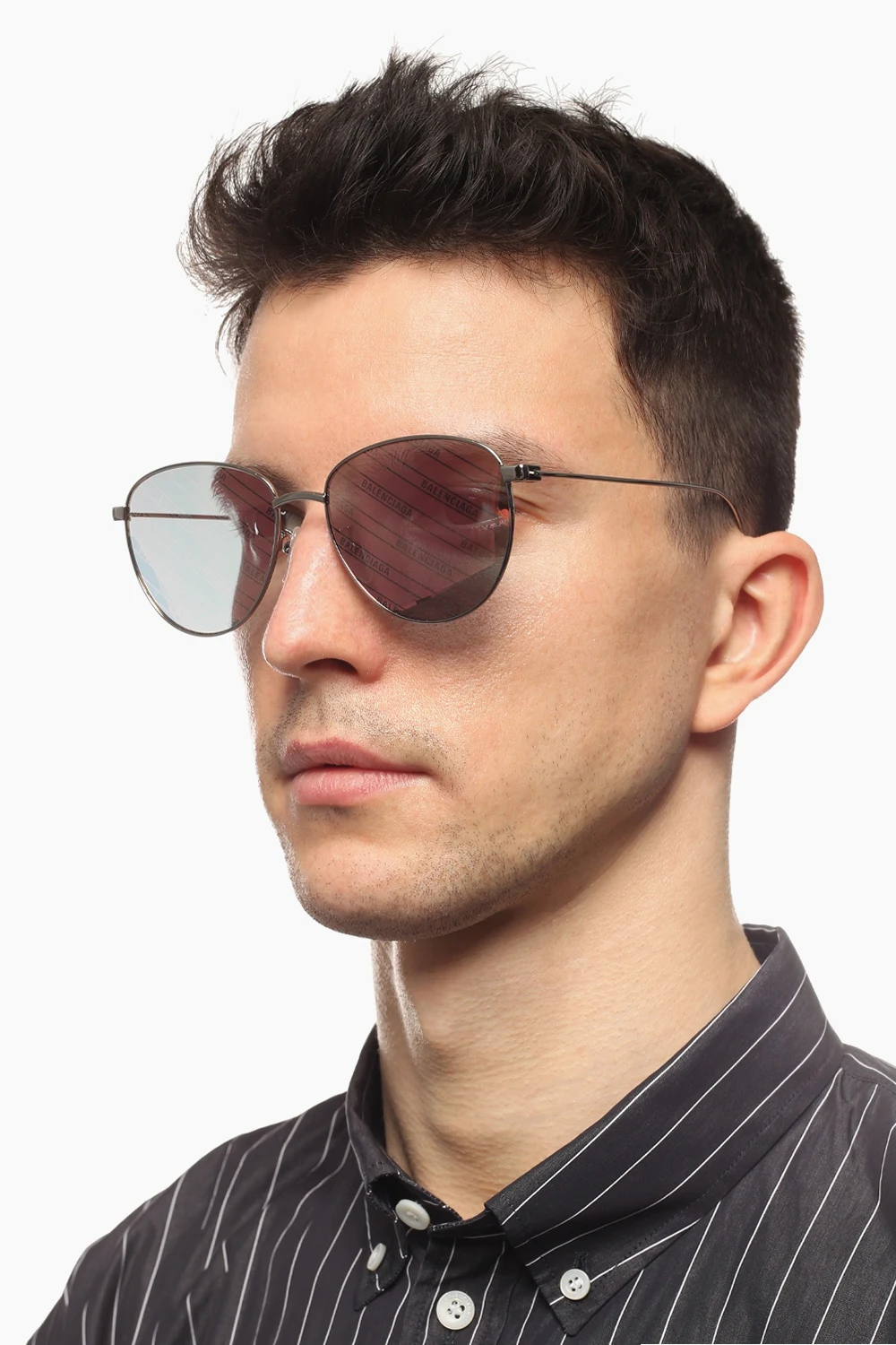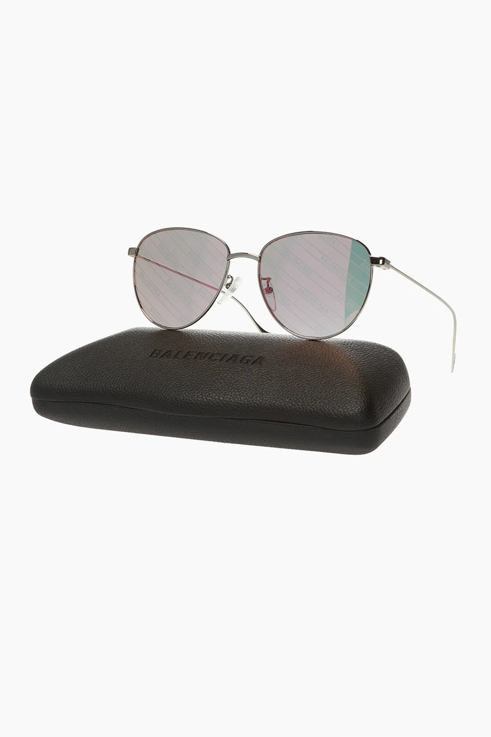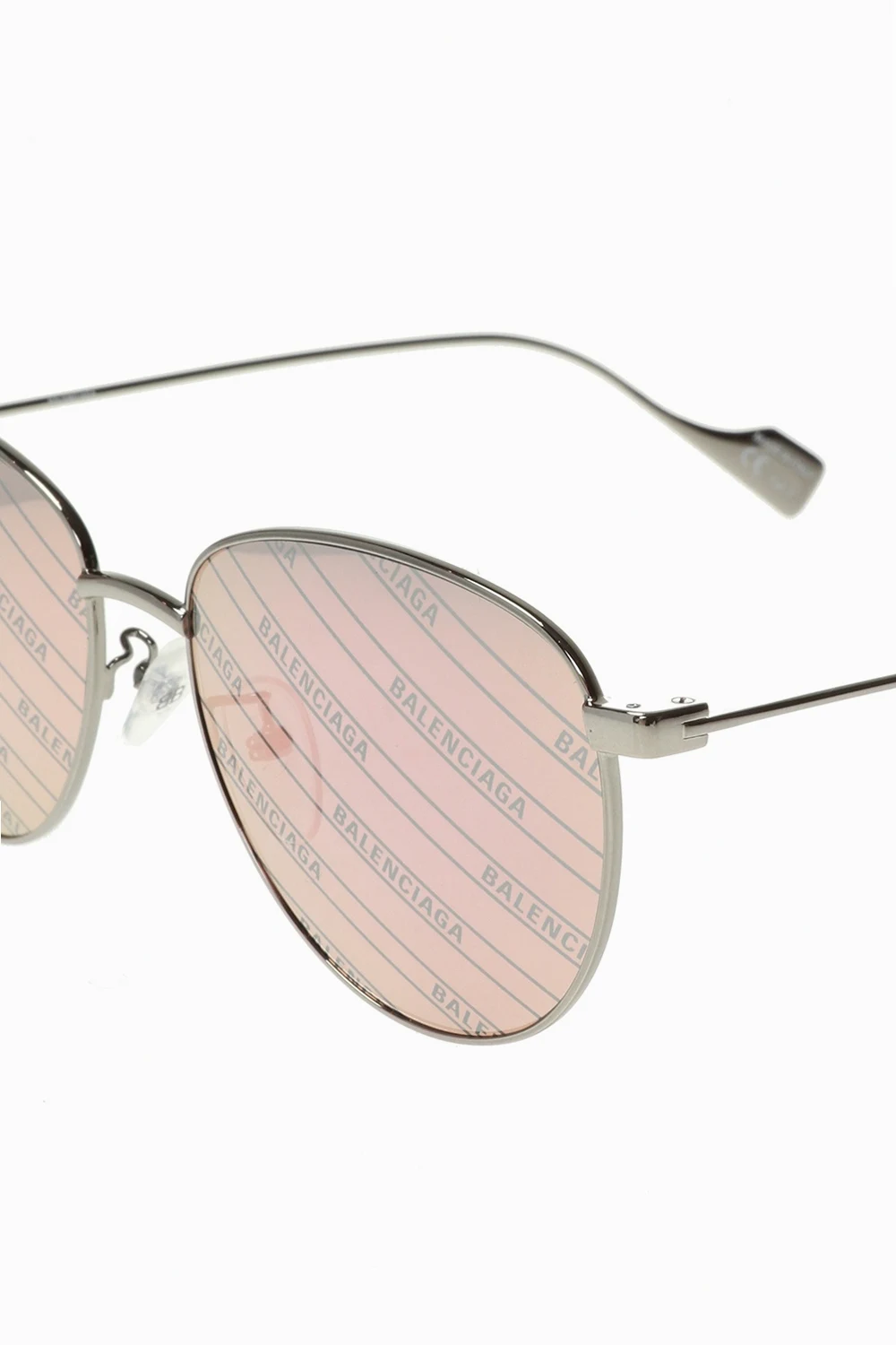 Okulary przeciwsłoneczne w kolorze srebrnym Balenciaga. Dekoracyjne zauszniki. Różowe certyfikowane soczewki UVA/UVB ozdobione wzorem z logo.