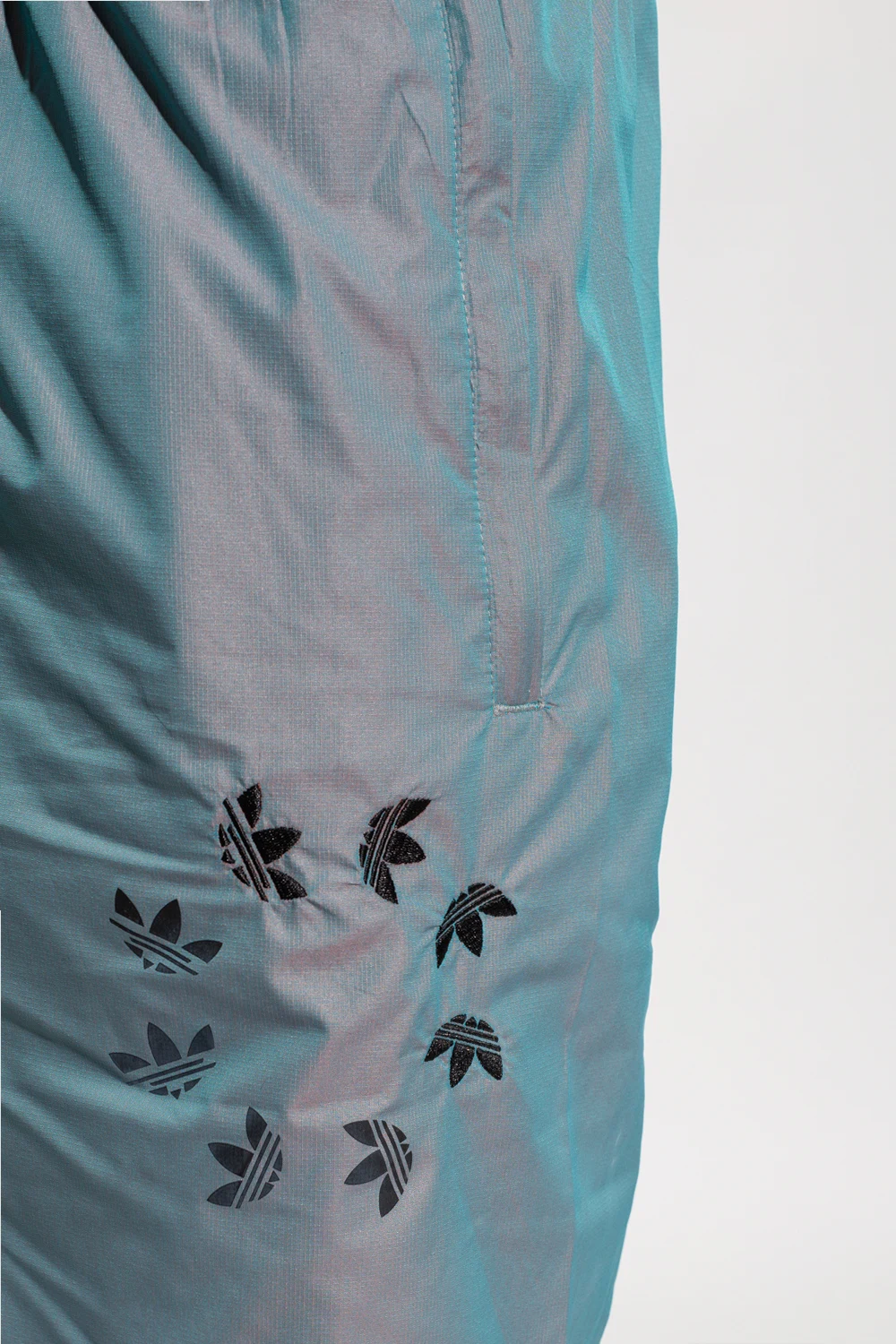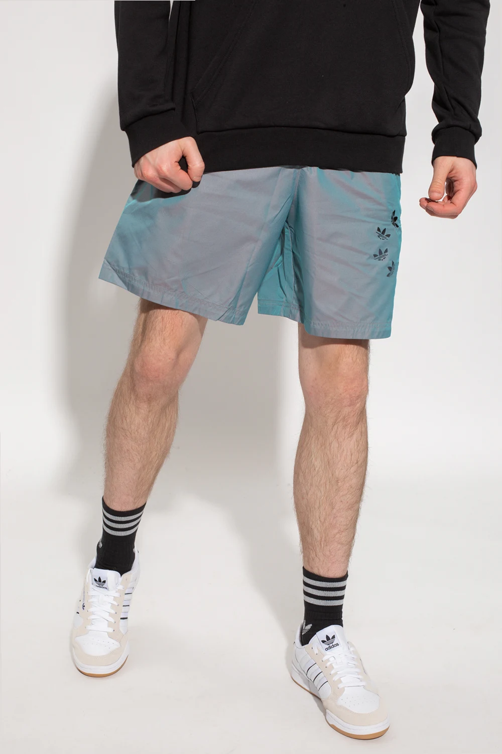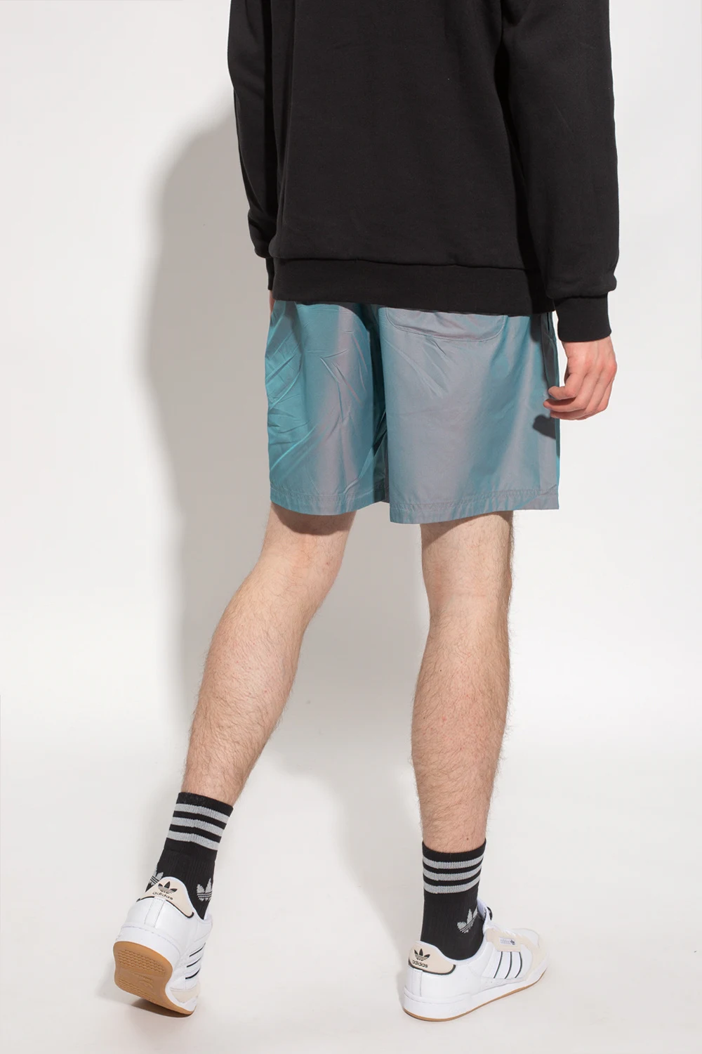Niebiesko-fioletowo-szare szorty ADIDAS Originals, kolekcja ‘Primegreen’. W pasie wszyta guma ściągana trokami. Ozdobione nadrukiem z logo w kolorze czarnym. Trzy kieszenie: dwie zapinane na zamek oraz wsuwana.
